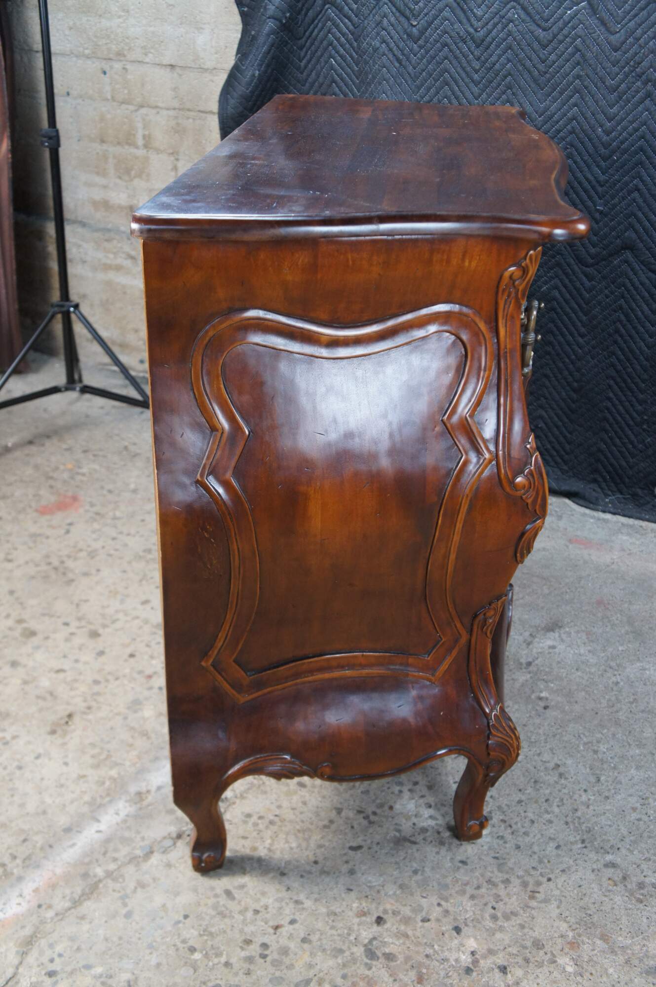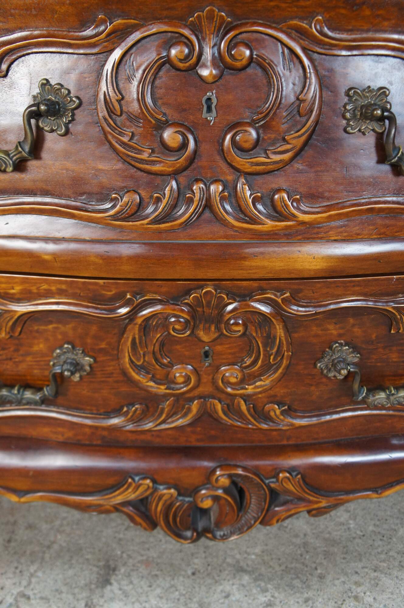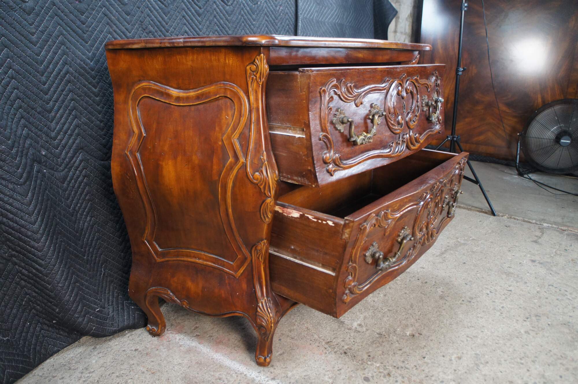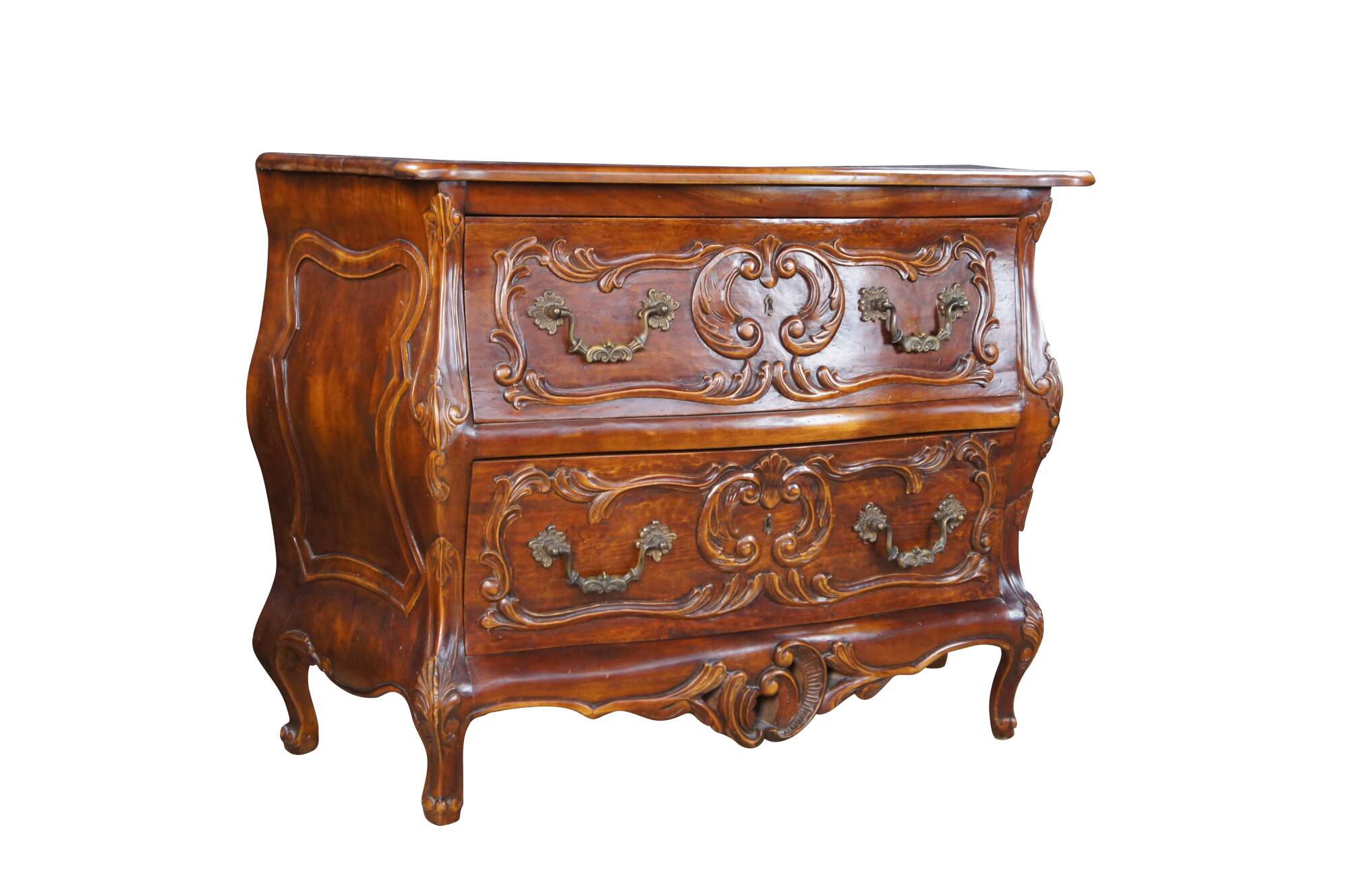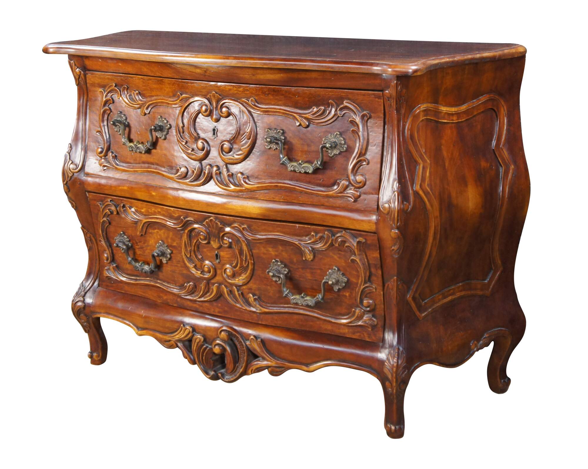 Vintage French Provincial / Louis XV style cherry bombe chest / commode / chest of drawers / console featuring a planked top with two large drawers and carved acanthus accents. Attributed to Century Furniture Company.