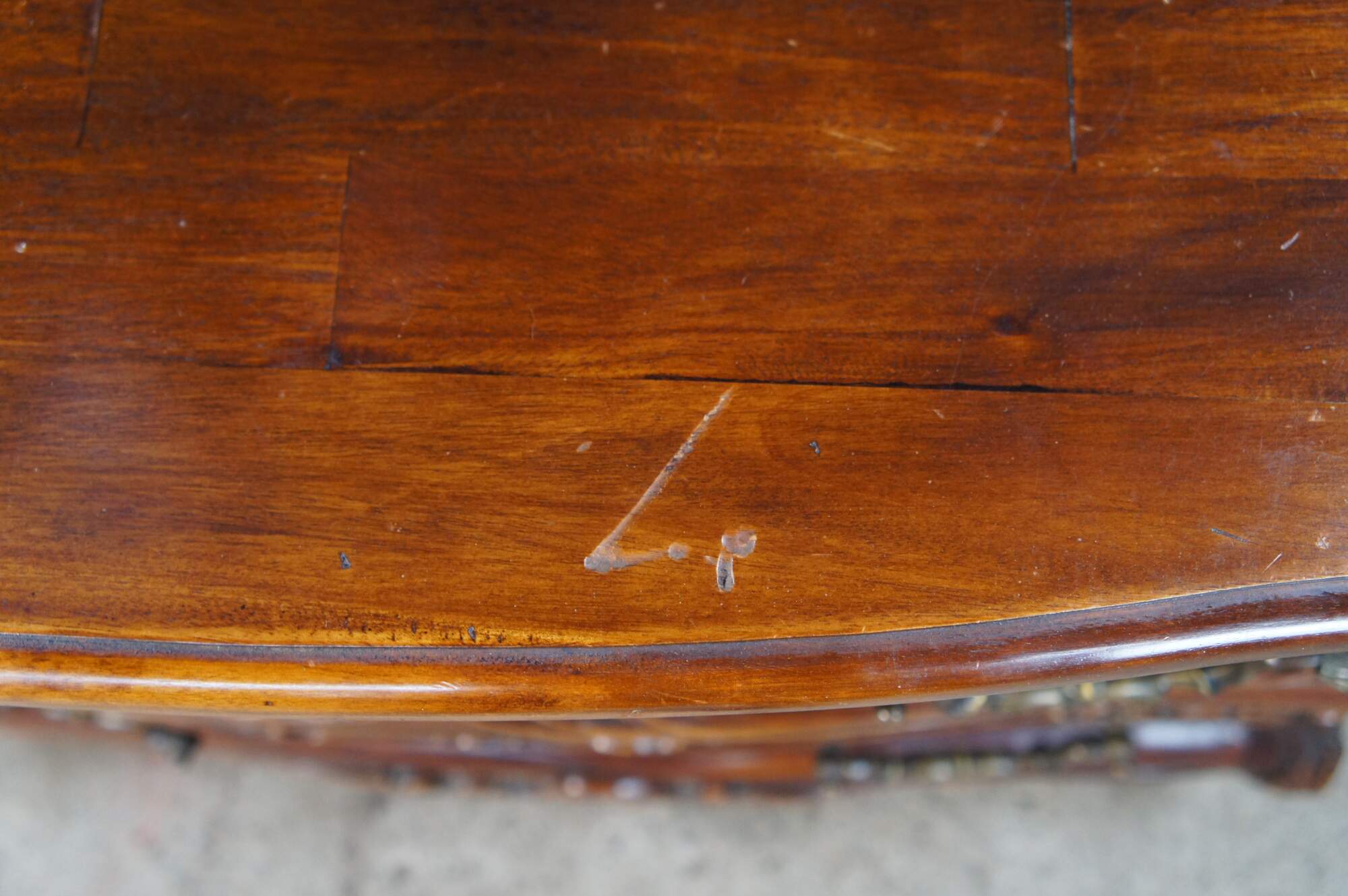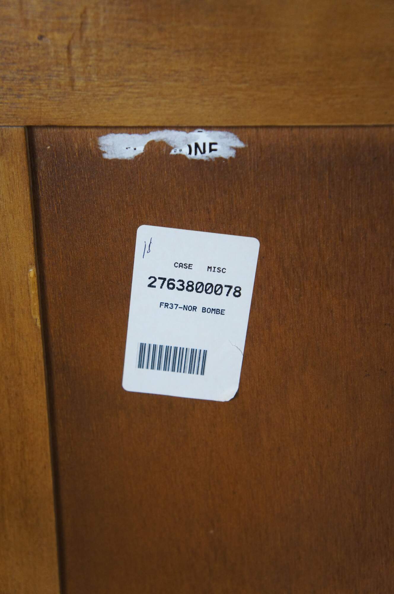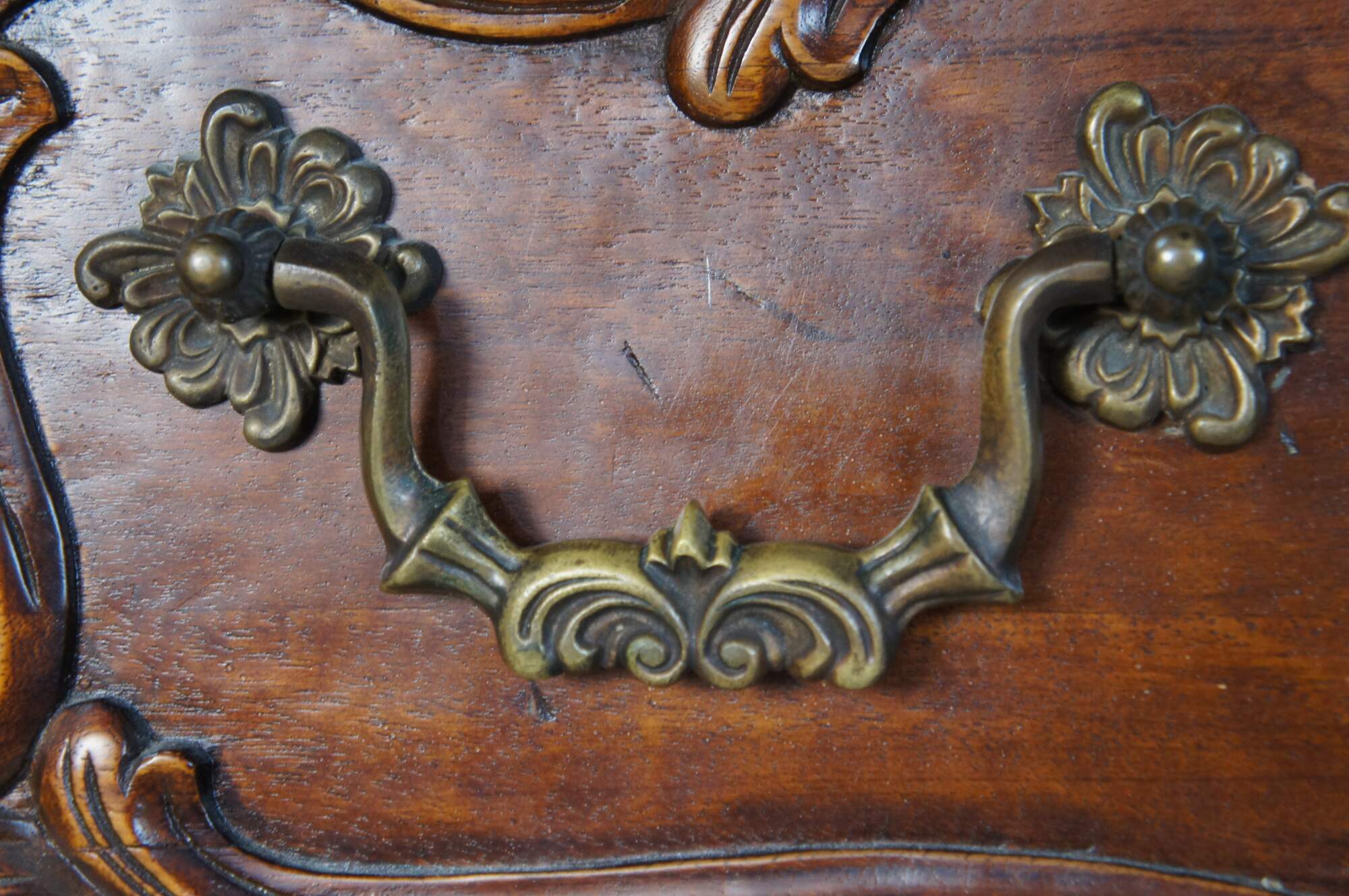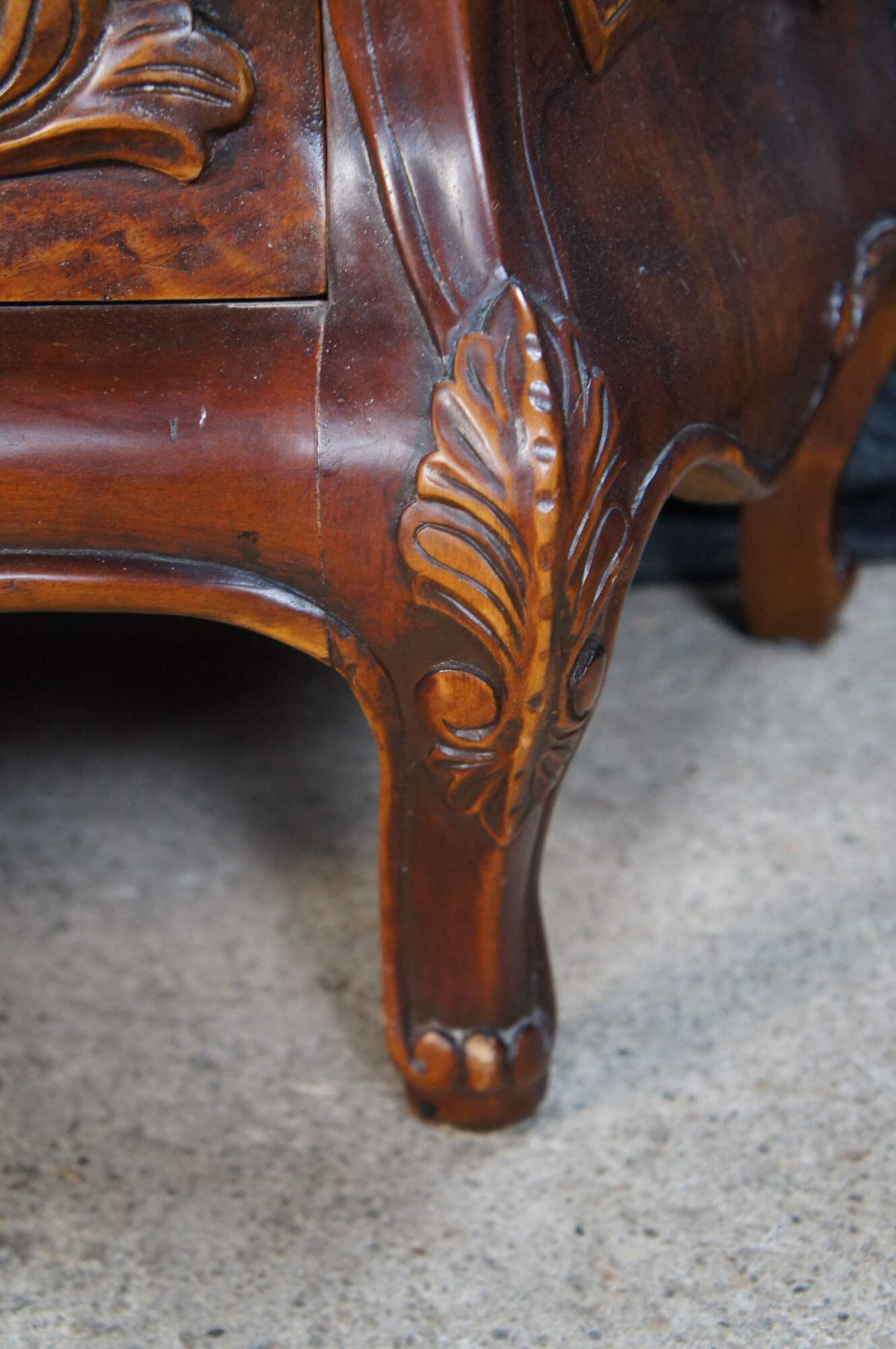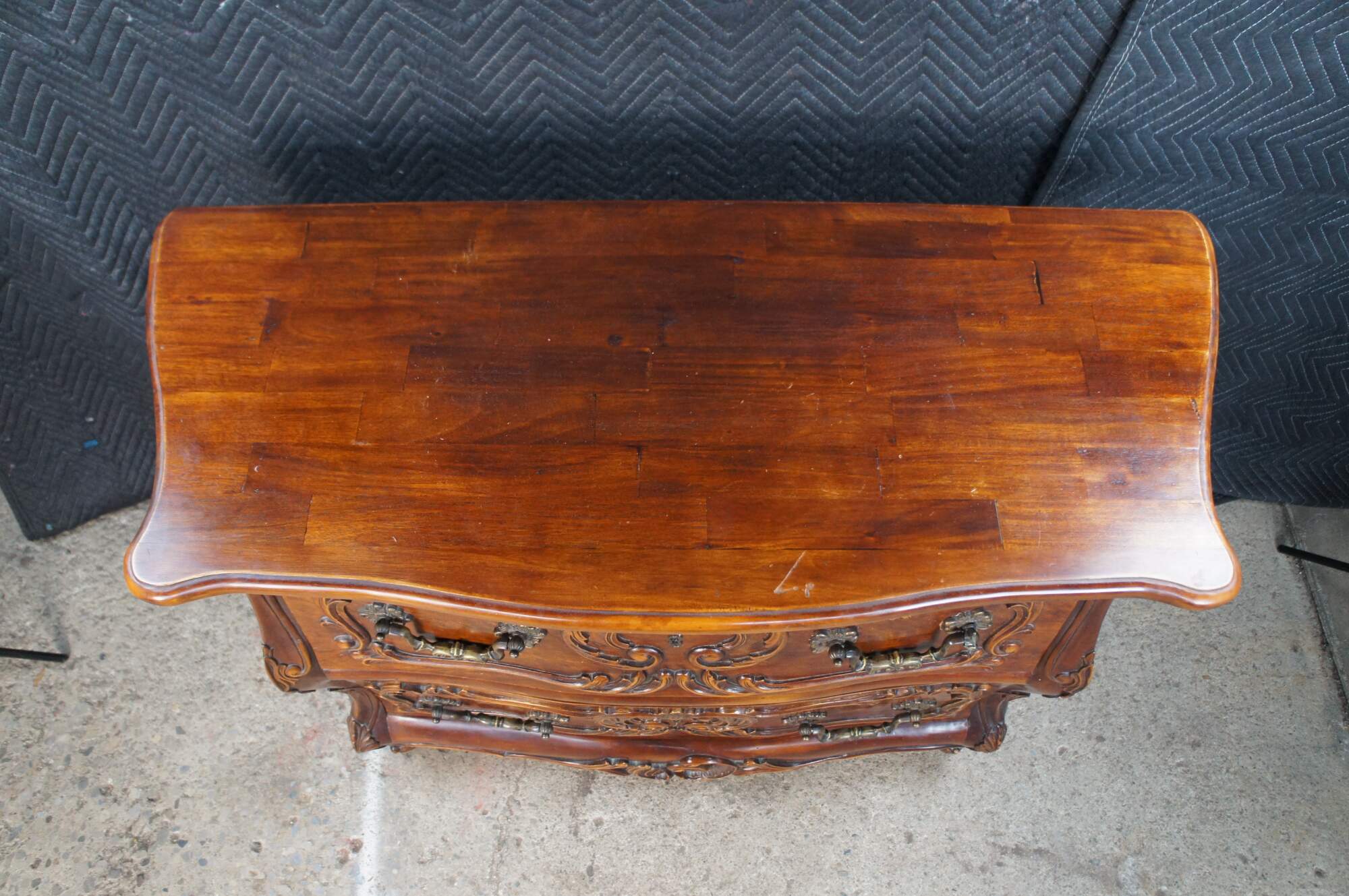 Vintage French Provincial / Louis XV style cherry bombe chest / commode / chest of drawers / console featuring a planked top with two large drawers and carved acanthus accents. Attributed to Century Furniture Company.