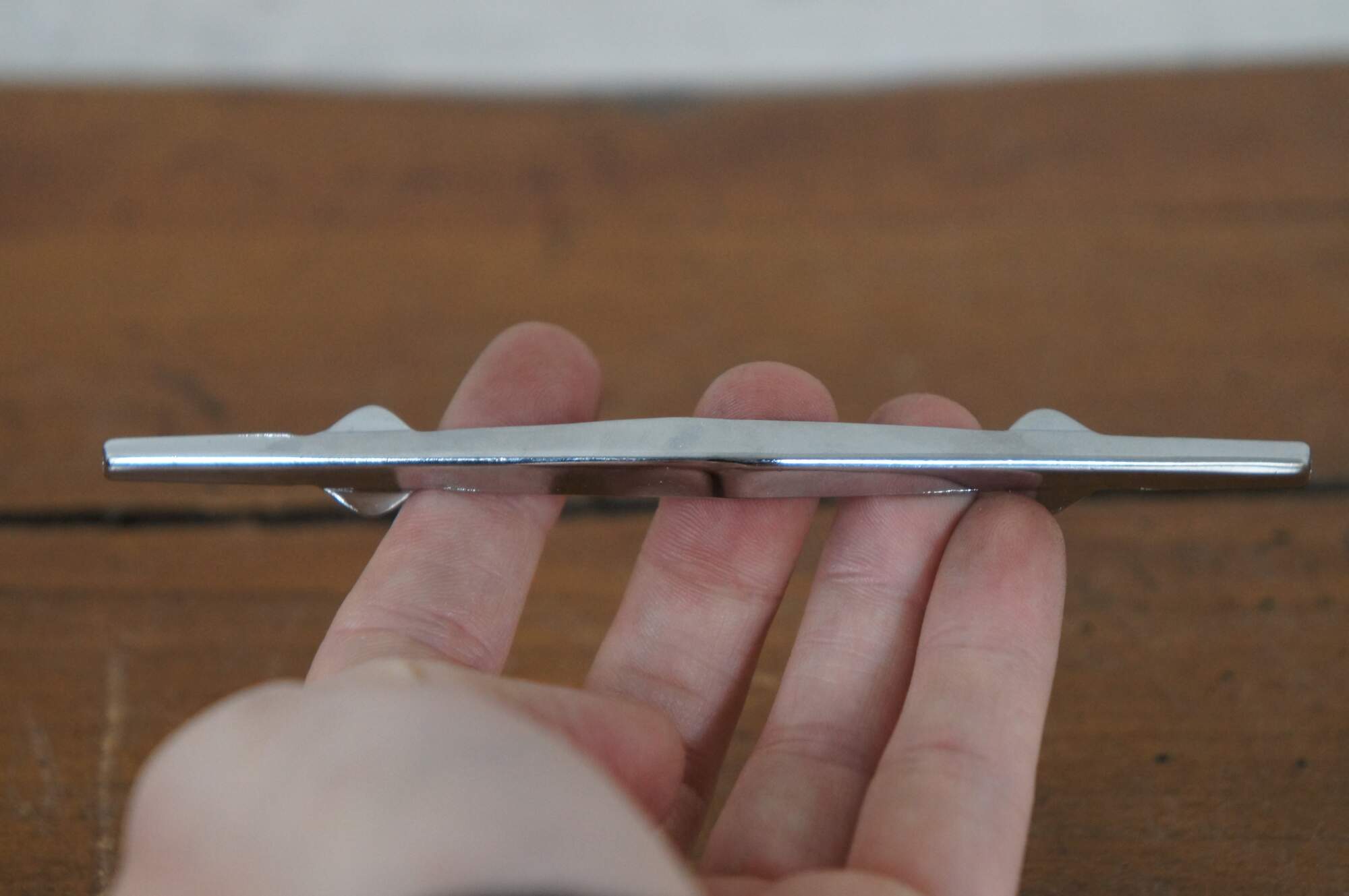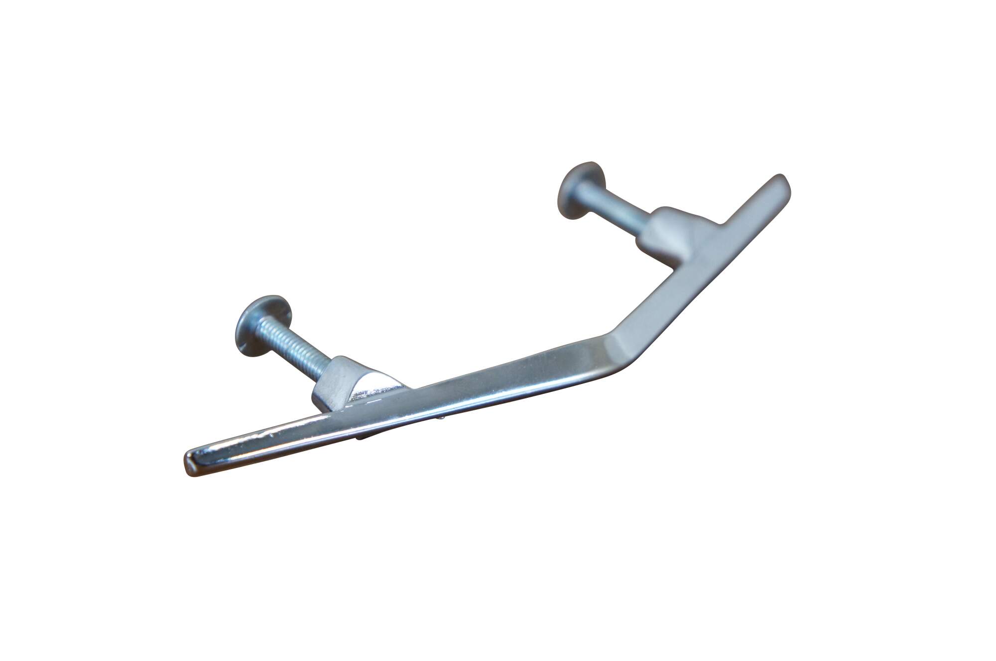58 Available – Mid century modern style National Lock Co Medalist hardware, item number C297 drawer pulls, die cast in a slender arrow or bow shape, in a bright chrome. 2 3/4" center hole, 5" length, screws included. 61-717.