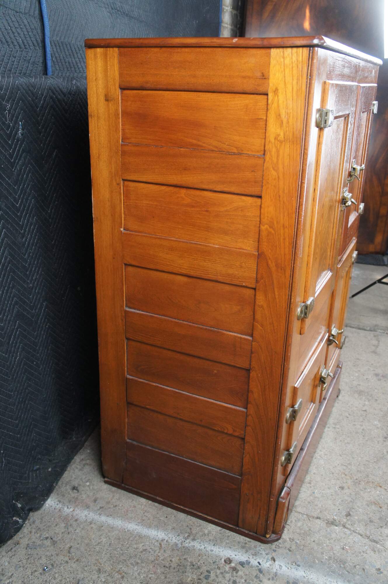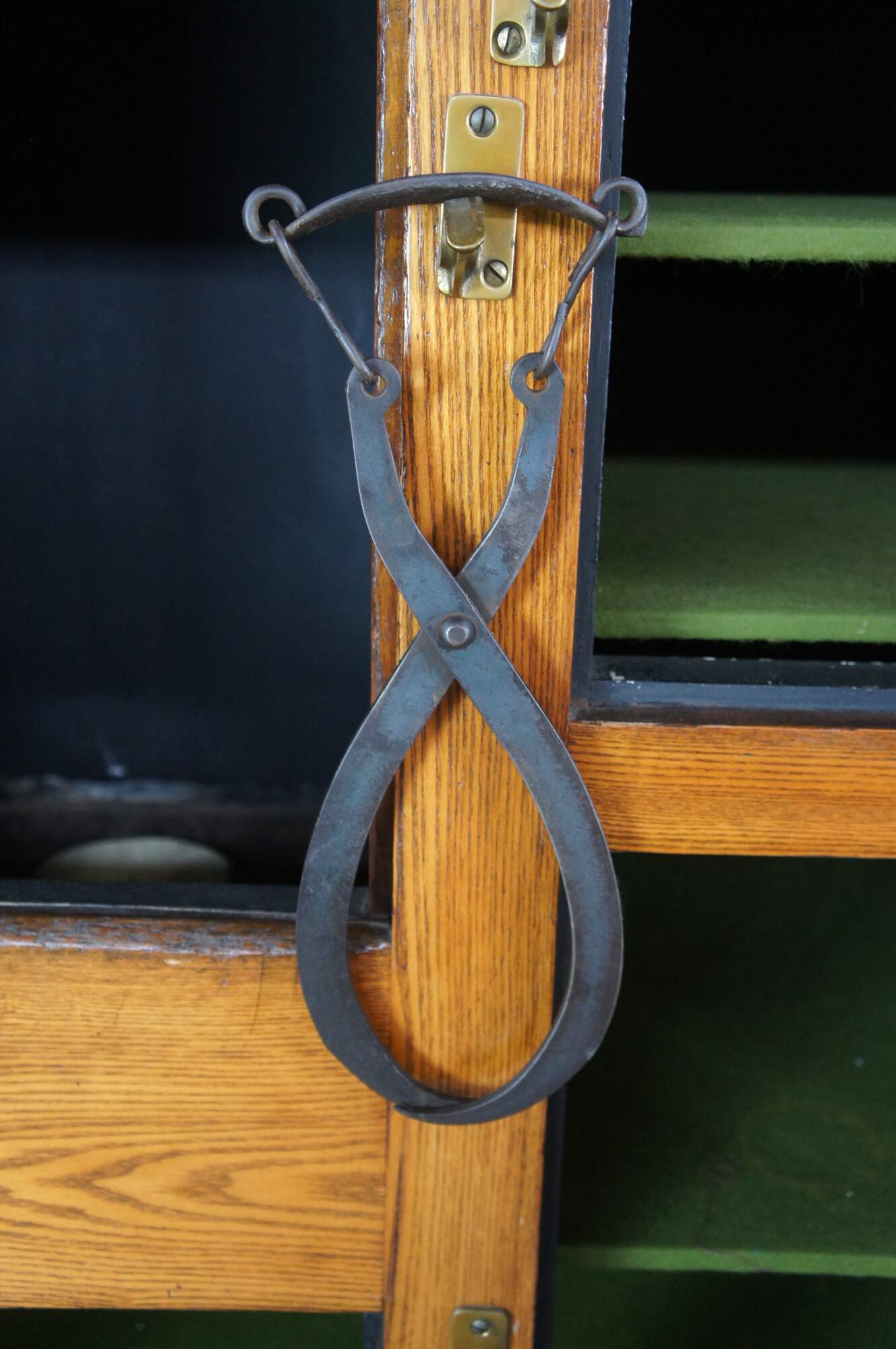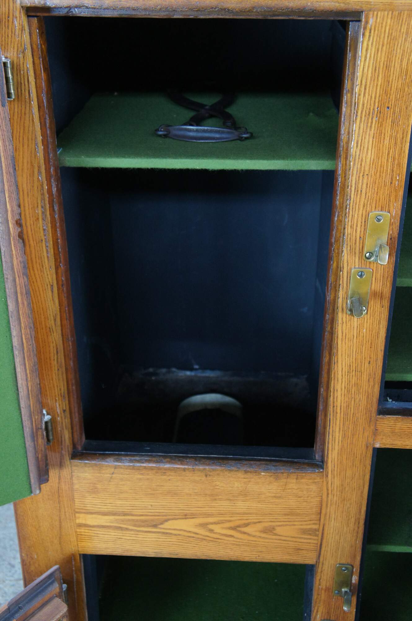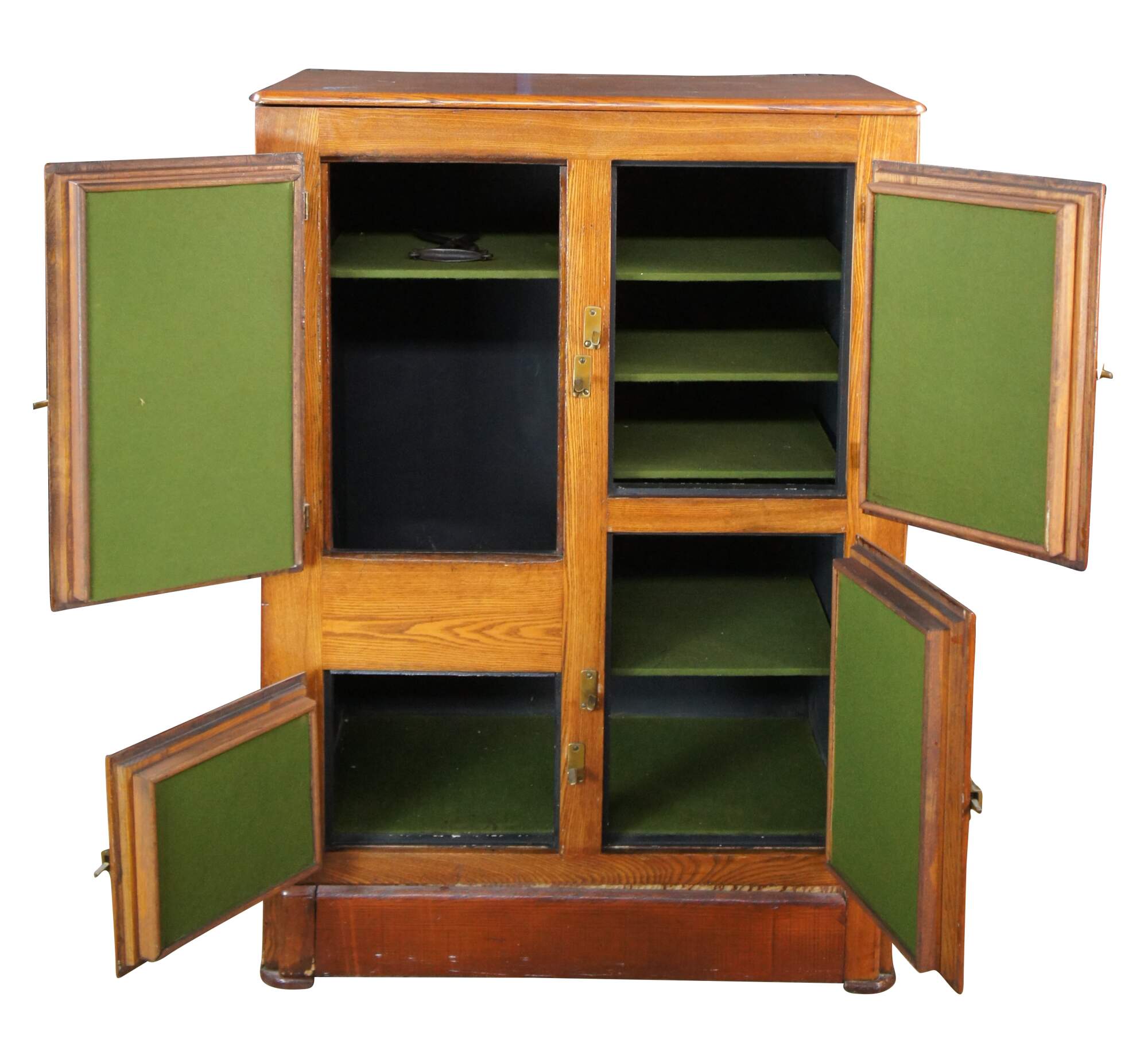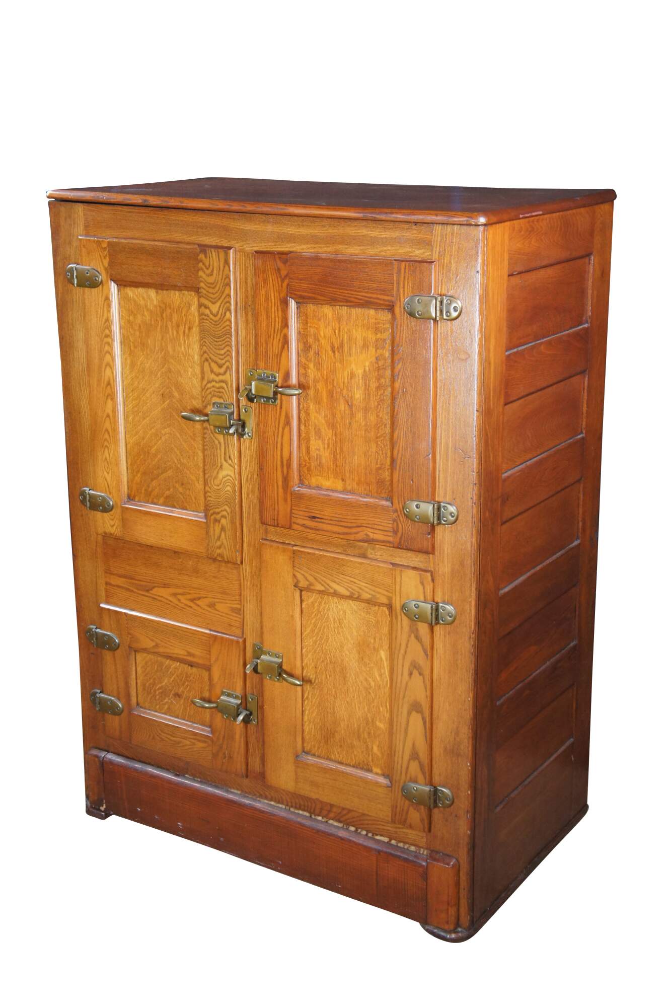 Antique Ice Chest sold by Belknap Hardware circa 1919. Made quartersawn oak with a stout rectangular frame featuring four doors, original brass hardware and paneled sides. Interior has been retrofitted for use as a storage cabinet with green felt lined shelves that are removable. Includes antique cast iron ice block tongs.