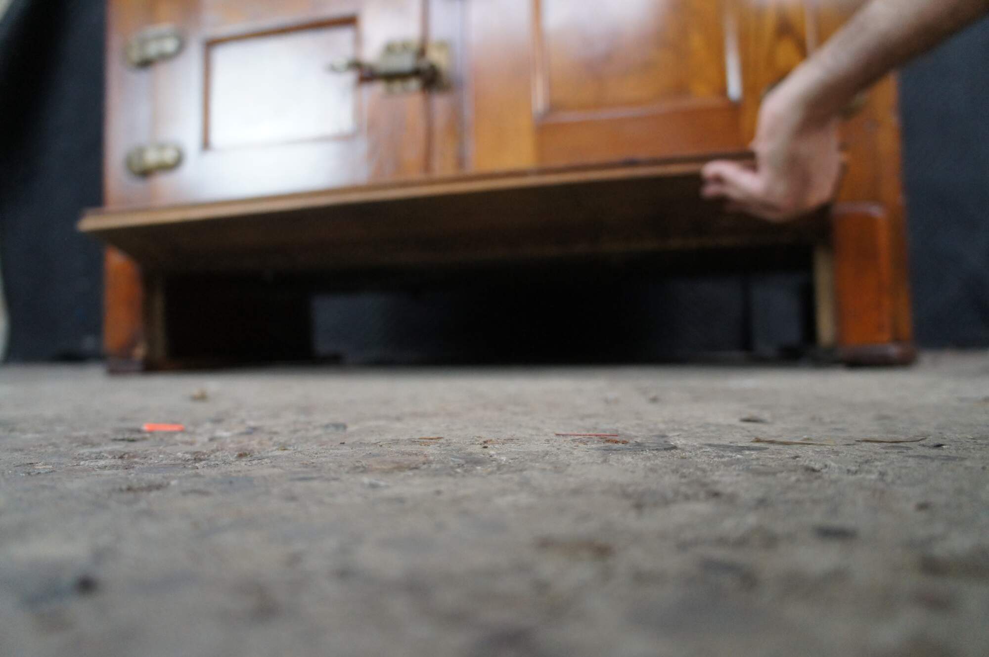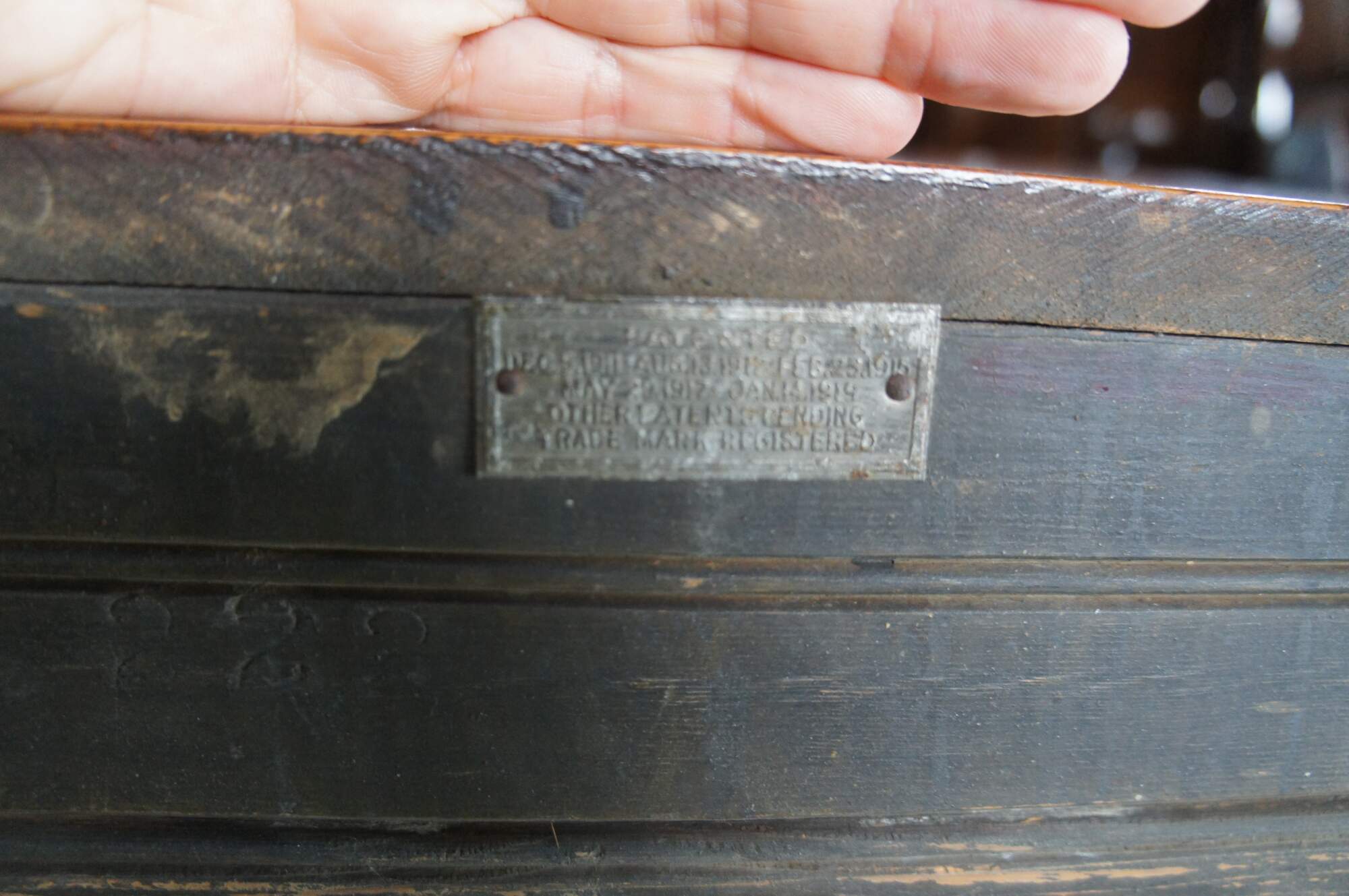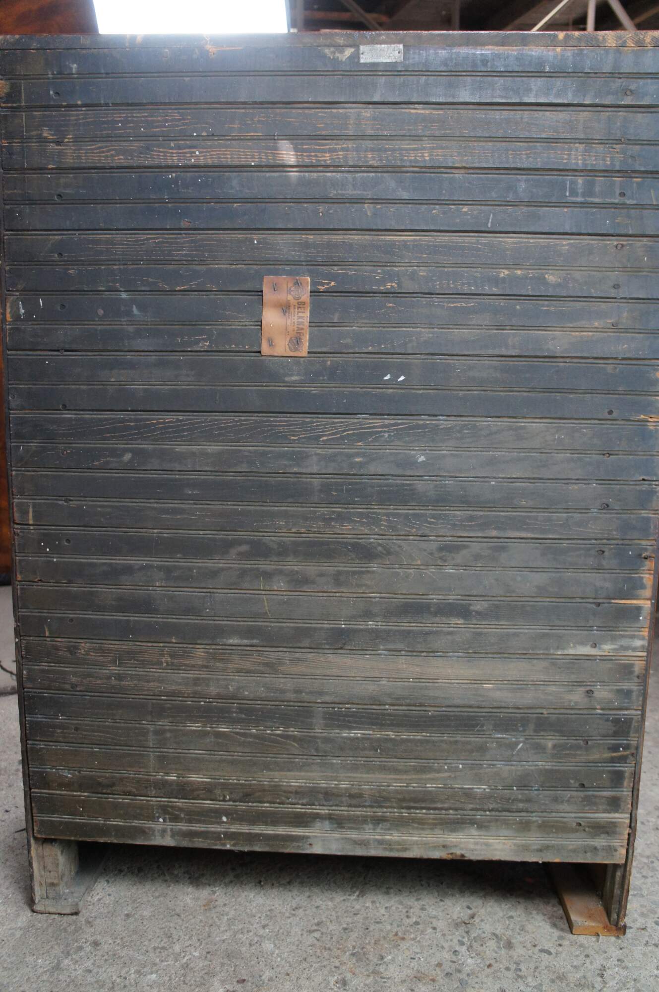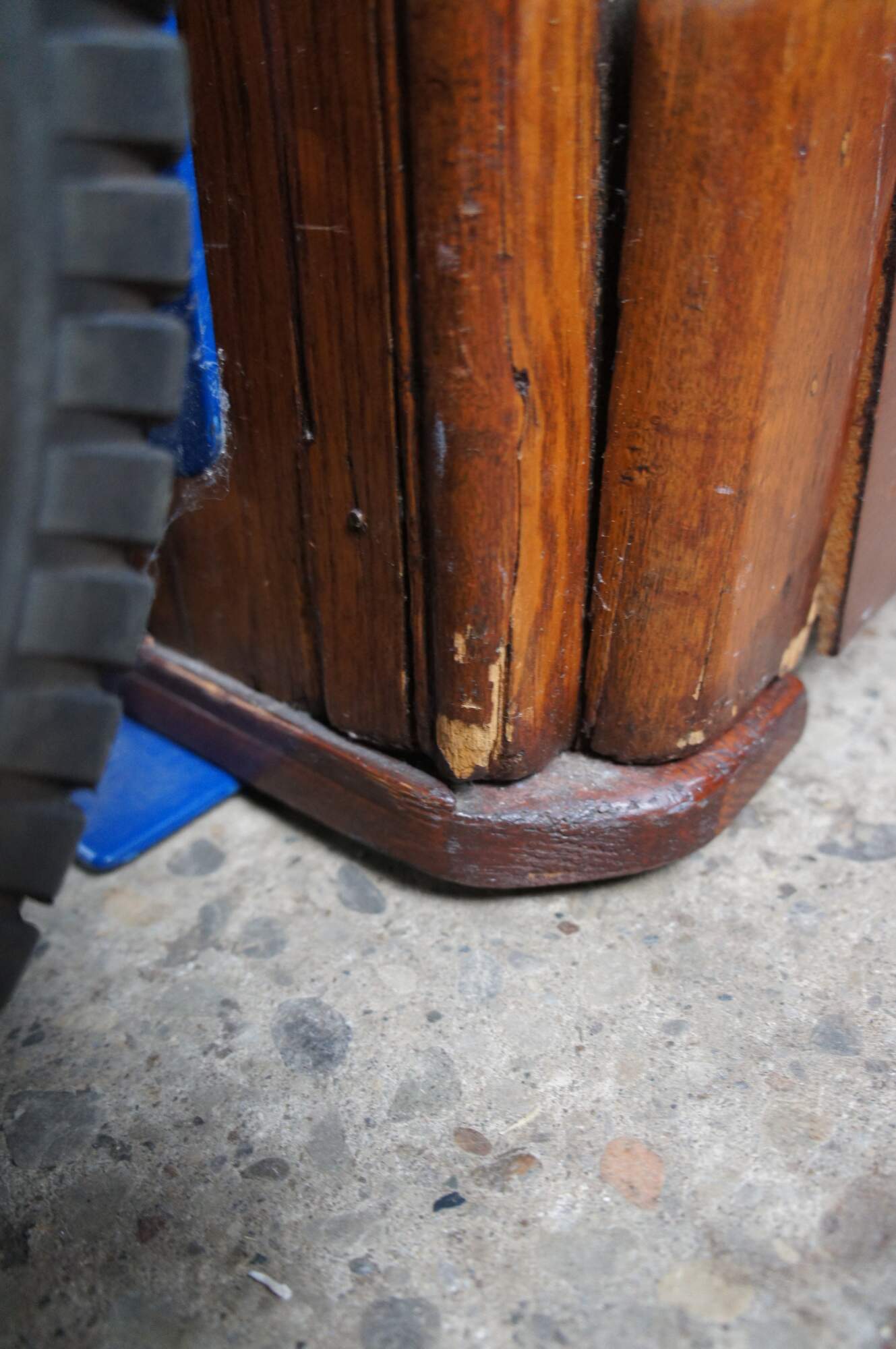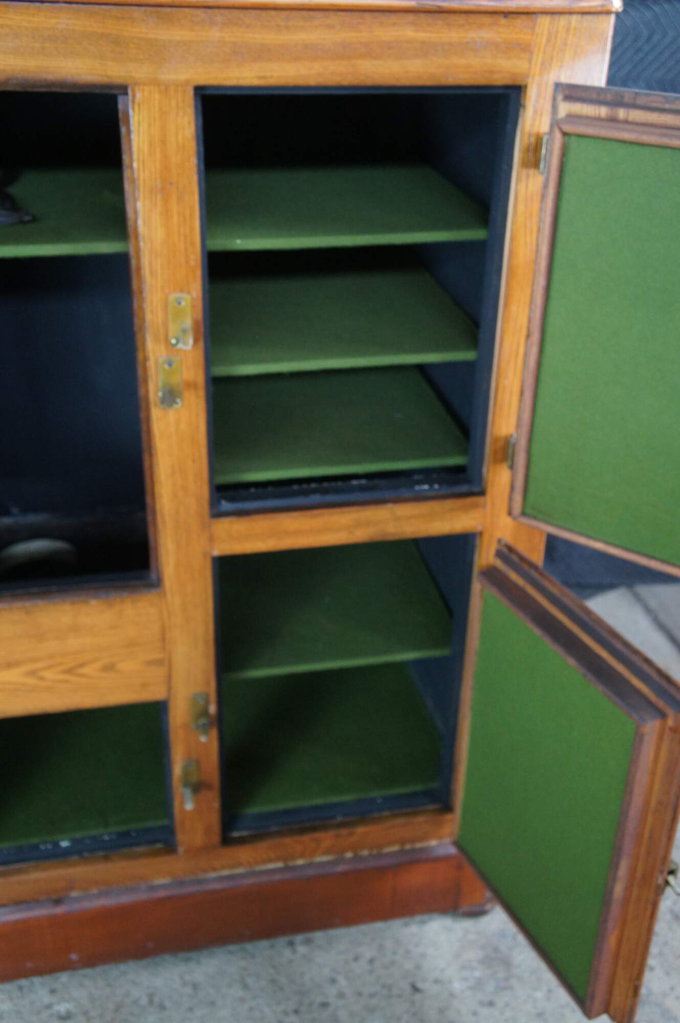 Structurally solid, wear and distressing from age and use, fading, scuffing, chipping / finish loss, interior retrofitted with felt shelves, very heavy.