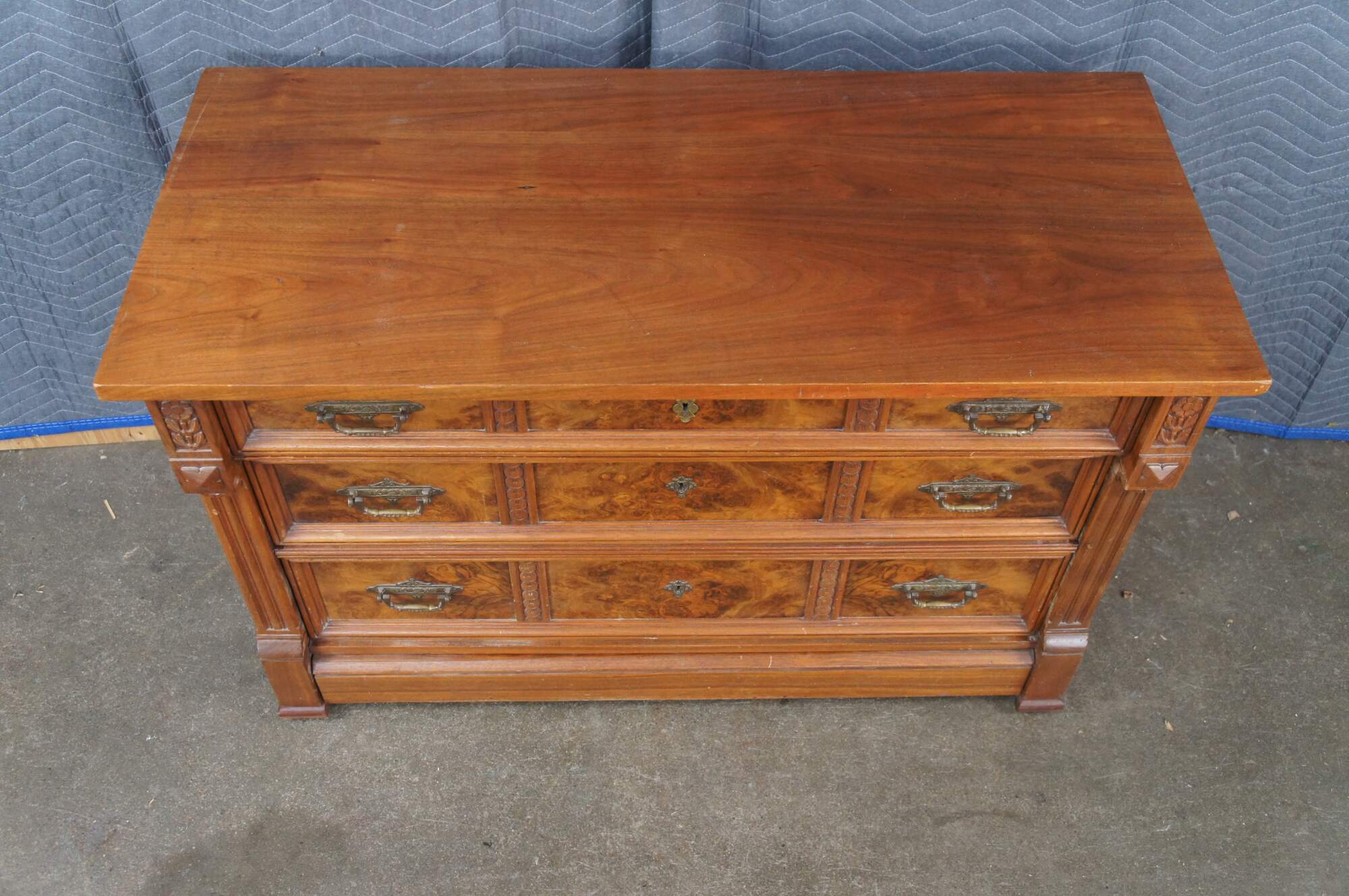 This gorgeous Victorian era dresser comes from the aesthetic period, circa 1880s. Made from walnut with three graduated drawers set between pronounced stiles with carved daisies over an apex medallion and fluting. The dresser features a hidden drawer set in the lower apron. Drawer fronts showcase burled walnut veneer and aesthetic period brass hardware with an escutcheon plate at the center.