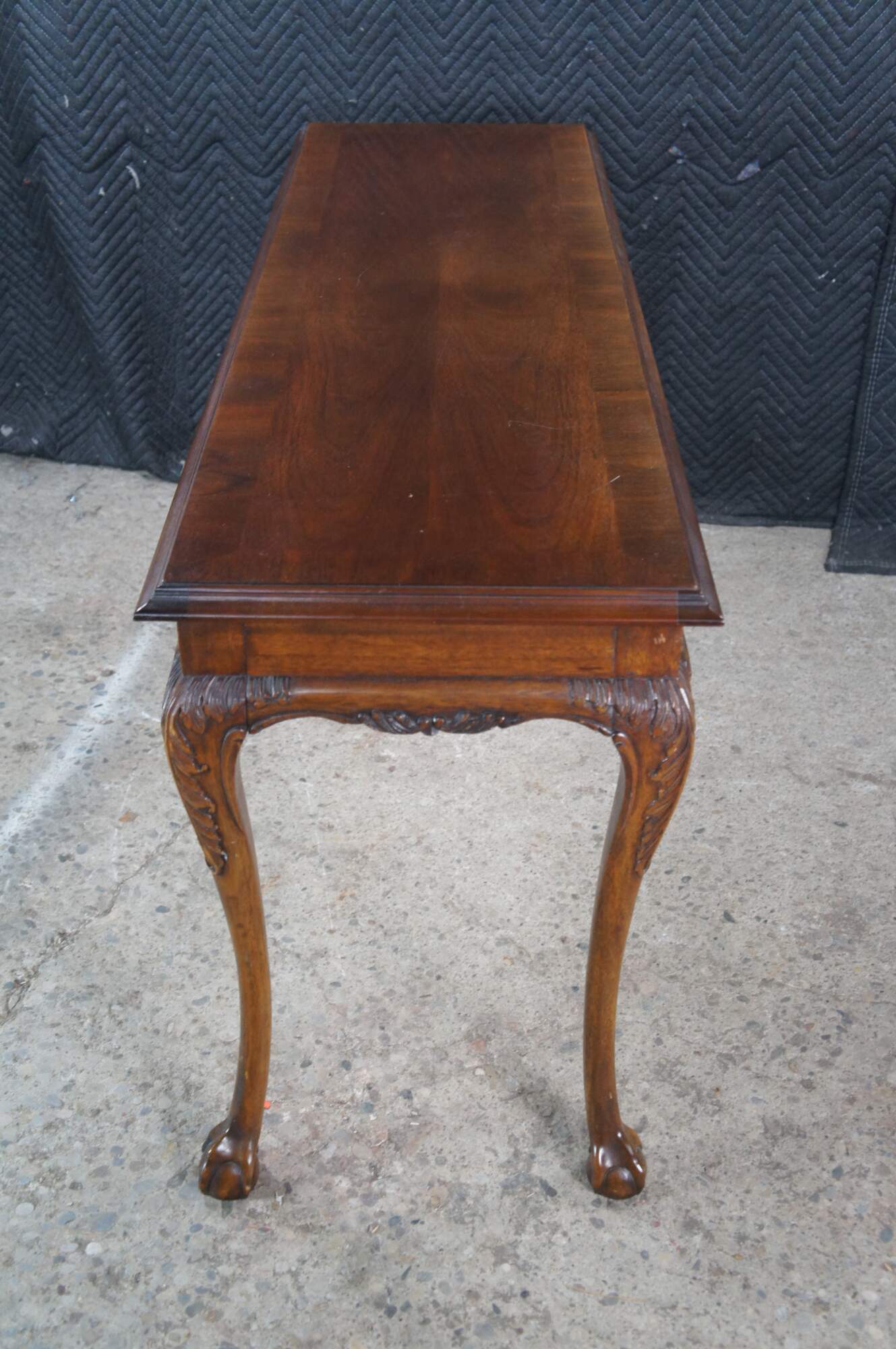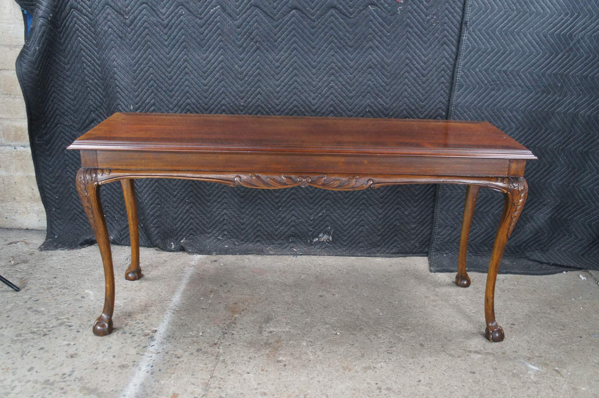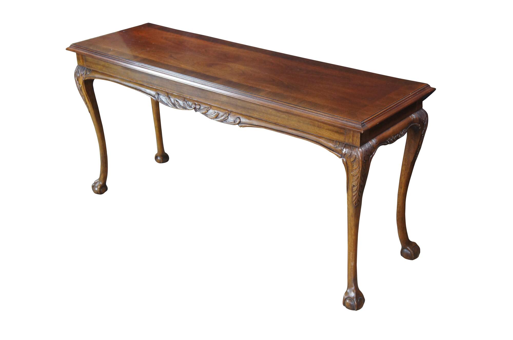 Vintage Lane sofa table / hall table / console / sideboard. Made of mahogany featuring Chippendale styling with banded top, acanthus accents, and ball and claw feet.
