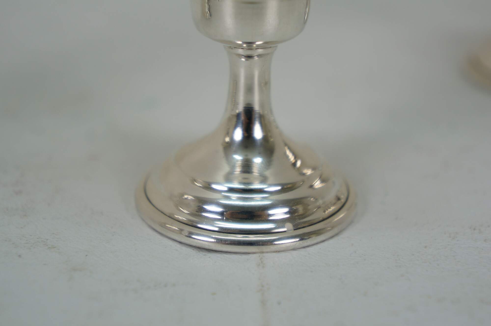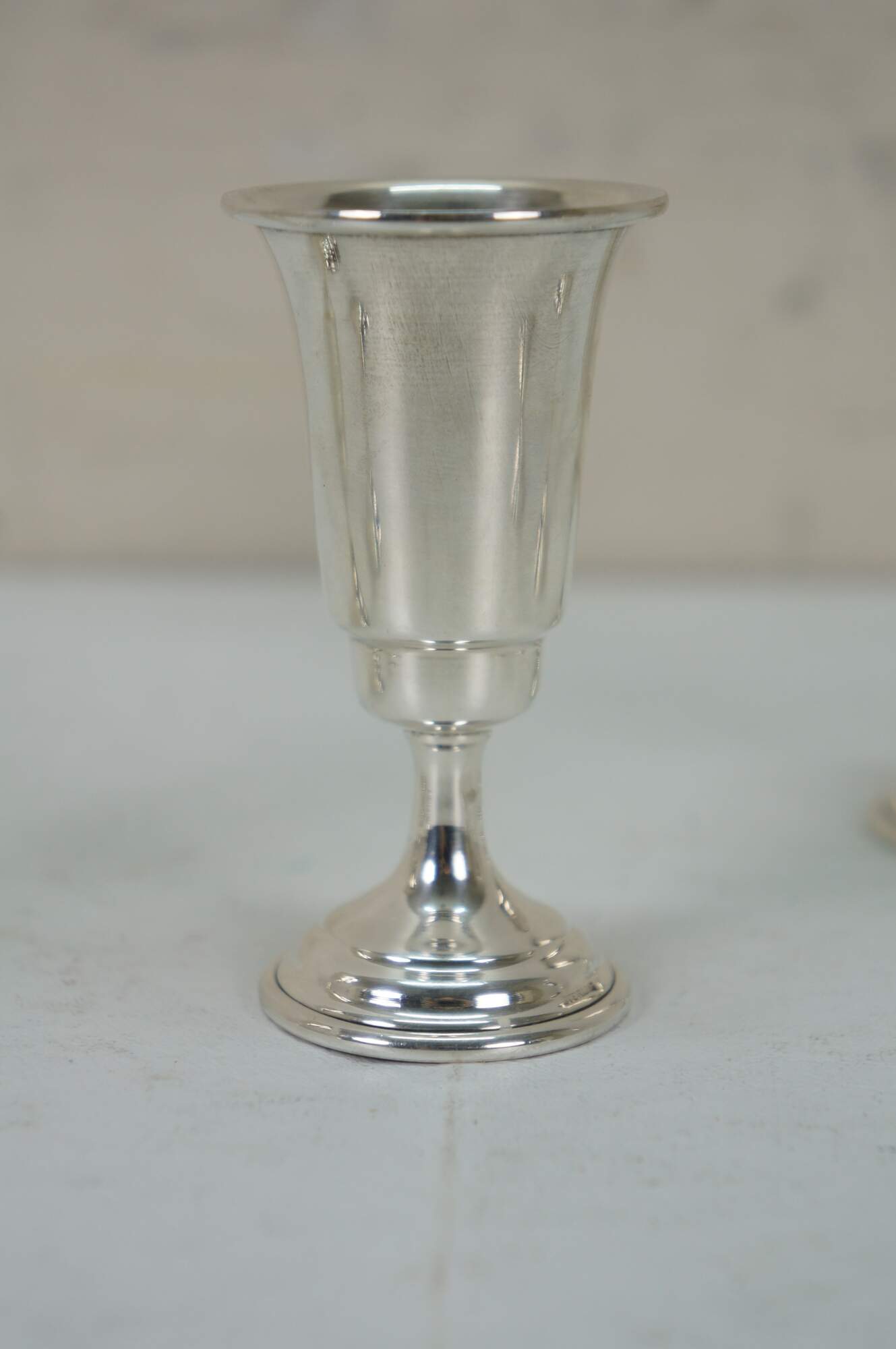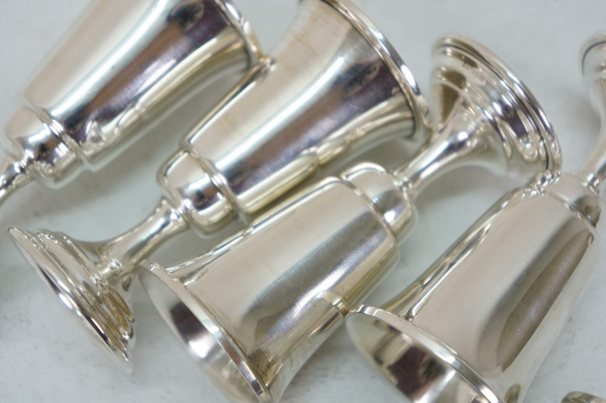 Set of 6 sterling silver miniature goblet shaped liquor / port / cordial / aperitif glasses. Weight 24.6 g each or approximately 150 g total. Marked Sterling on edge of base.
