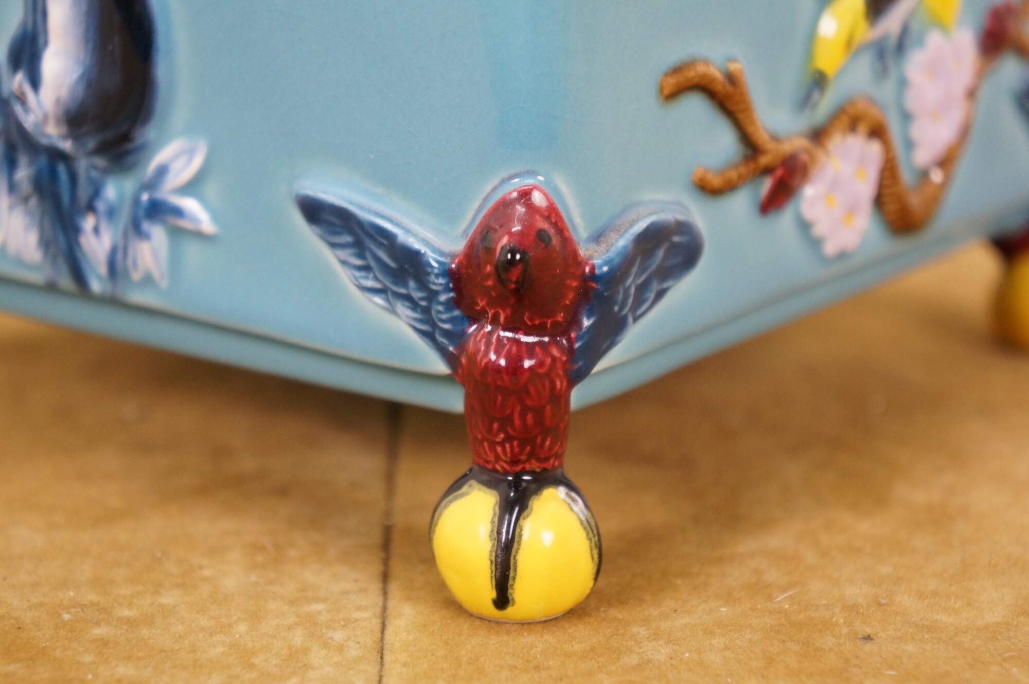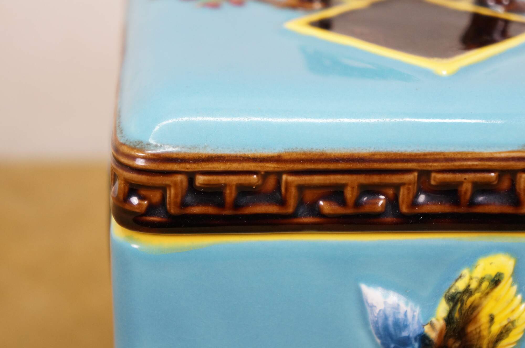 Late 20th century Chinoiserie / majolica style porcelain trinket box by Mottahedeh. Square turquoise box with feet fashioned of red birds clutching yellow orbs. Sides decorated with birds flying over flowering branches and blue squirrels. Lid features a brown Chinoiserie border and branch shaped handle over overlapping diamonds. Turquoise blue interior with yellow trim. Made in Italy.
