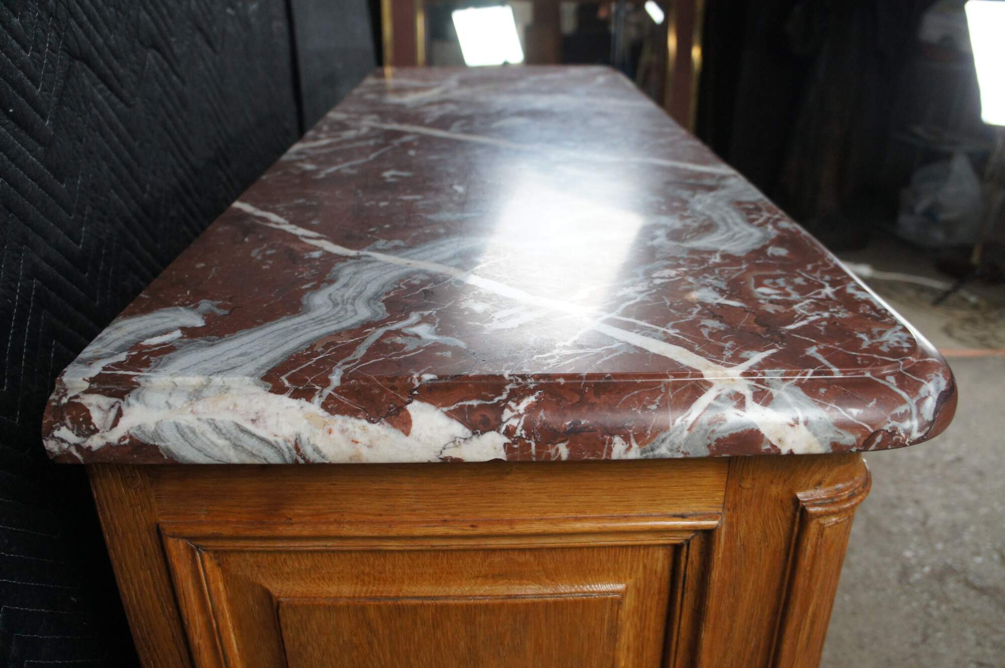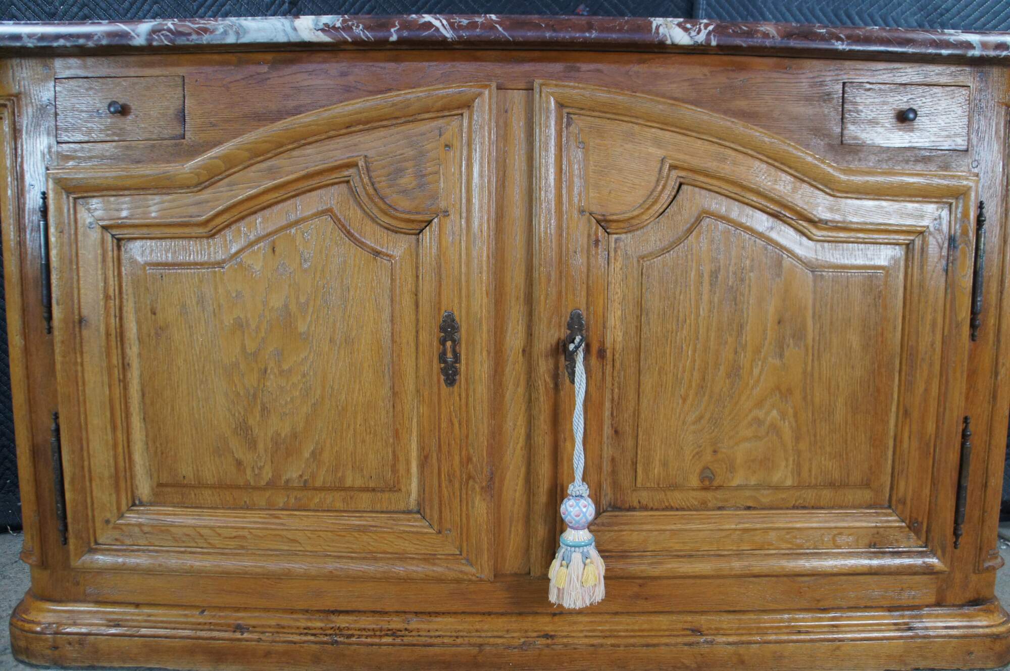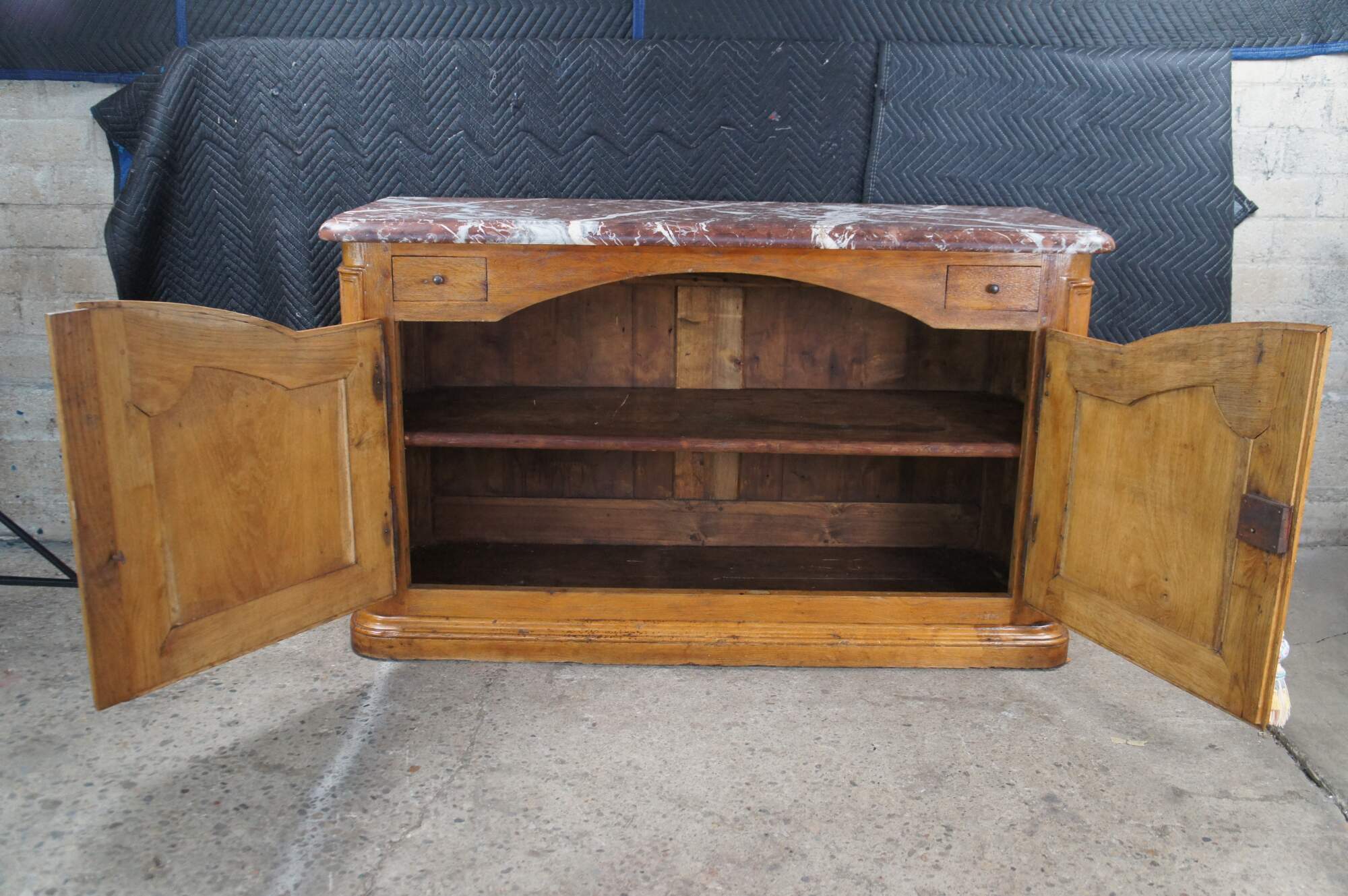 Striking Mid 18th Century French Louis XIV style Hunting Cabinet. Made from oak with a thick ruege marble beveled top over an oak case with two hand dovetailed knife drawers and a larger lower domed cabinet for storage with working lock and key. The buffet rest on molded plinth base. A remarkable addition to any space.