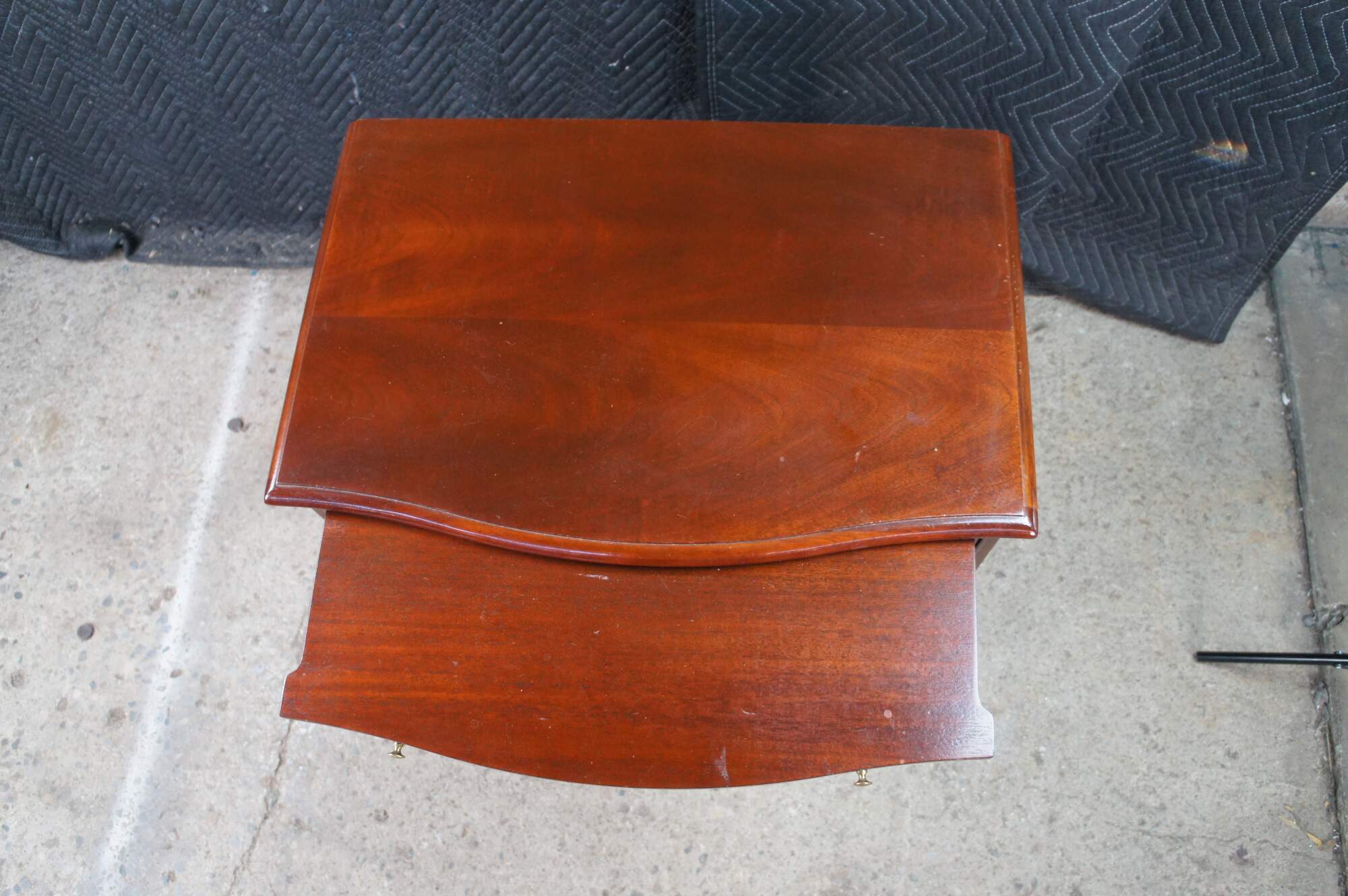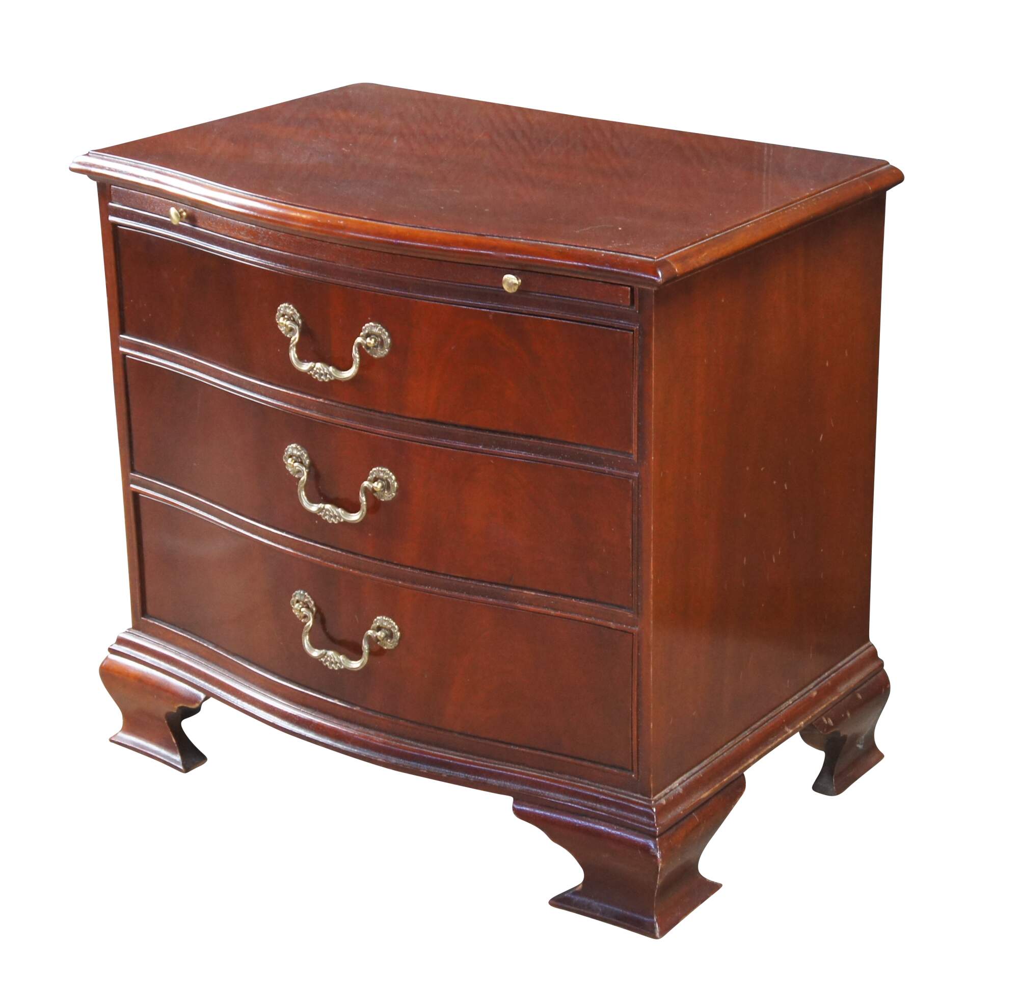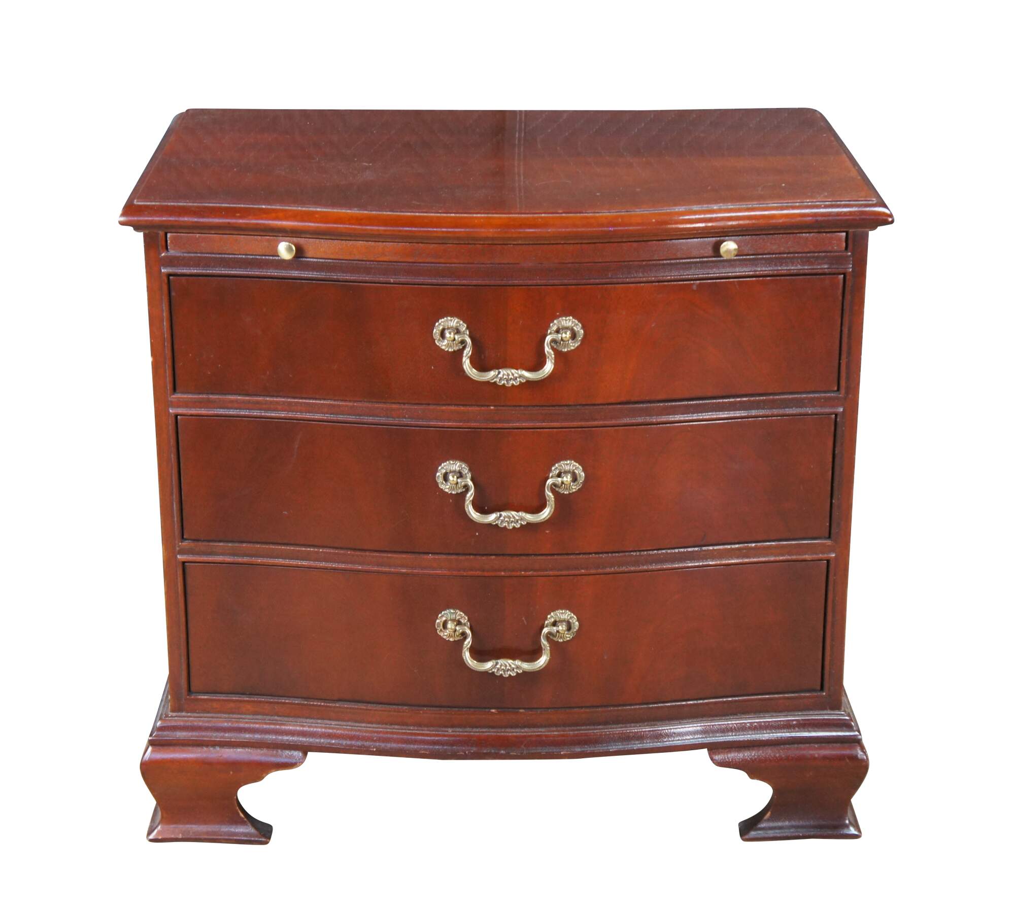 Baker Furniture bedside chest / nightstand / end table. Made of mahogany featuring Georgian styling with three bowfront drawers, pull out tray table and bracket feet.