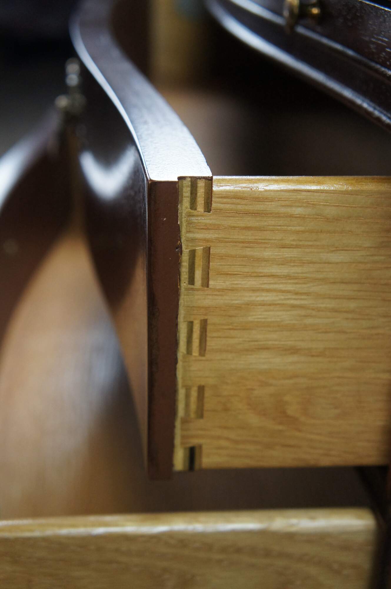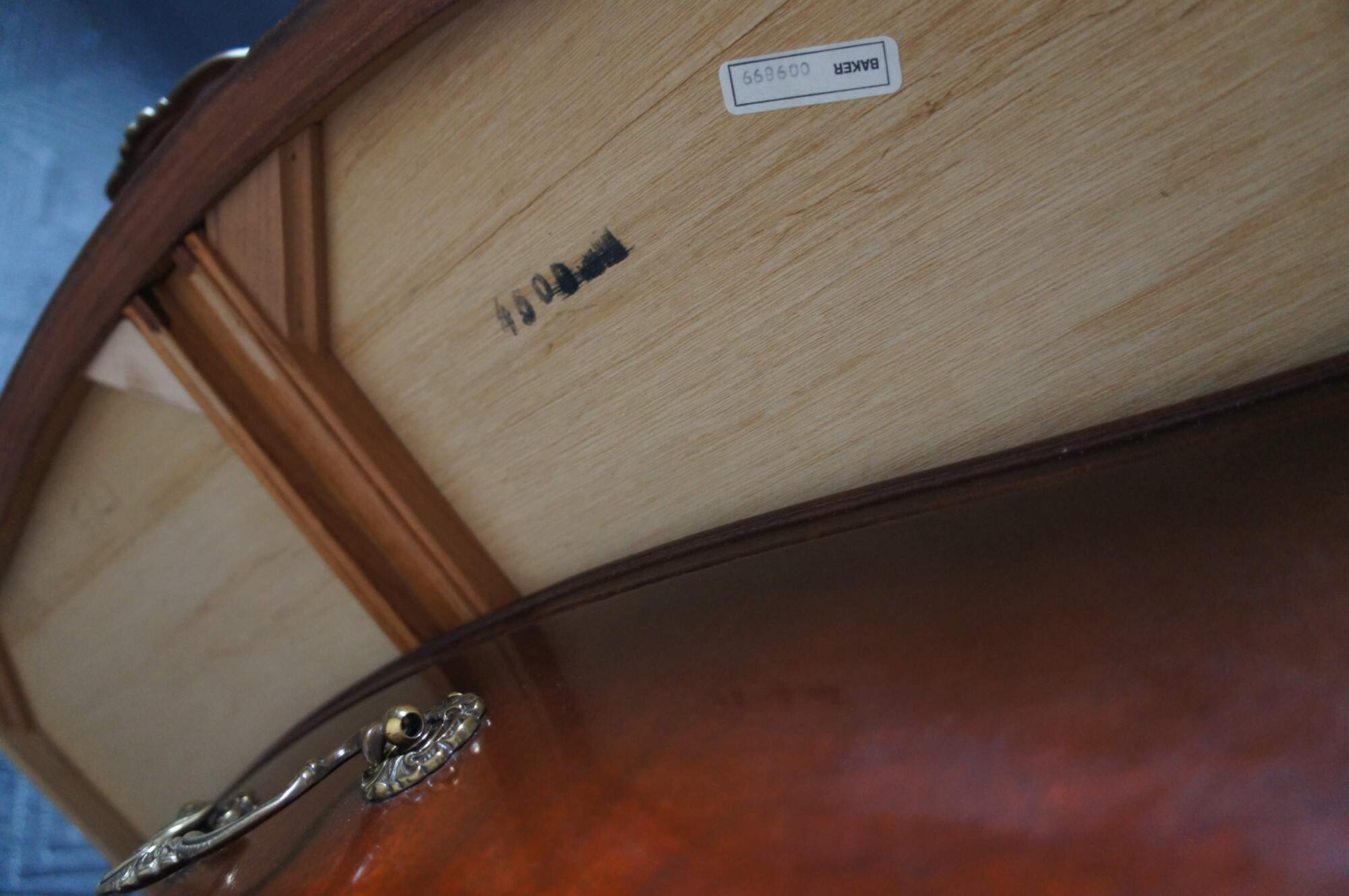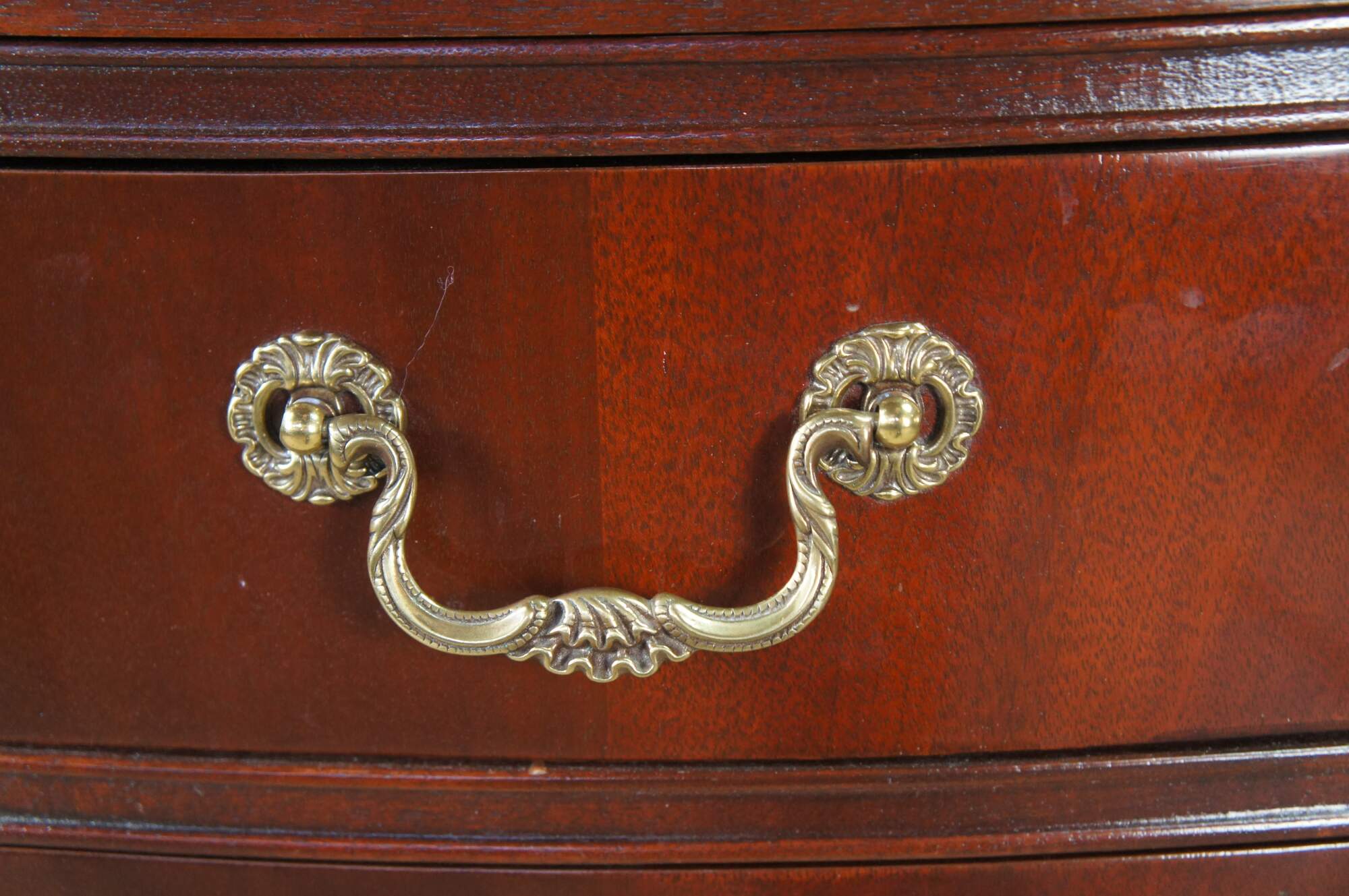 Baker Furniture bedside chest / nightstand / end table. Made of mahogany featuring Georgian styling with three bowfront drawers, pull out tray table and bracket feet.