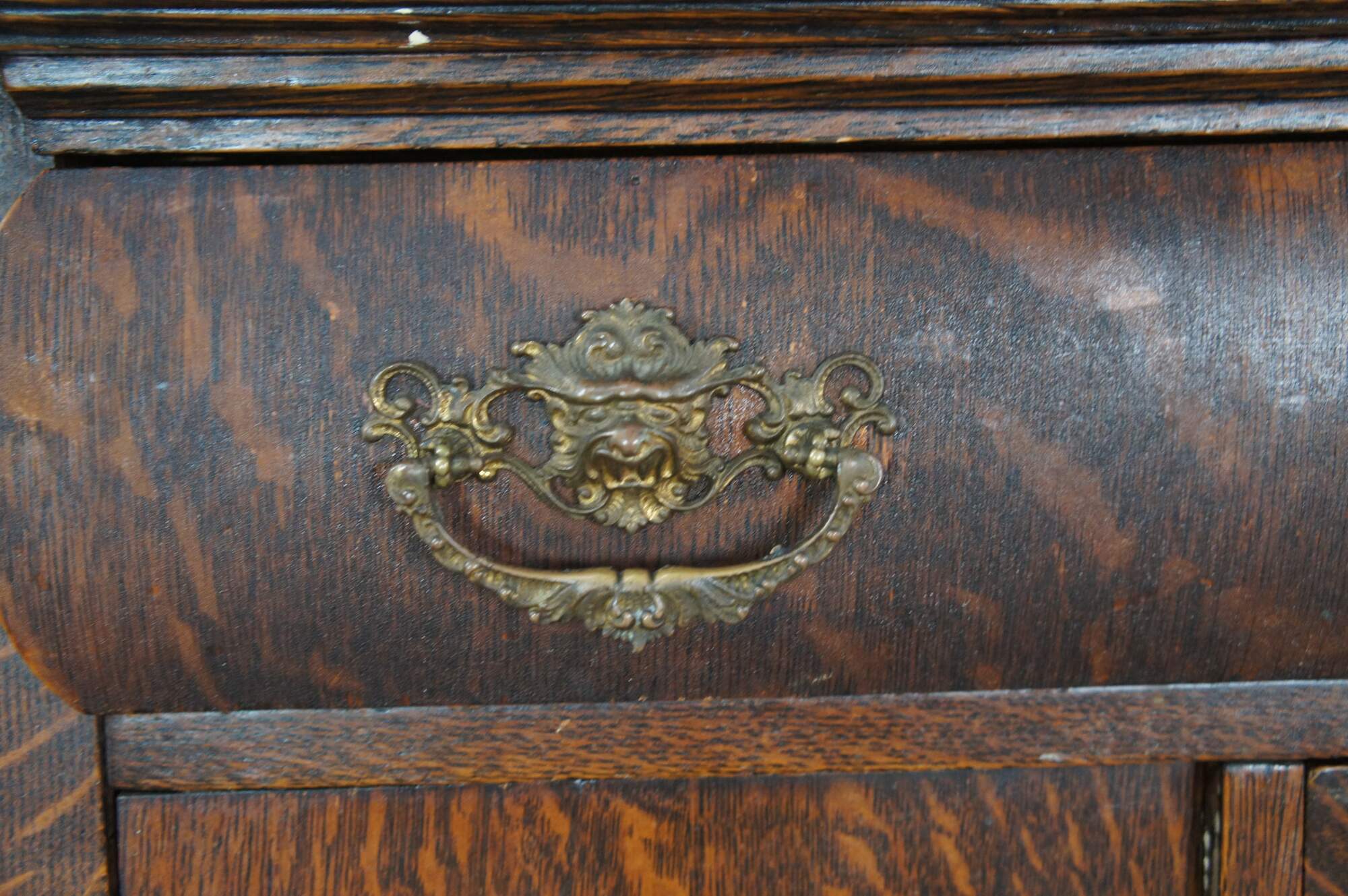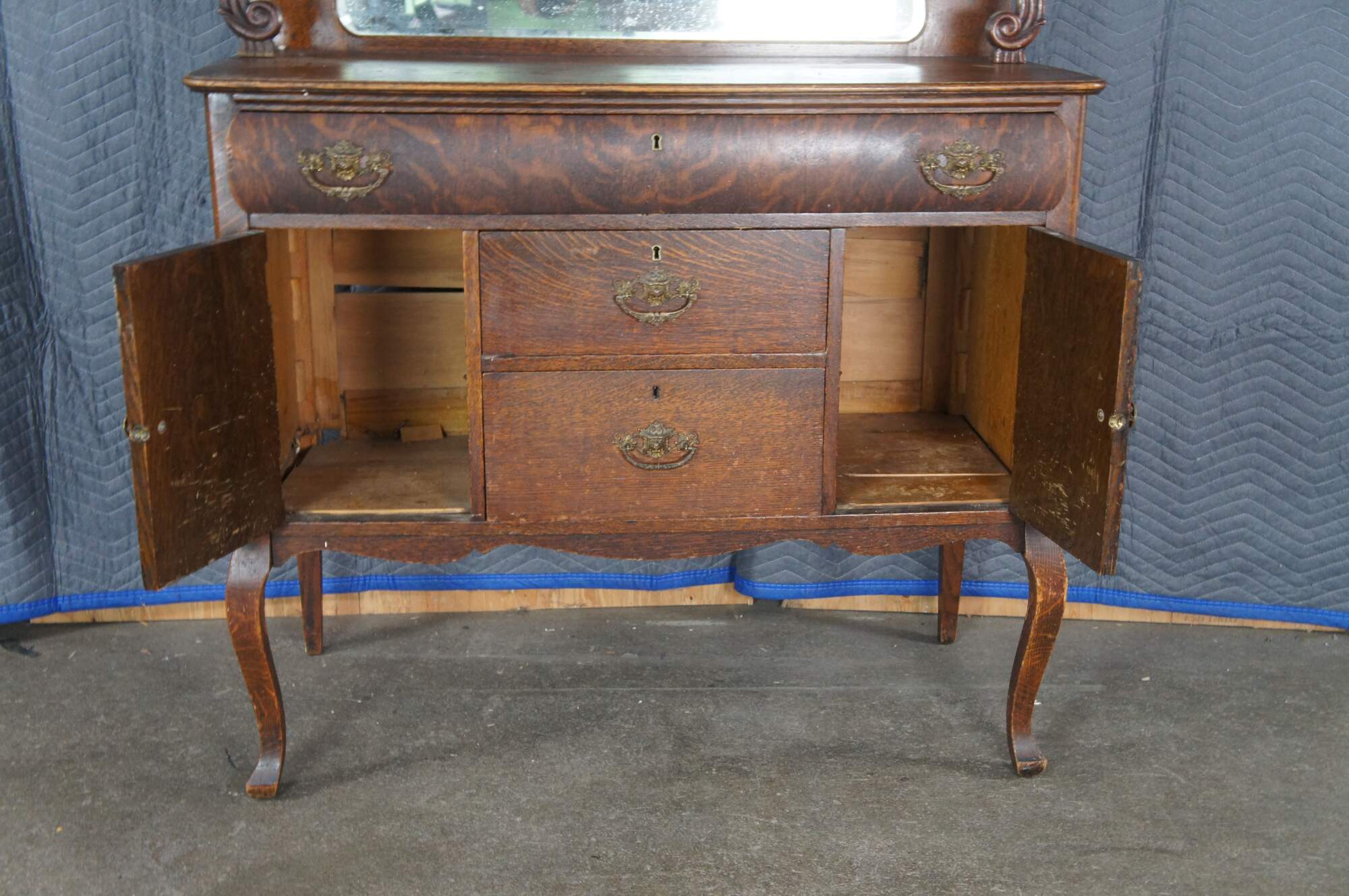 C. 1900 Late Victorian American Tiger Oak Buffet, Server, Sideboard or Bar Cabinet. Features a buffet portion with a large serving drawer over two smaller drawers flanked by outer cabinets. Drawers are constructed via rabbet joint and showcase beautiful period brass hardware with figural northwind faces and baroque style handles. The hutch is centered around a beveled glass mirror with grooved serpentine 'C' scroll supports, two small shelves and a larger upper surface for display. The cabinet is supported by cabriole legs along the front and straight legs at the rear. A nice addition to any space.