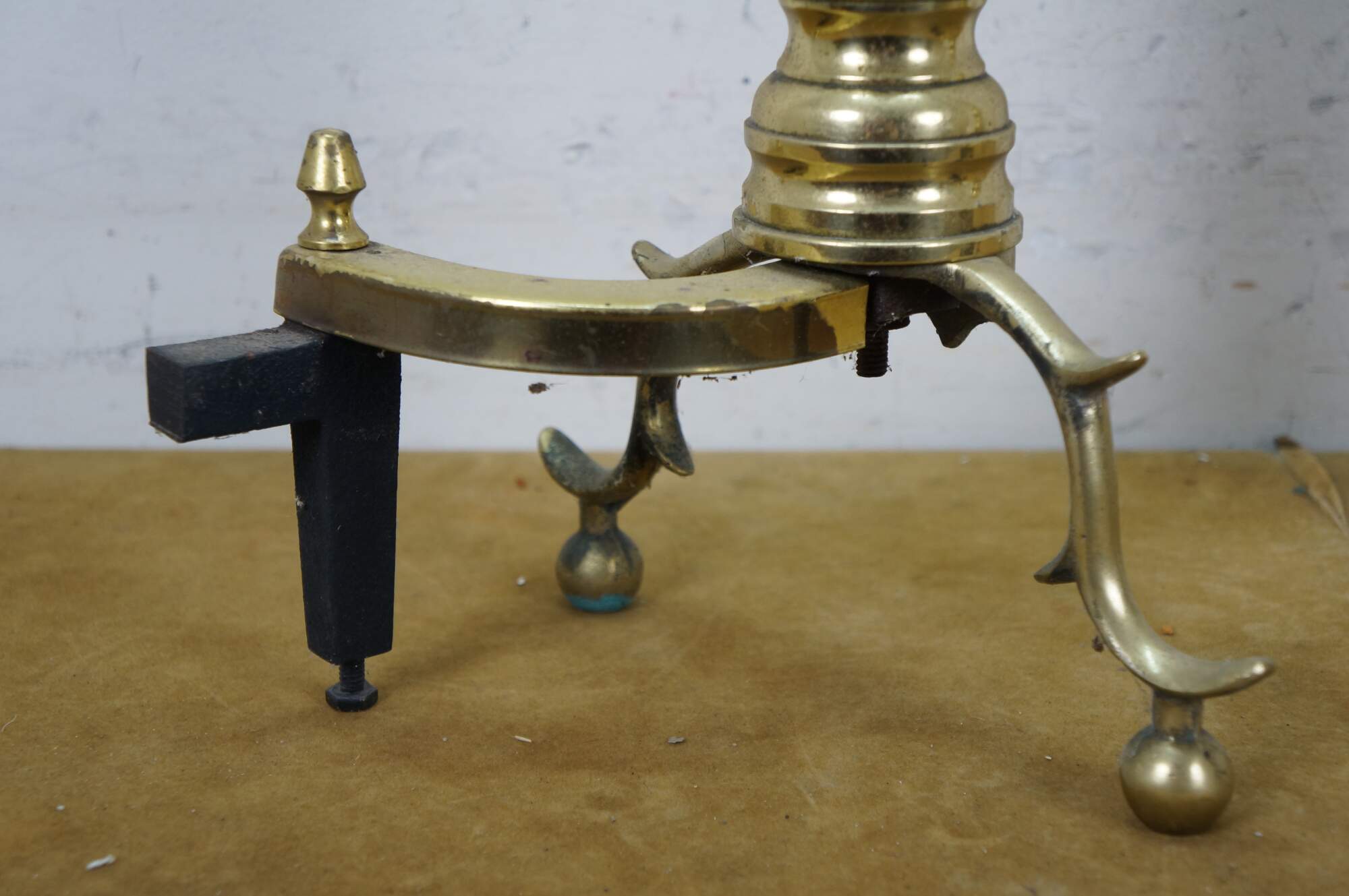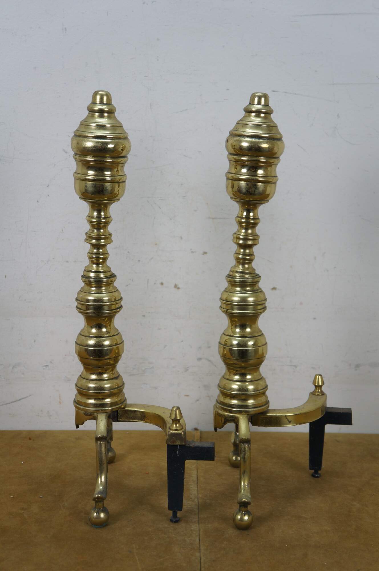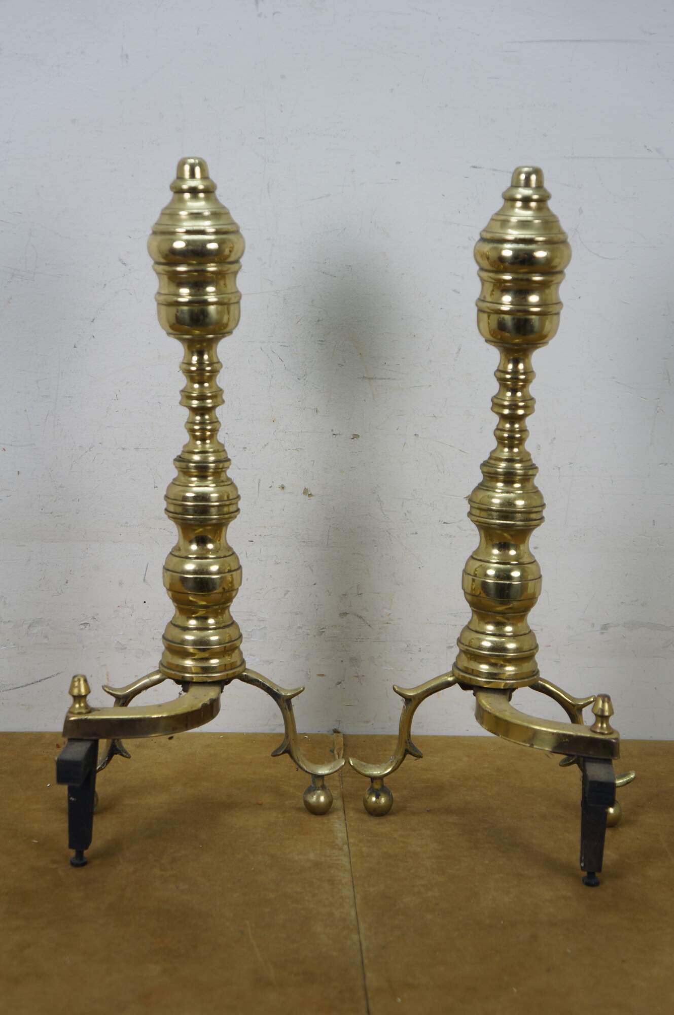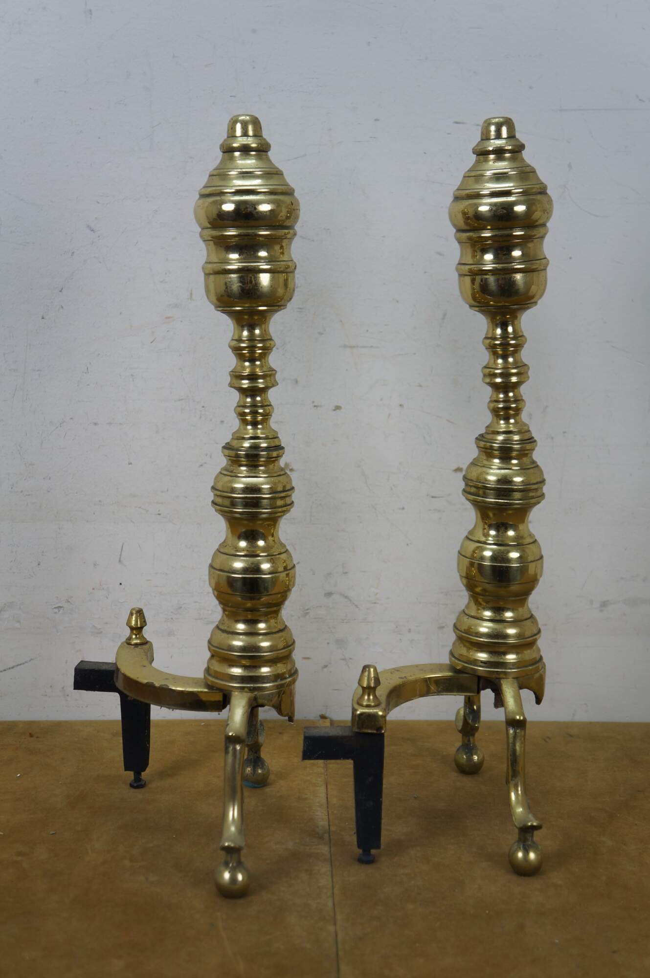 Pair of antique brass Chippendale / Georgian / Colonial style andirons / fire dogs - beehive shaped baluster style posts on bowed legs with orb feet.