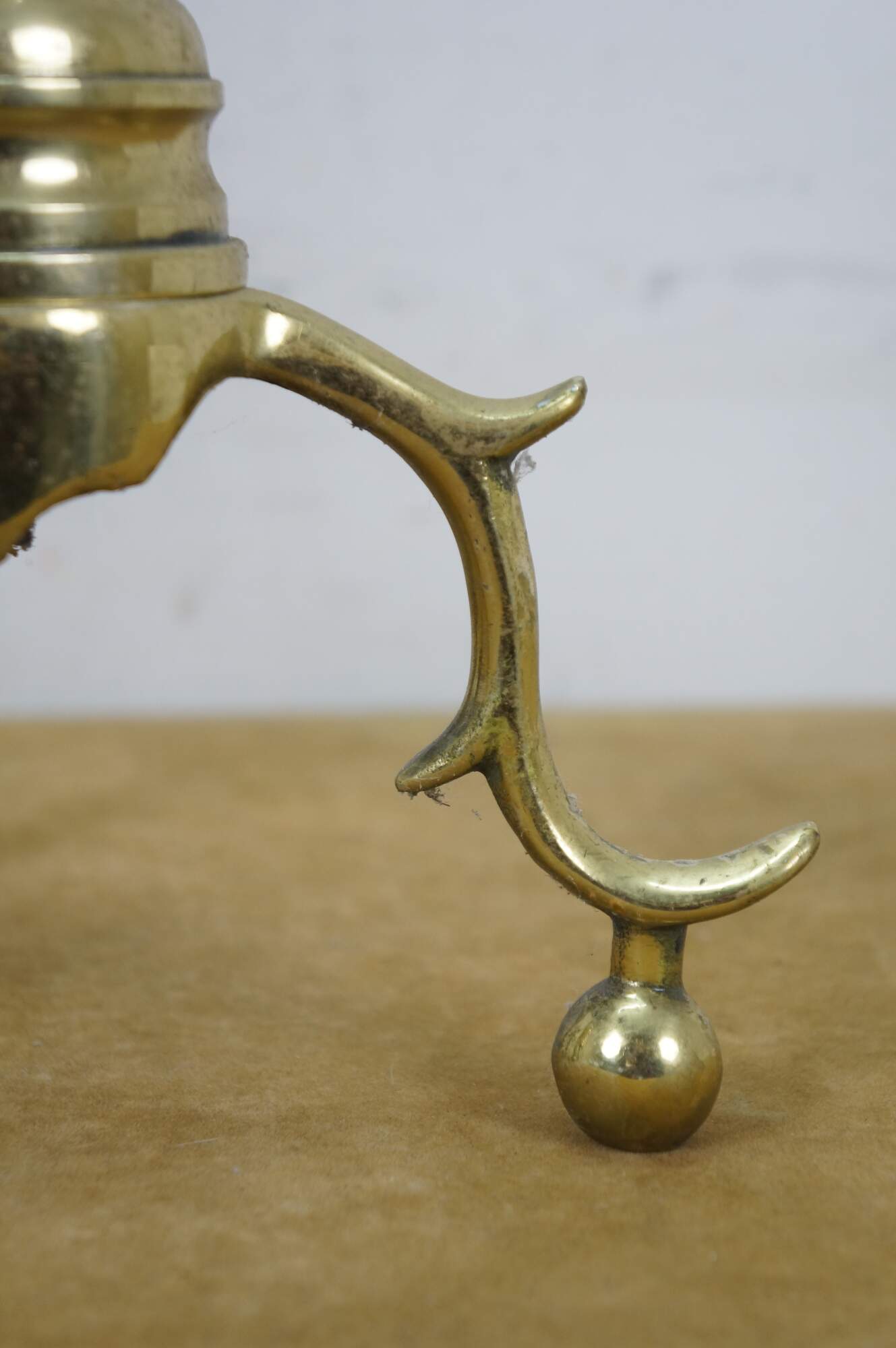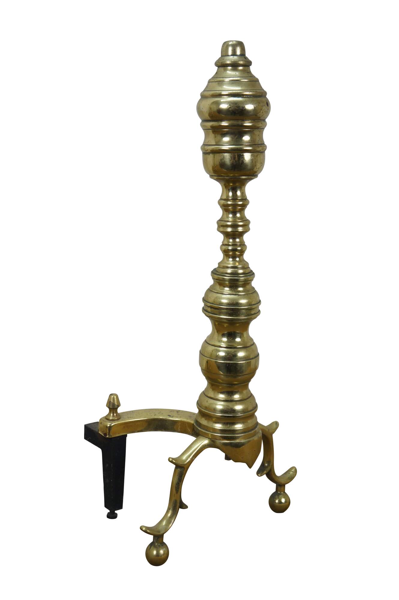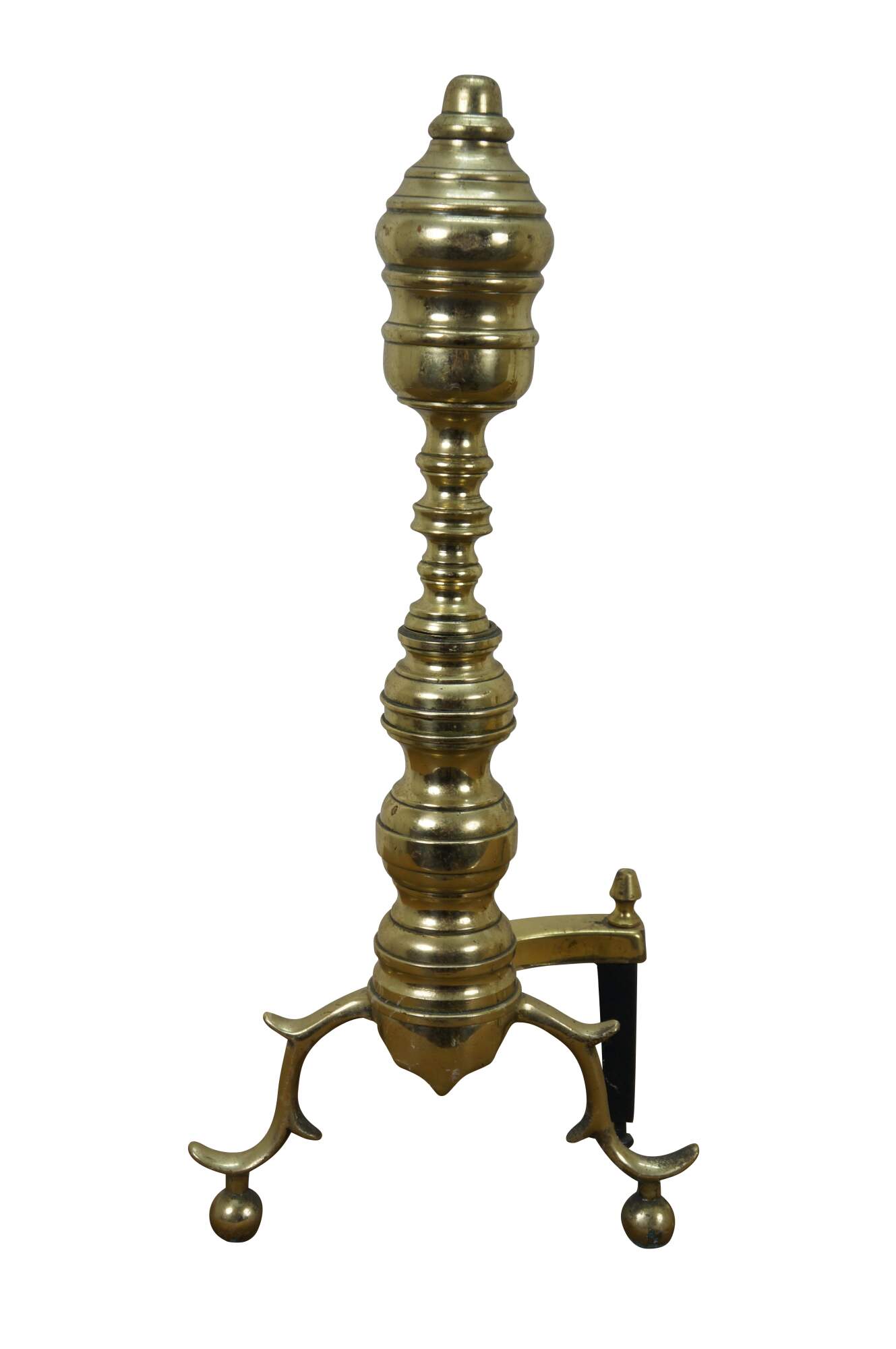Pair of antique brass Chippendale / Georgian / Colonial style andirons / fire dogs - beehive shaped baluster style posts on bowed legs with orb feet.