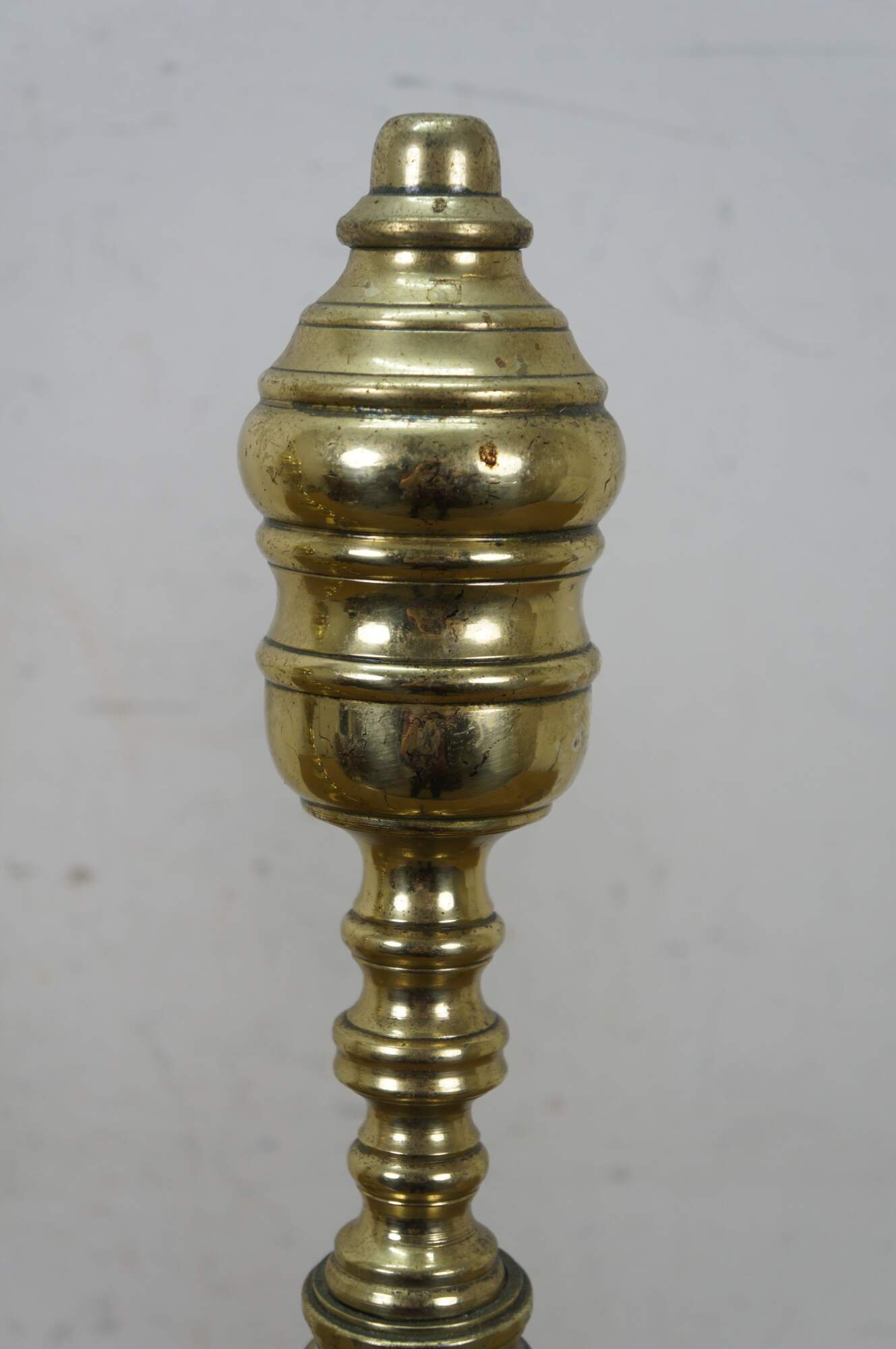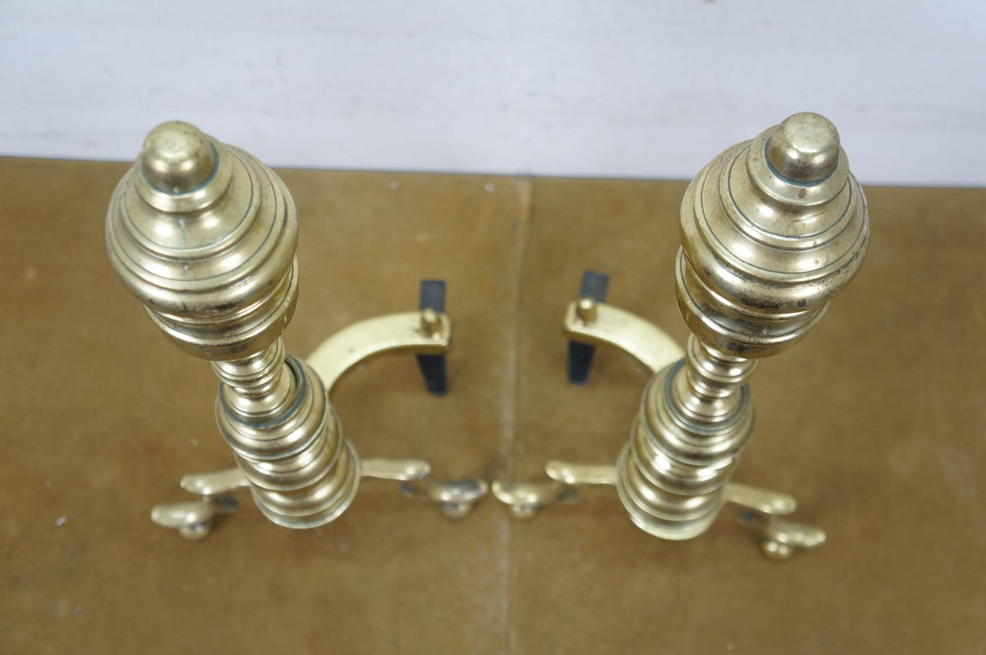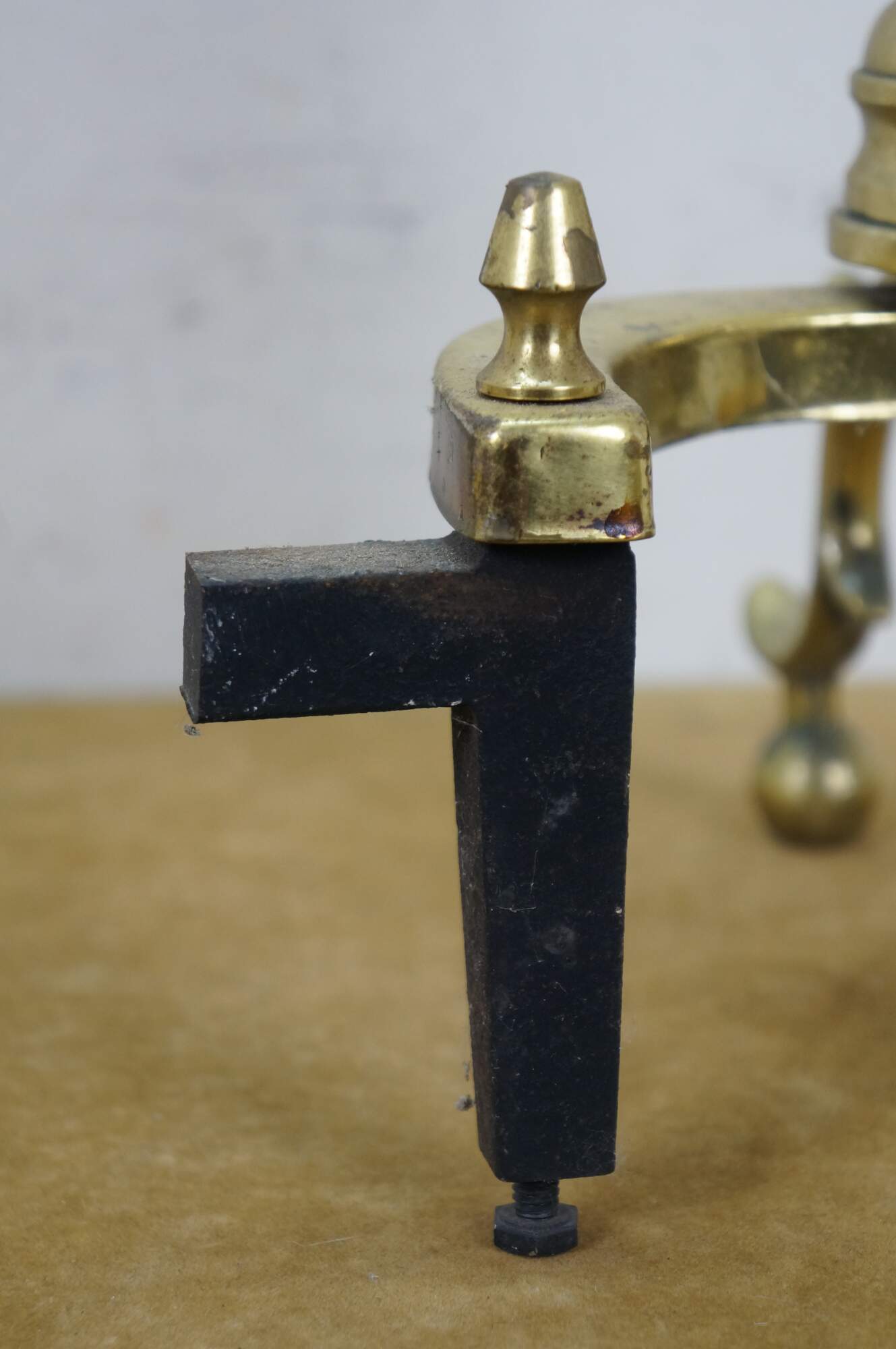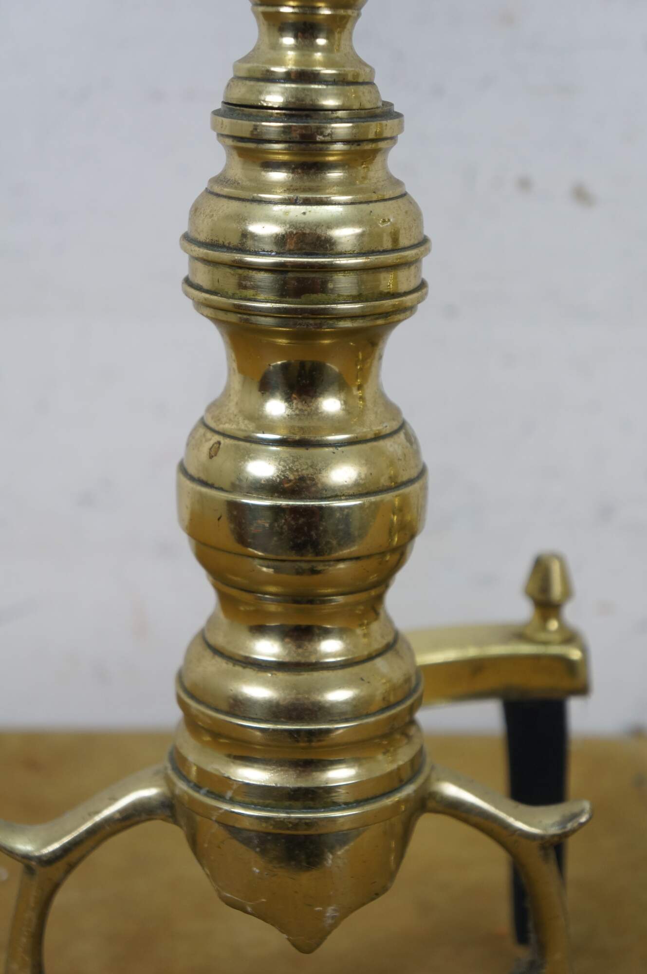 Pair of antique brass Chippendale / Georgian / Colonial style andirons / fire dogs - beehive shaped baluster style posts on bowed legs with orb feet.