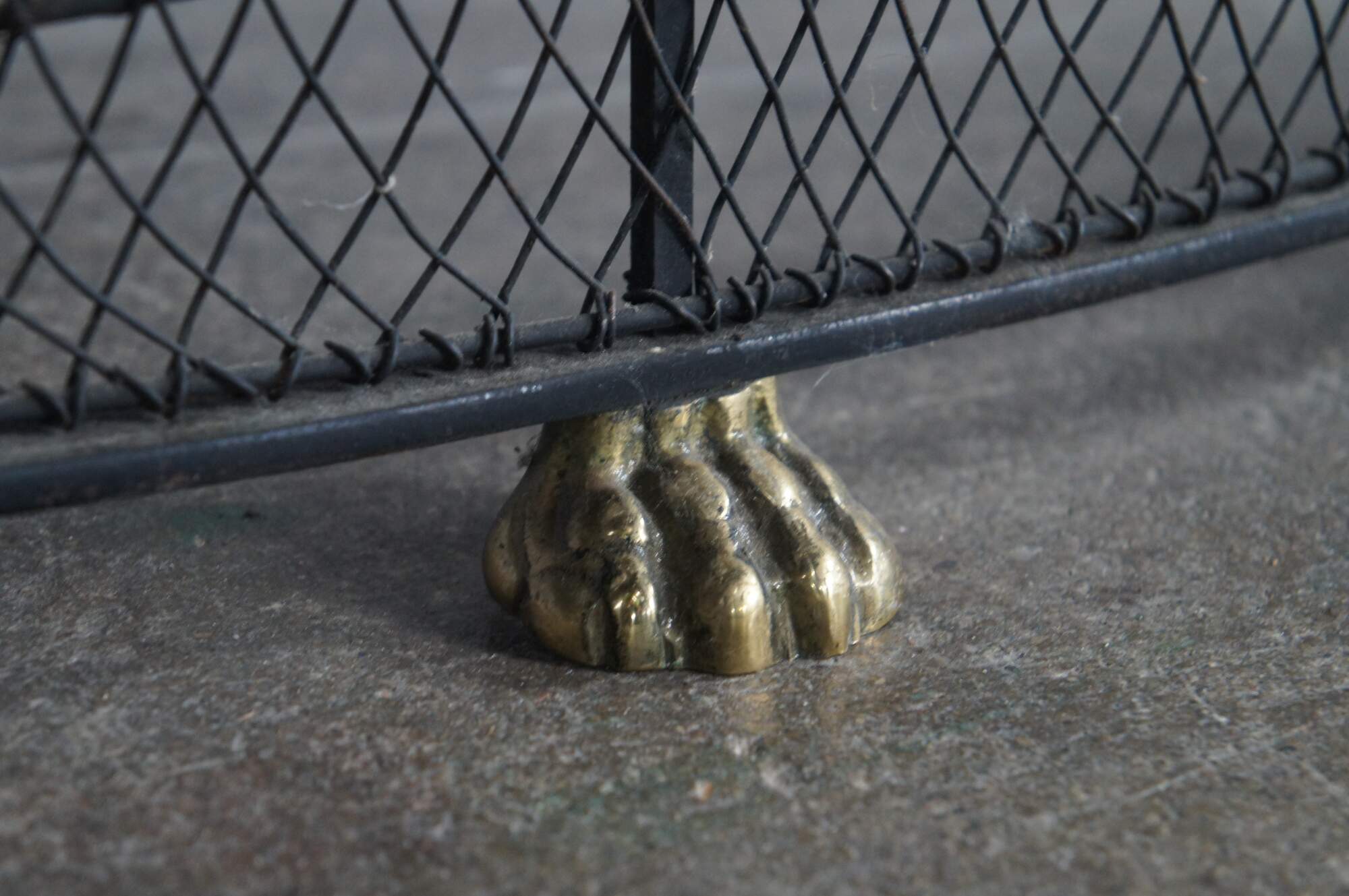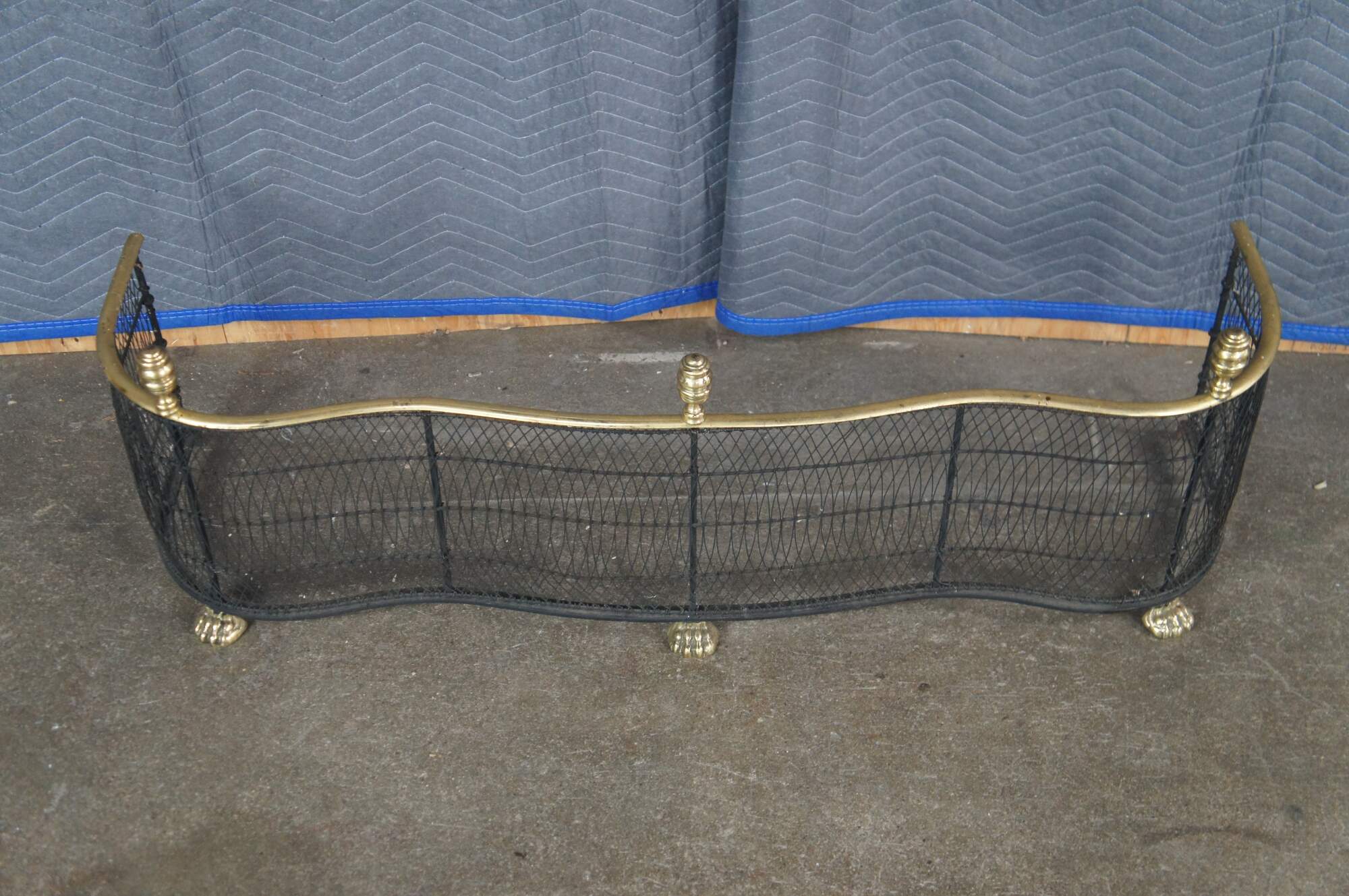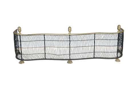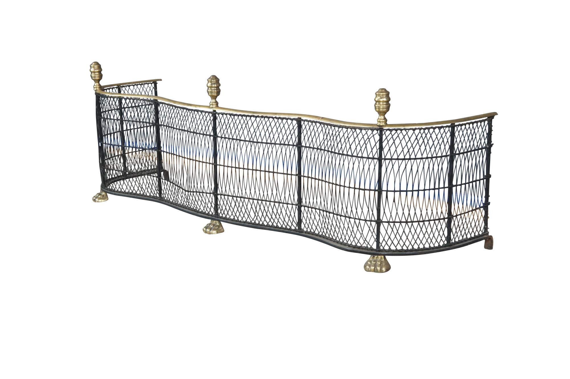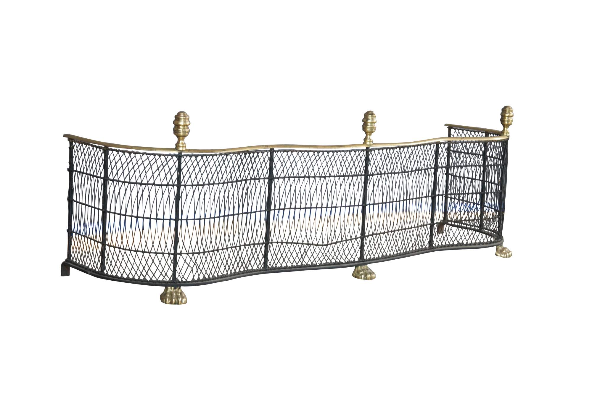 Virginia Metalcrafters Federal / Georgian style Fireplace Fender, Circa 1970s. Features a serpentine iron frame with curved lattice mesh accented by brass trim, finials and ornate paw feet. This fender offers a taller stature than most making for a stately addition to any space.