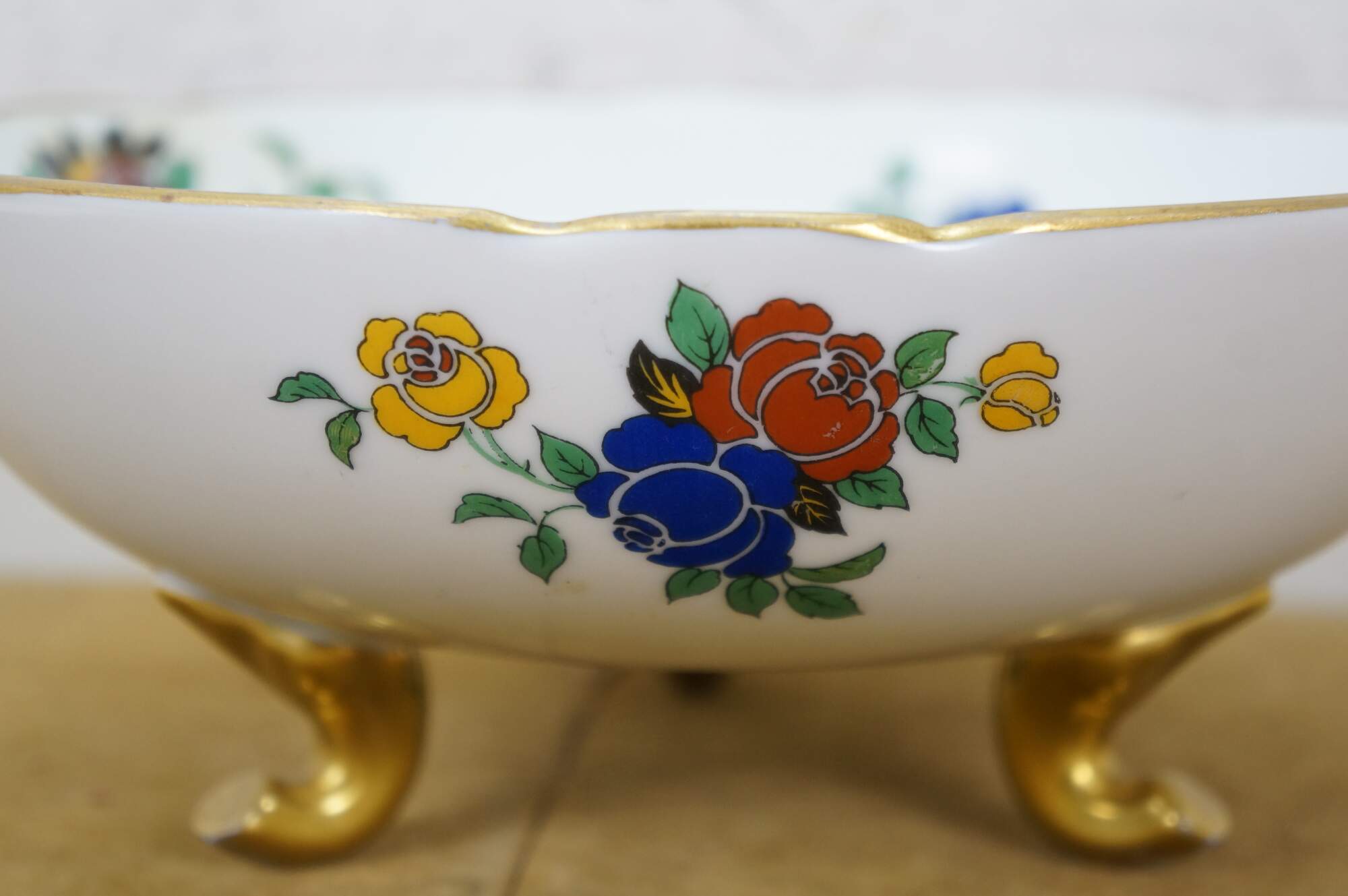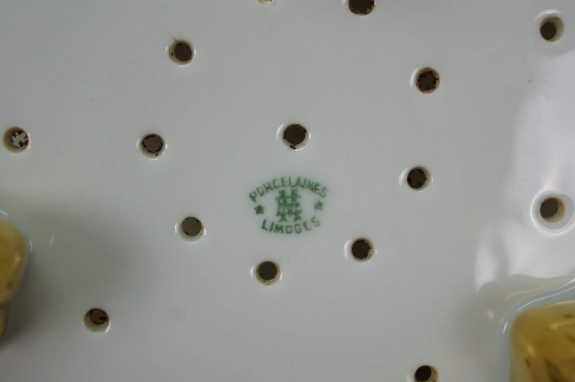 Antique Art Nouveau Limoges porcelain footed berry bowl with drain holes and underplate by Emil Madesclaire. White porcelain with gilt accents, printed with a stylized floral design of red, blue, and yellow roses.