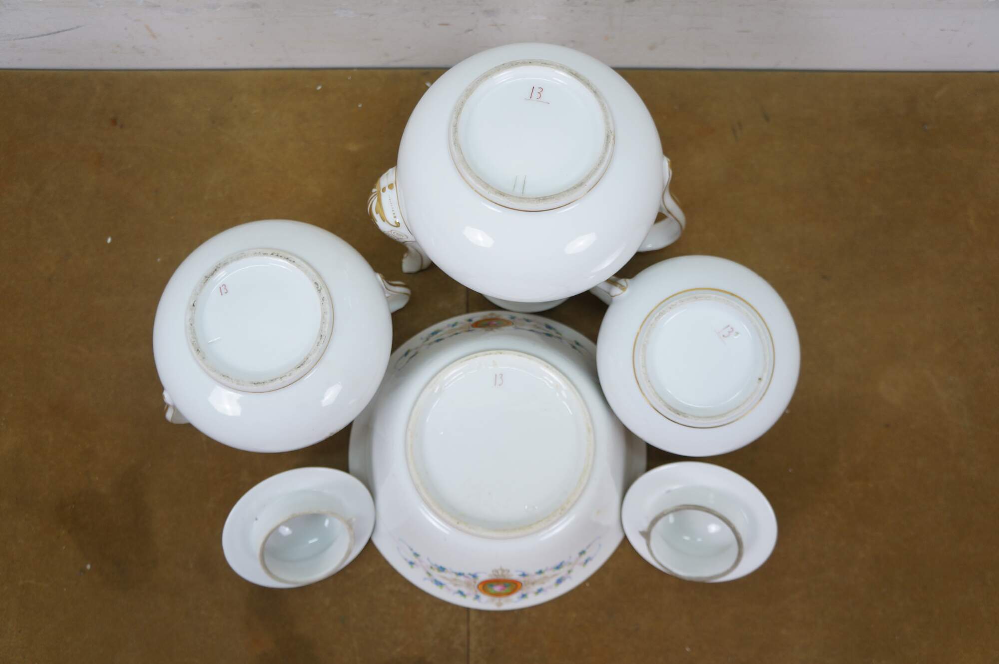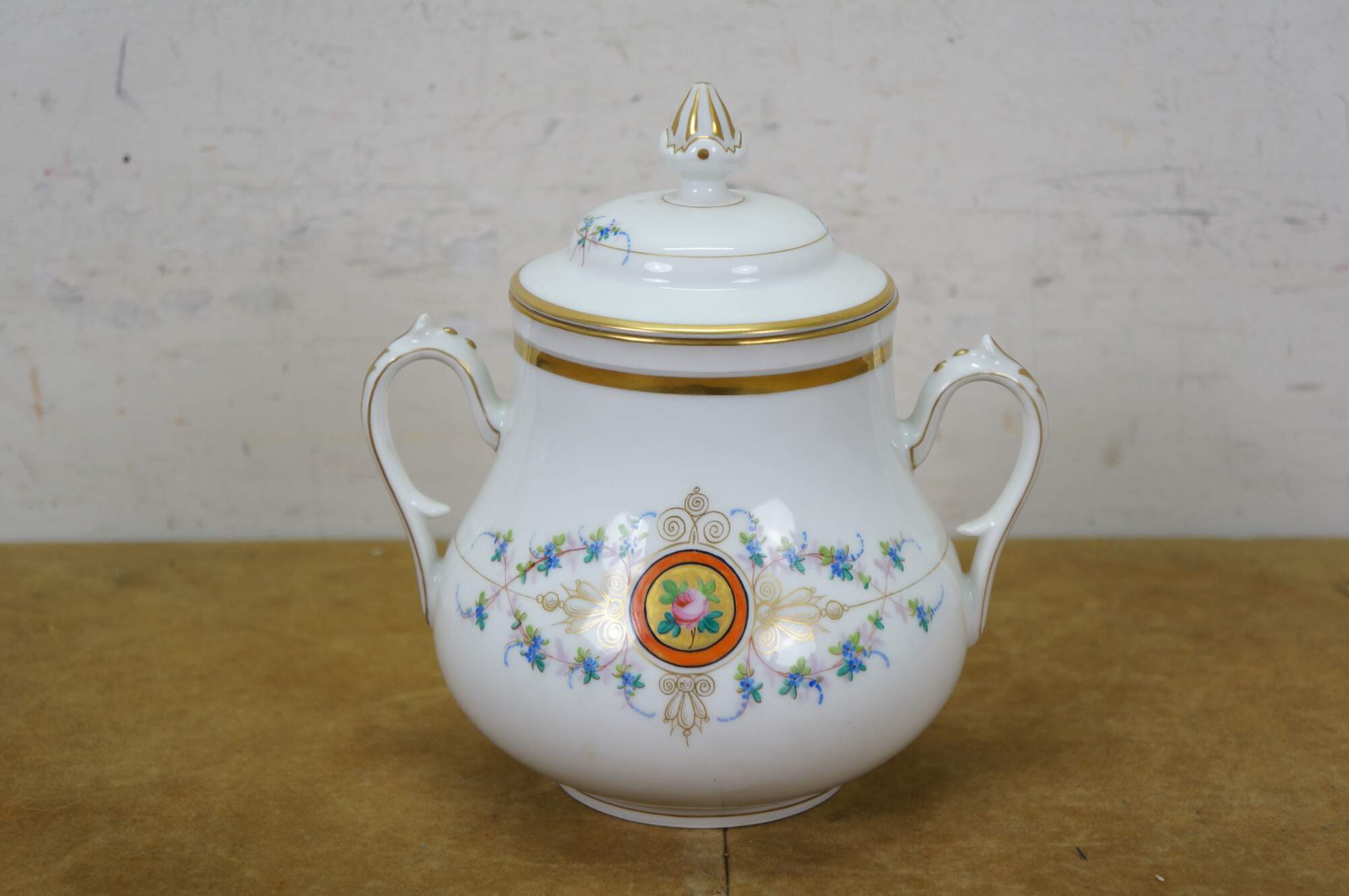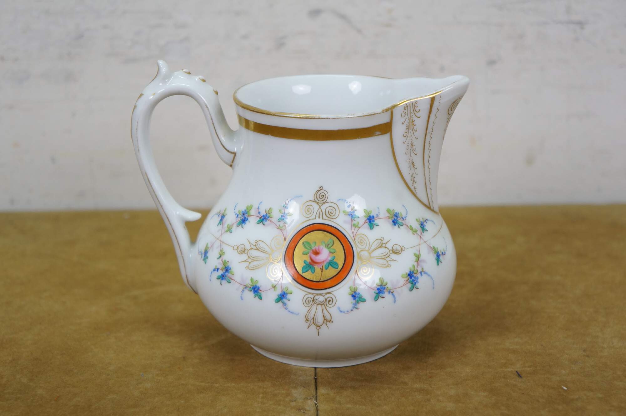 Antique 6 piece hand painted porcelain tea set. Decorated with pink roses on an orange and gold medallion, surrounded by swirling gilt and blue floral vines. Set includes: Teapot with Lid, Sugar Bowl with Lid, Creamer, and Serving Bowl. Marked 13 on bases.