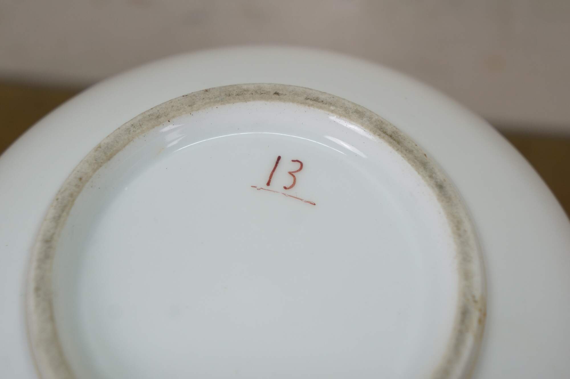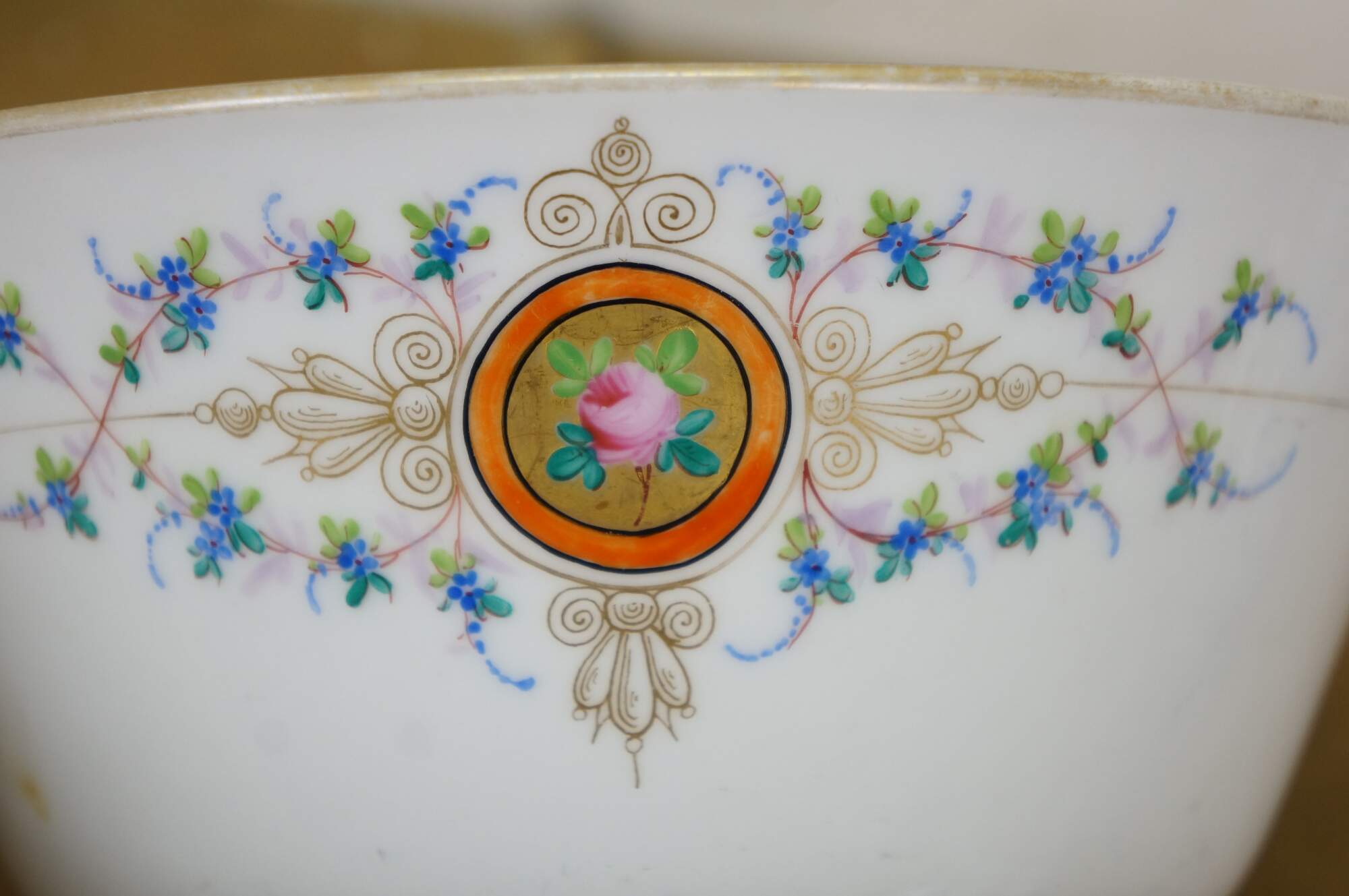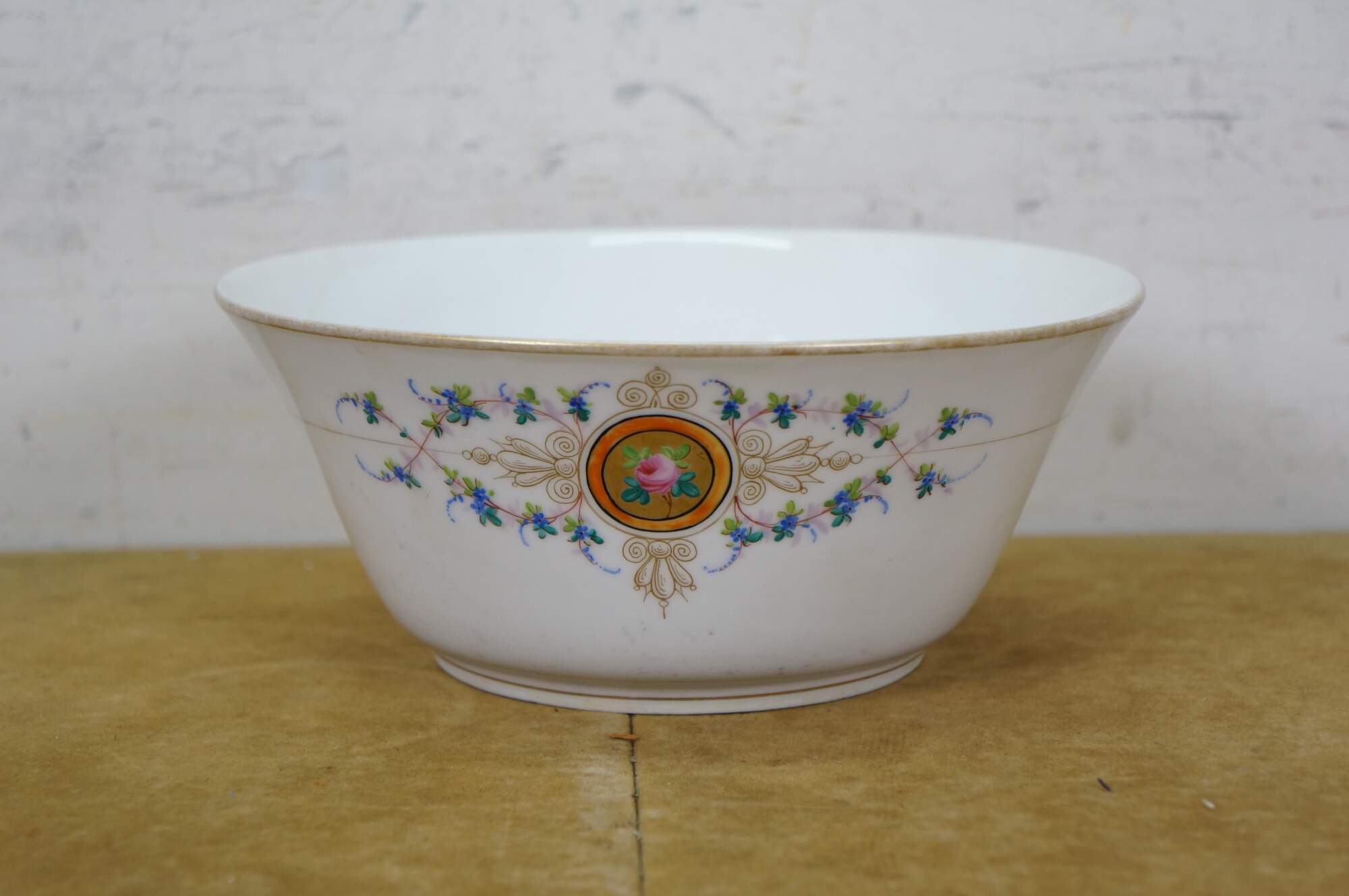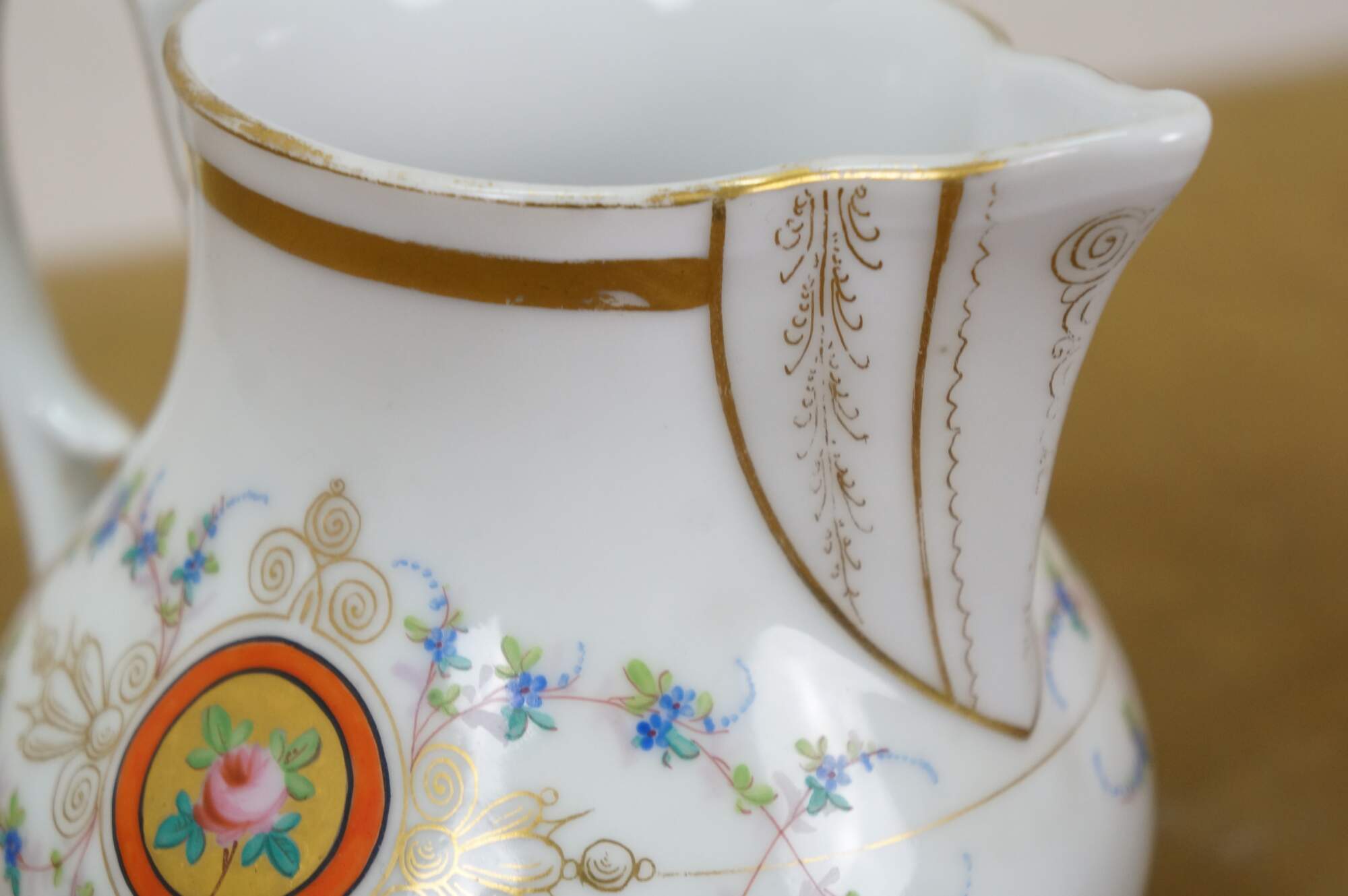 Antique 6 piece hand painted porcelain tea set. Decorated with pink roses on an orange and gold medallion, surrounded by swirling gilt and blue floral vines. Set includes: Teapot with Lid, Sugar Bowl with Lid, Creamer, and Serving Bowl. Marked 13 on bases.