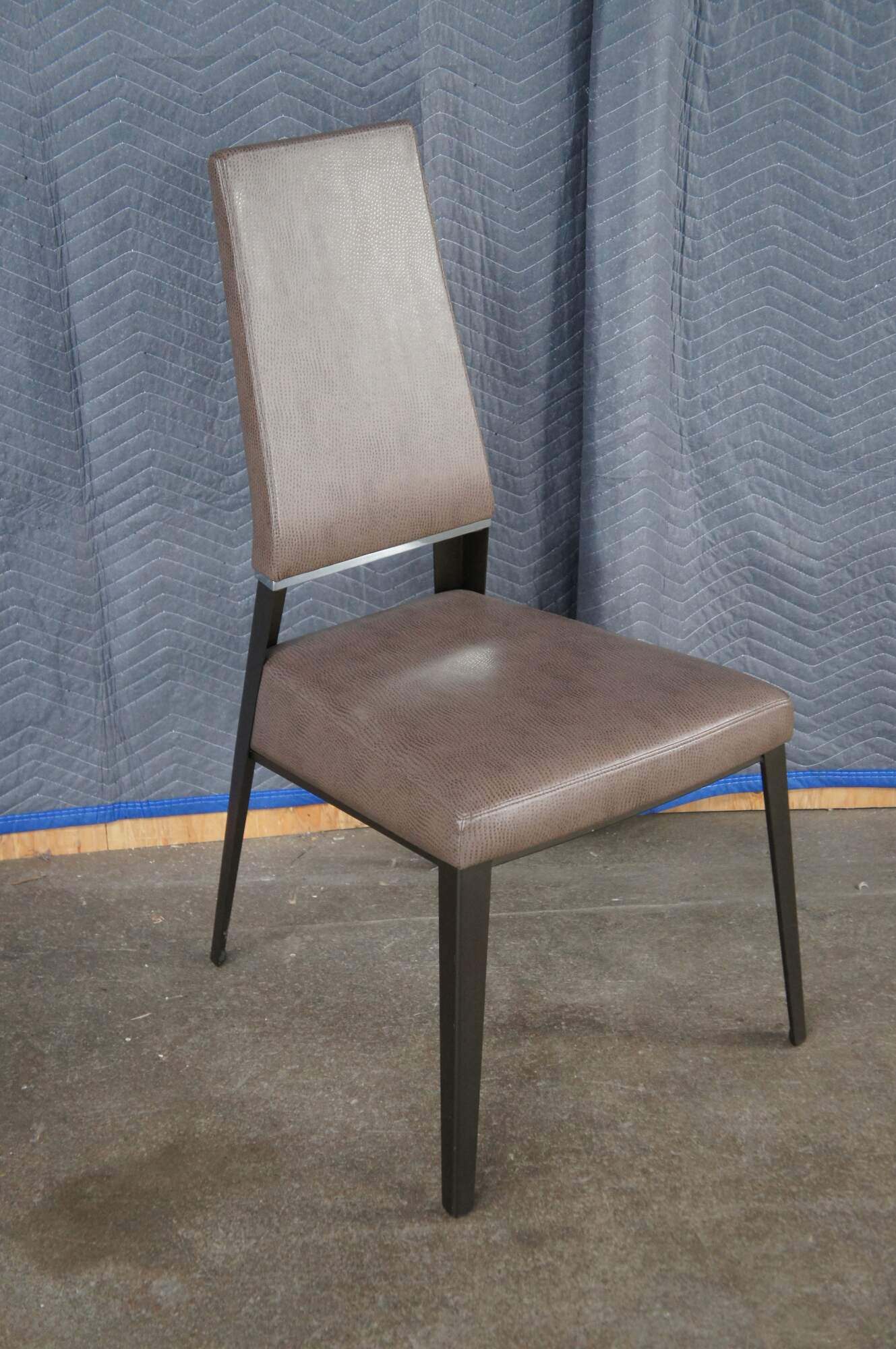 8 Elite Manufacturing Vivian Dining Chairs. Tall and elegant, with shapely tapered legs and just a hint of sparkle. Crisply tapered and tailored forms create a striking silhouette, while providing comfort and support. Vivians sparkle comes from a polished stripe of solid aluminum, which links the extra tall upholstered back with the sturdy steel frame. Upholstered in a brown faux ostrich leather. MSRP $10,000