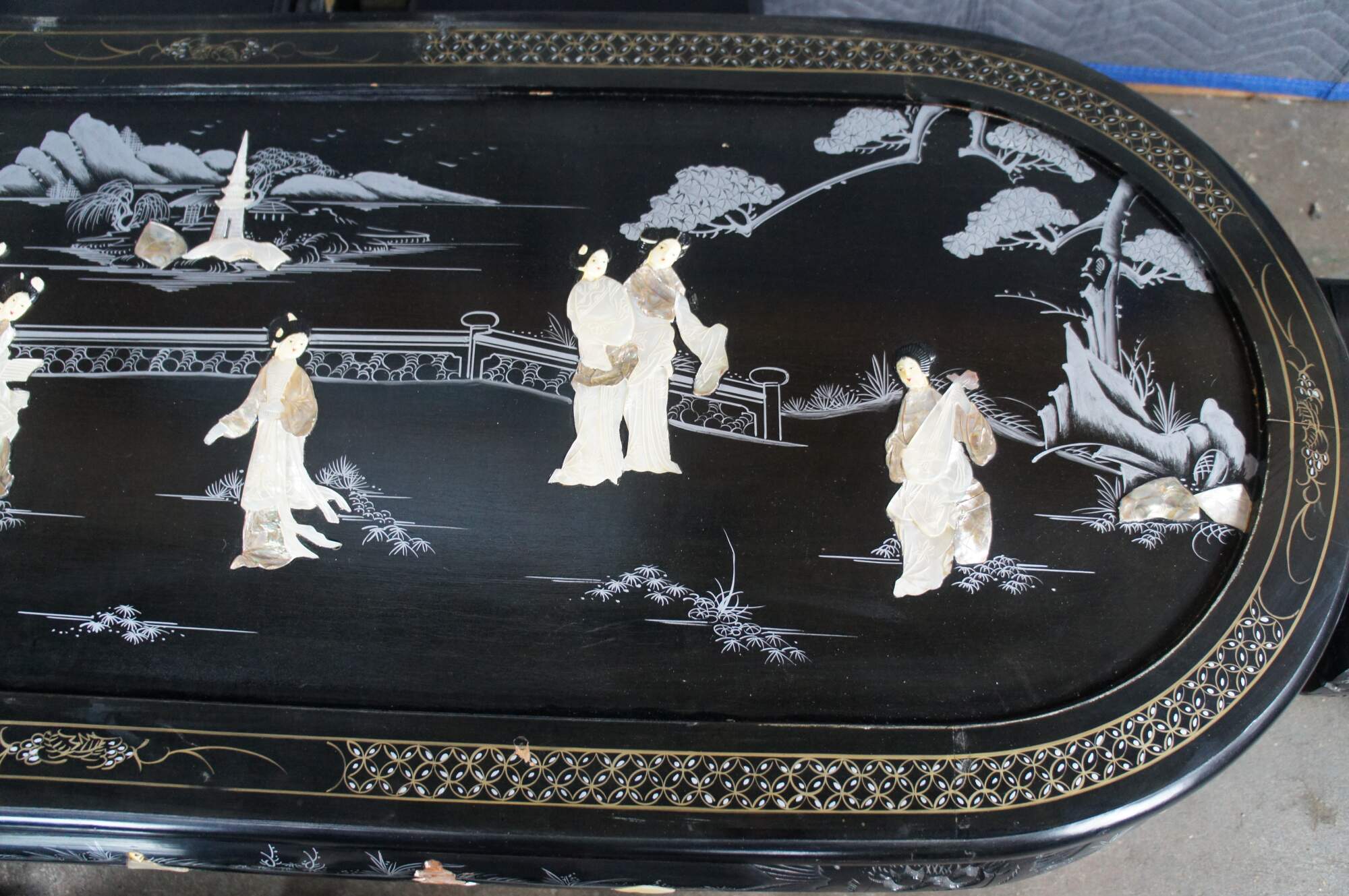Vintage Chinese Chinoiserie black lacquered coffee or tea nesting table with six chairs. It features a Pagoda landscape scene with carved soapstone and Mother of Pearl Geisha figures listening to a musician on the garden terrace, which overlooks mountains and an Island with a Temple. The table features a glass top and is supported by carved bat / dragon legs with claw foot. Made in Hong Kong.