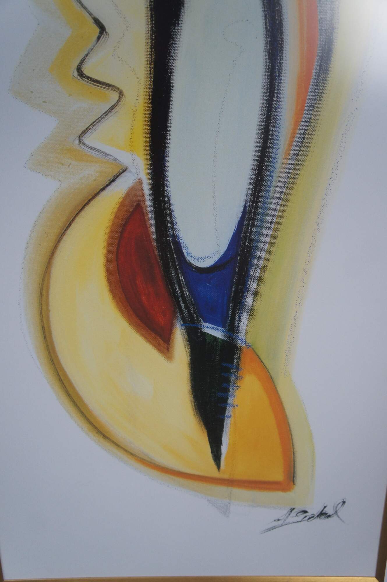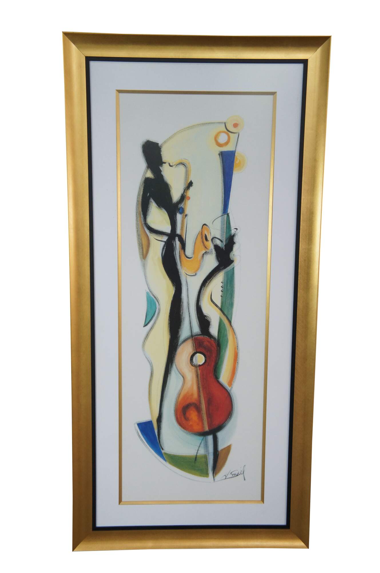 Large pair of Alfred Gockel prints. Each showcases a silhouette of a musician. Framed in gold.