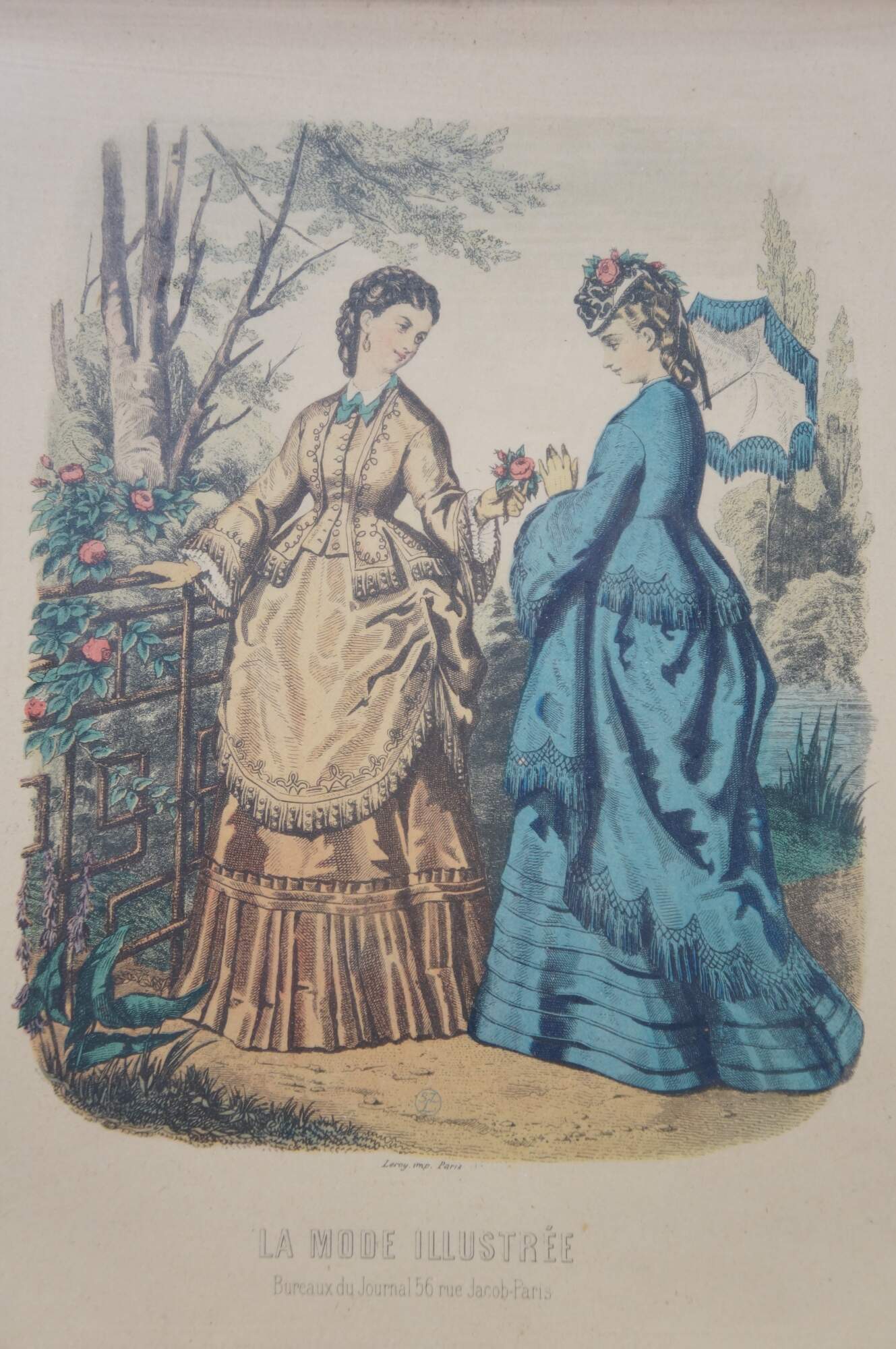 Pair of mid to late 19th century hand colored fashion etchings from Paris' La Mode Illustre magazine. Beveled wood frames.
