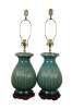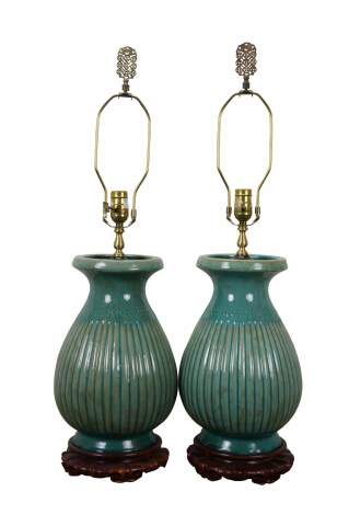 Pair of late 20th century chinoiserie table lamps by Windermere Lamps, a Division of Lotus Arts LLC. Mottled turquoise porcelain vase or mantel urn shaped bodies on carved wood bases. Includes harps and stacked coin design brass finials.
