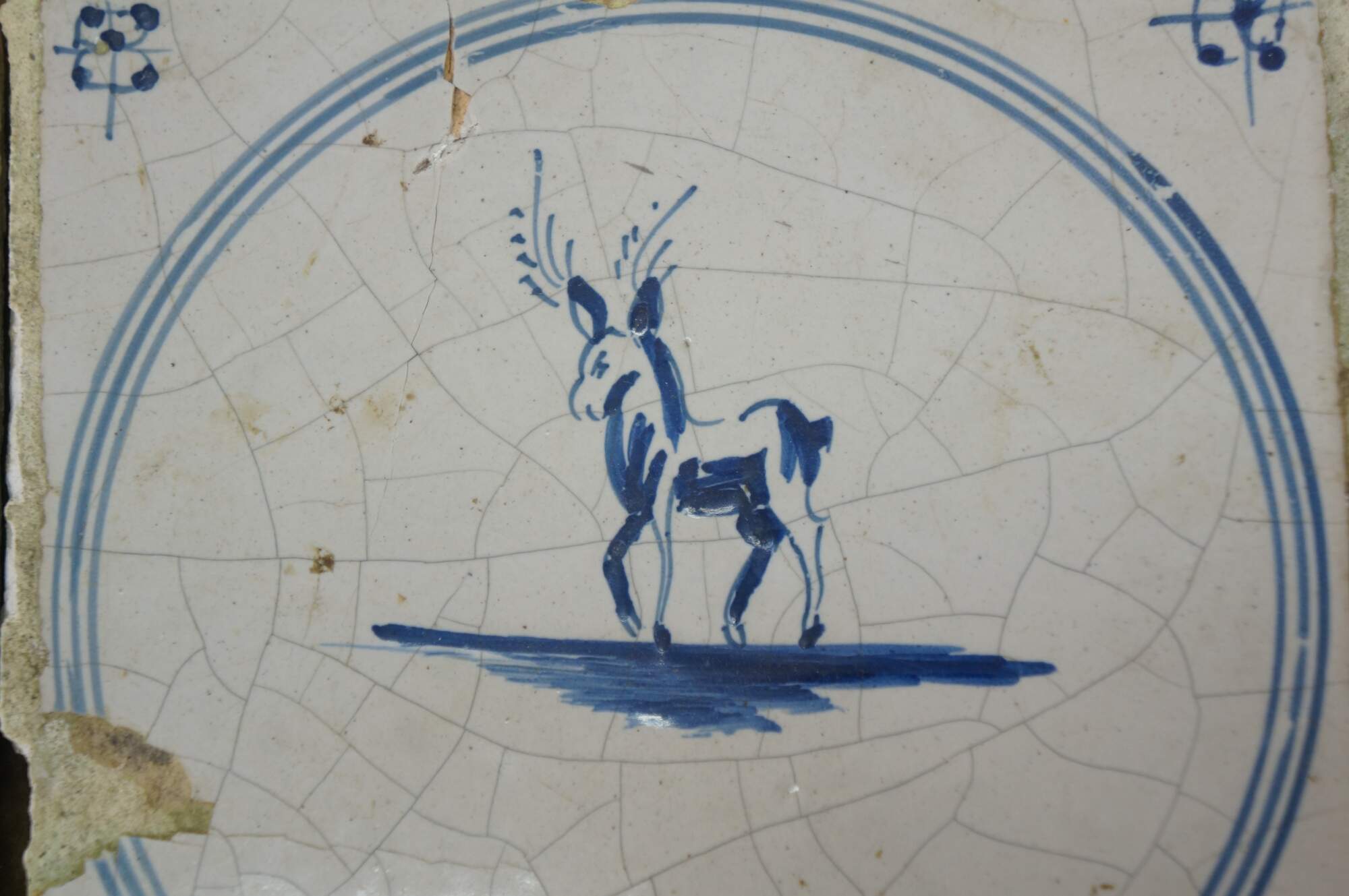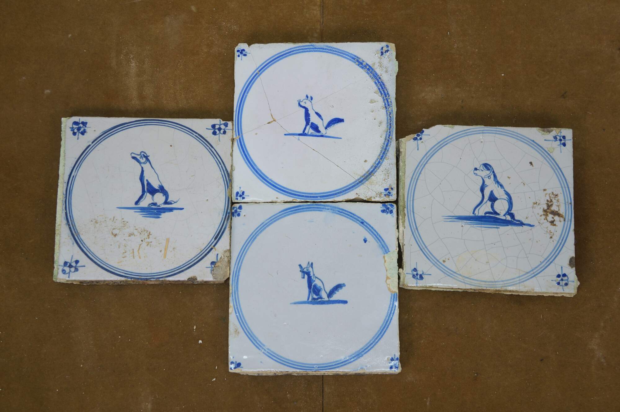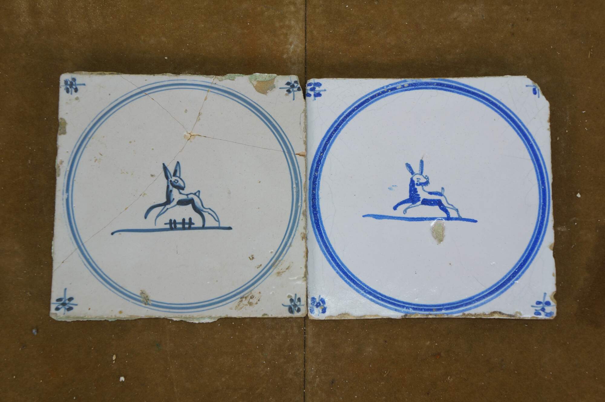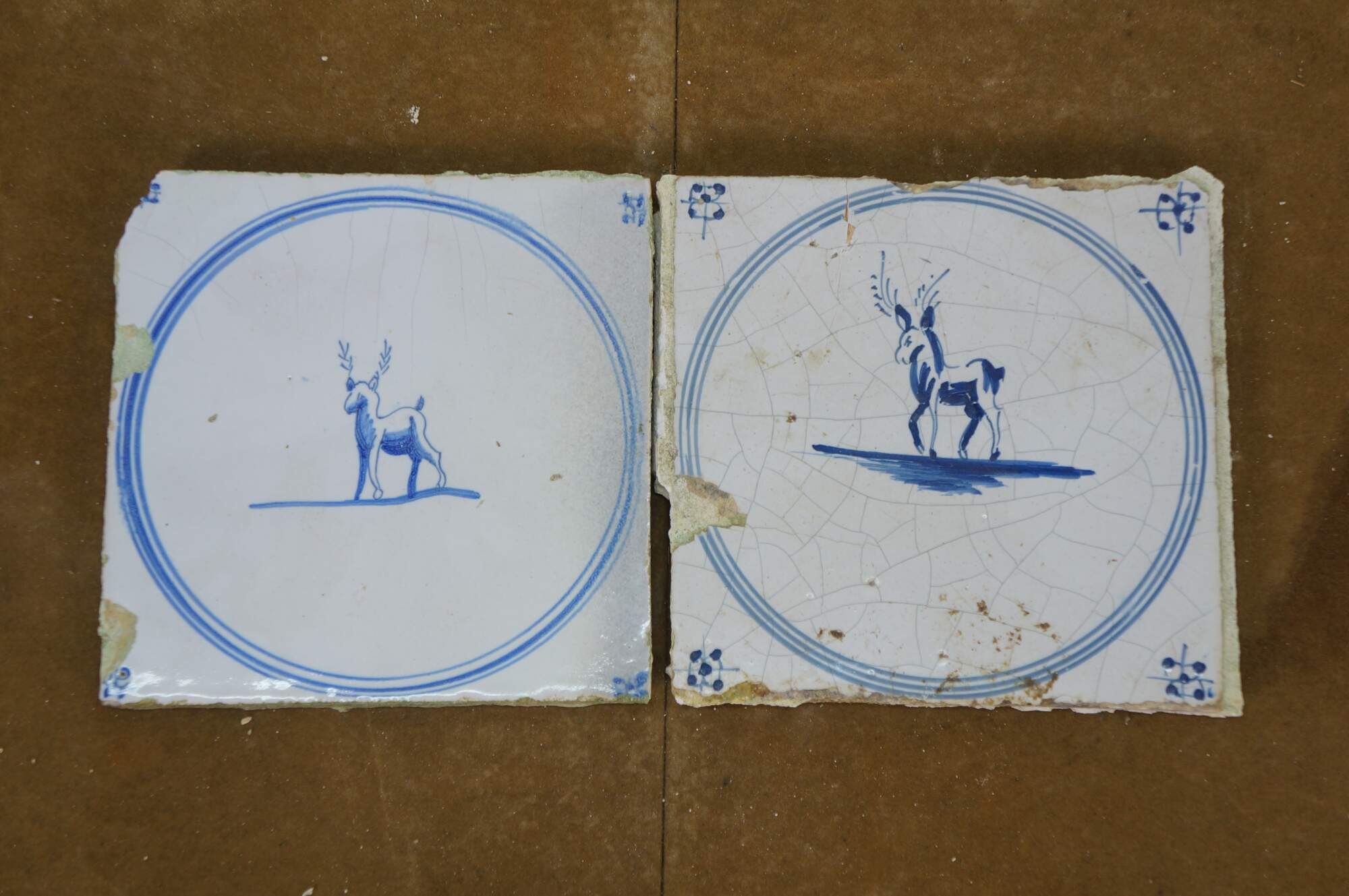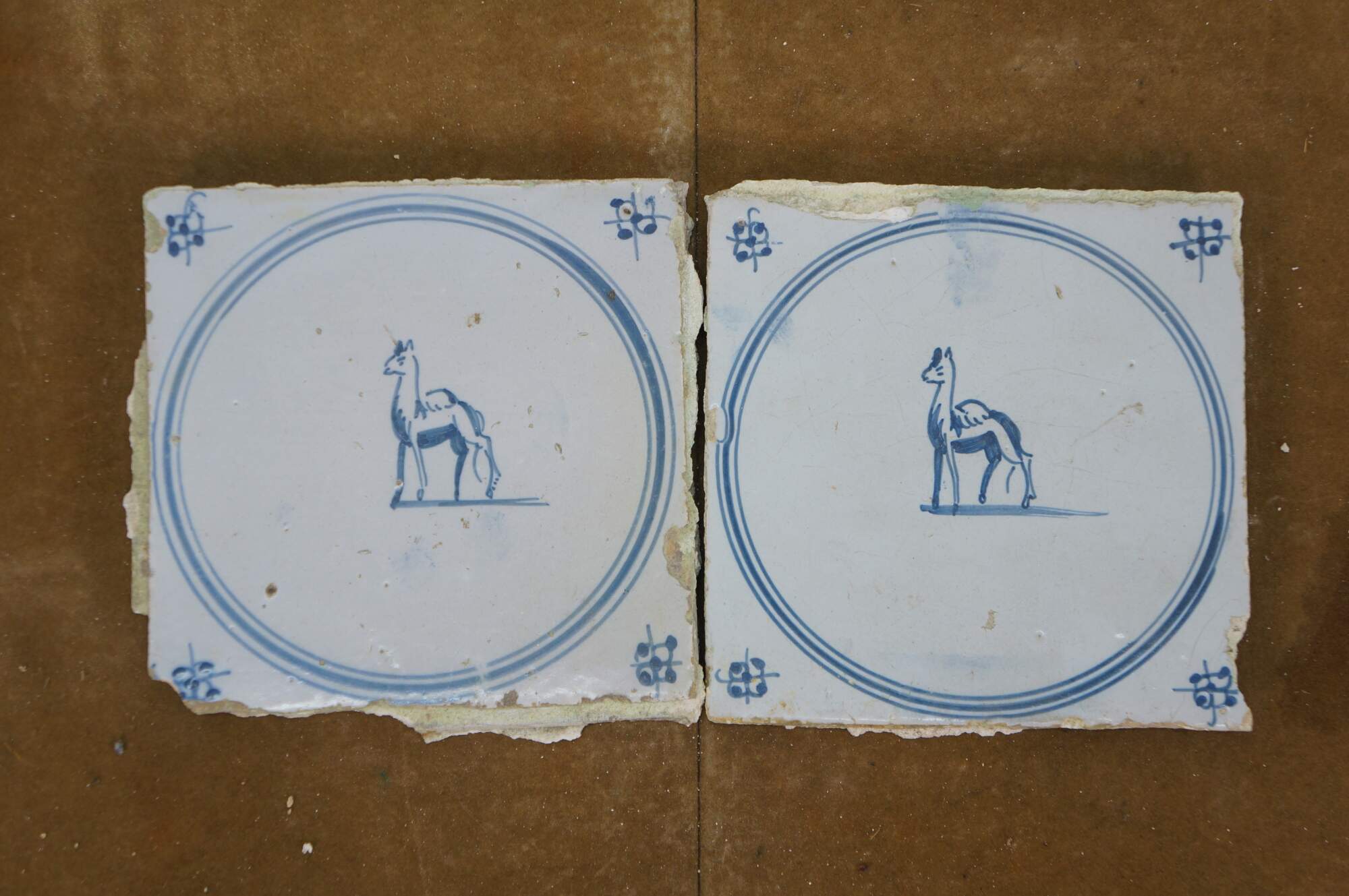 Lot of 39 antique 18th Century blue and white ceramic Delft tiles. The majority feature a circle design around various animals including rabbits, dogs/hounds/fox, deer/stag, horse, camels, and cows/bulls. Four are diagonally bisected in blue and white, and four form a flower or star design, depending on arrangement.
