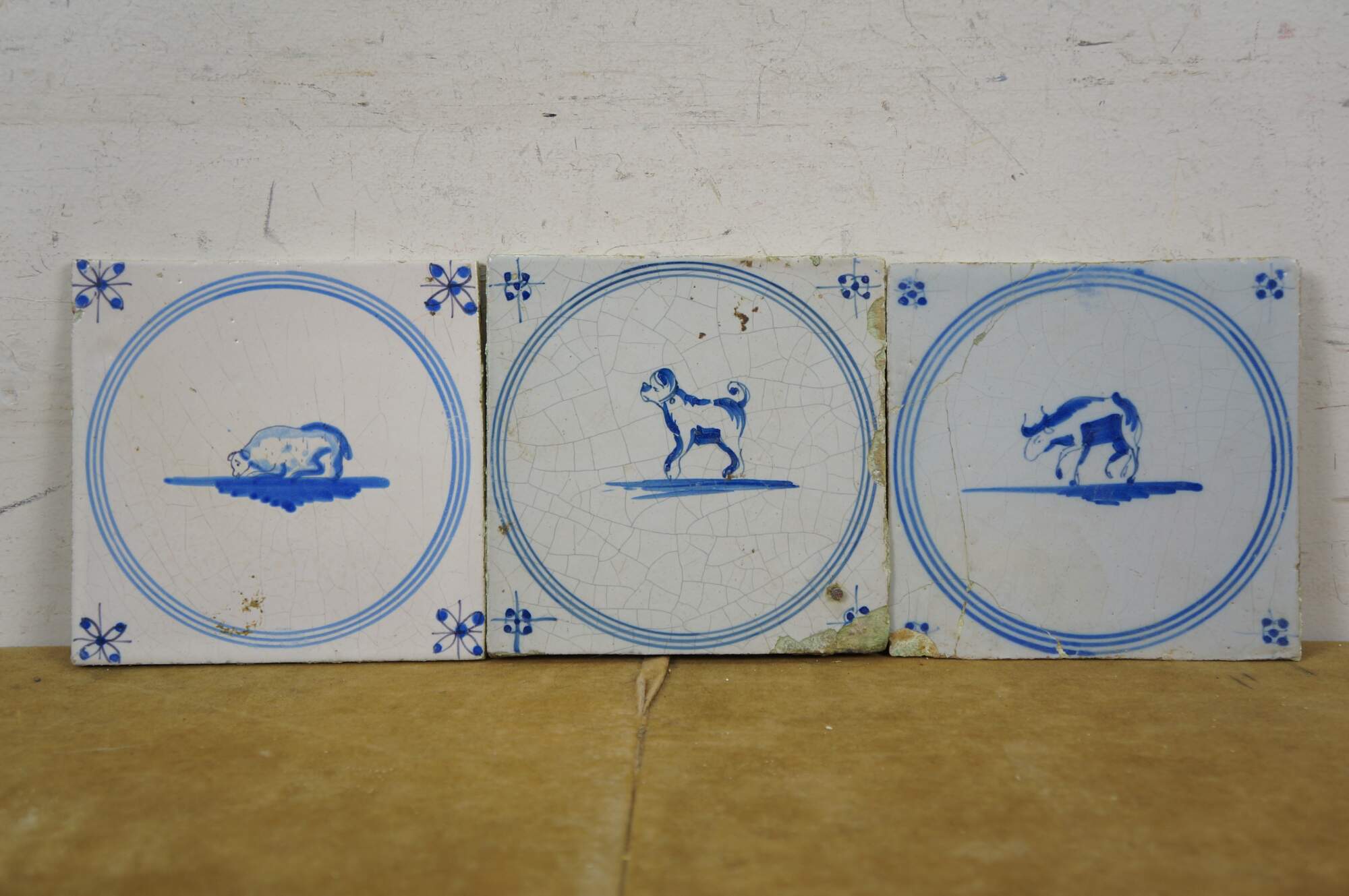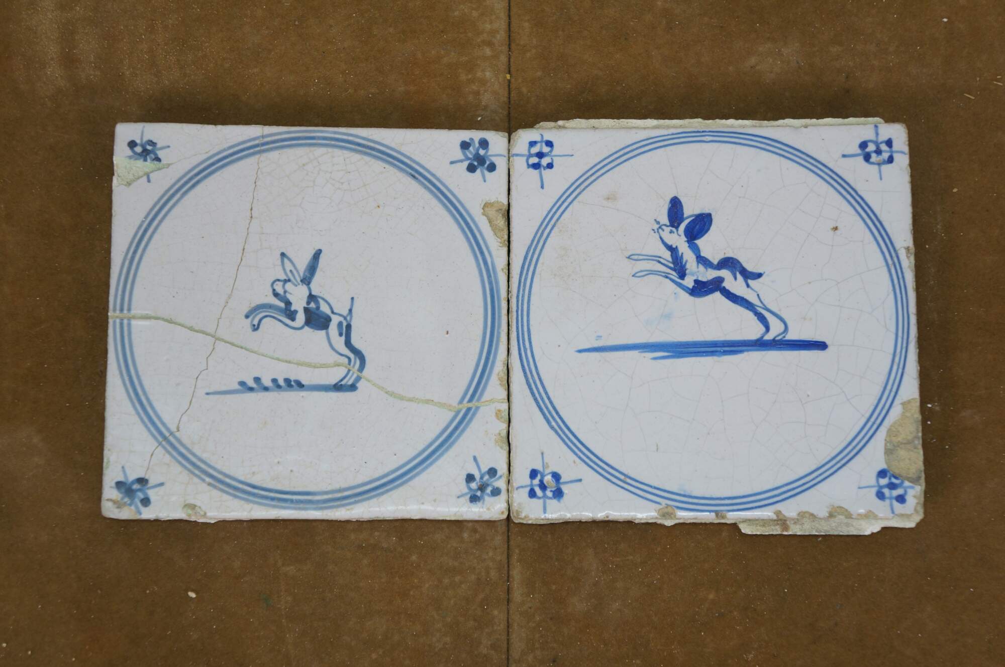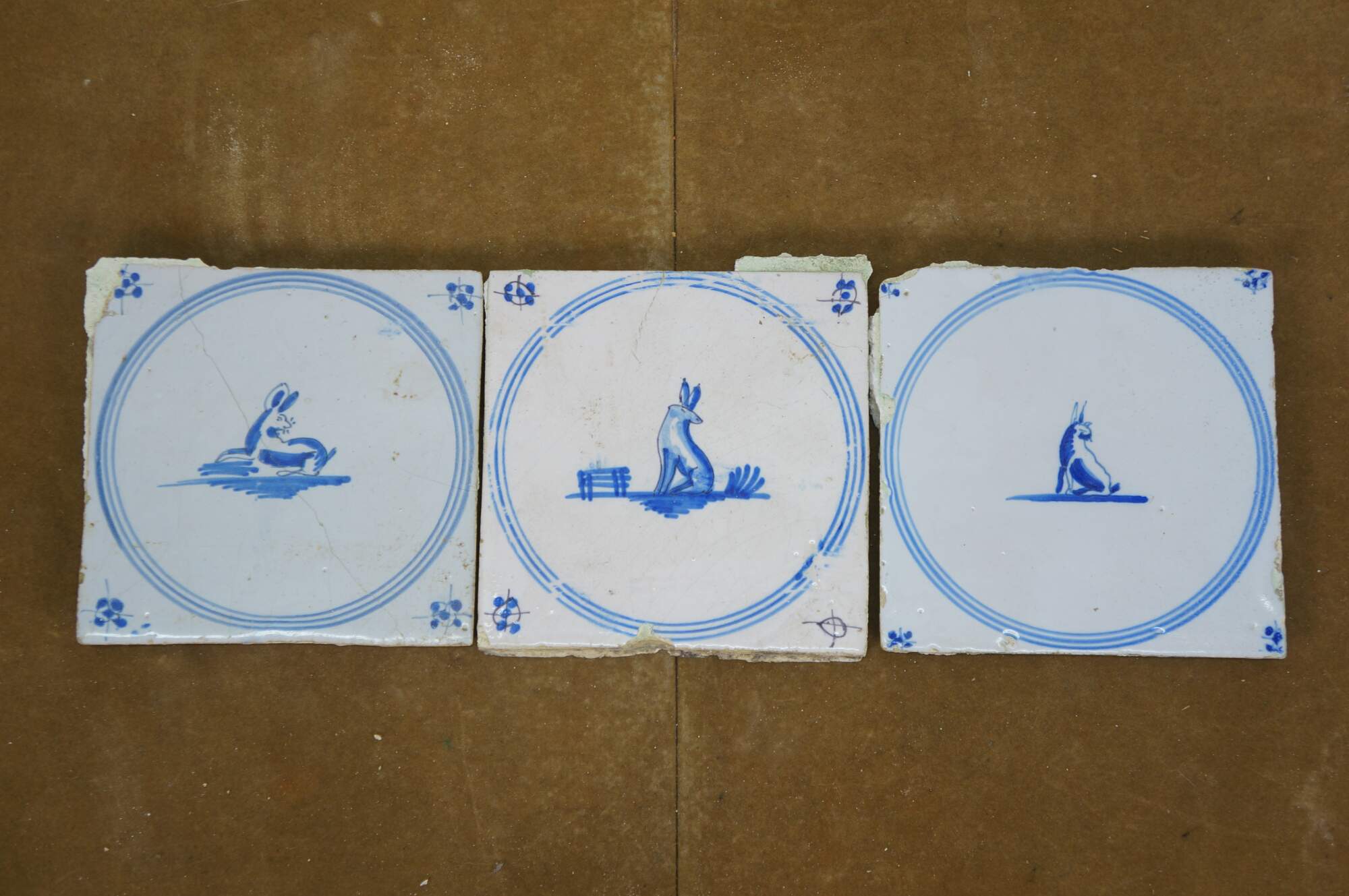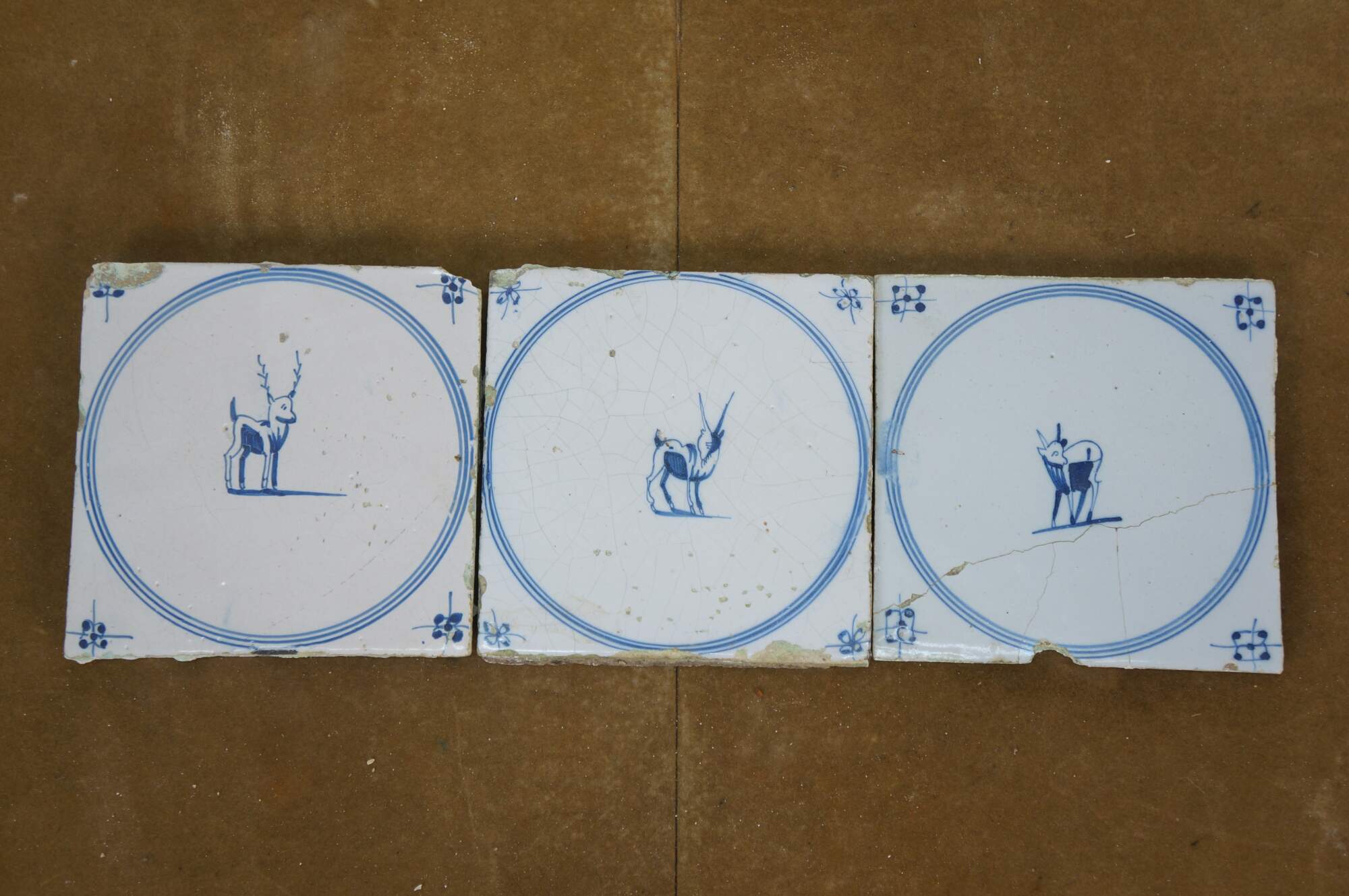 Lot of 39 antique 18th Century blue and white ceramic Delft tiles. The majority feature a circle design around various animals including rabbits, dogs/hounds/fox, deer/stag, horse, camels, and cows/bulls. Four are diagonally bisected in blue and white, and four form a flower or star design, depending on arrangement.