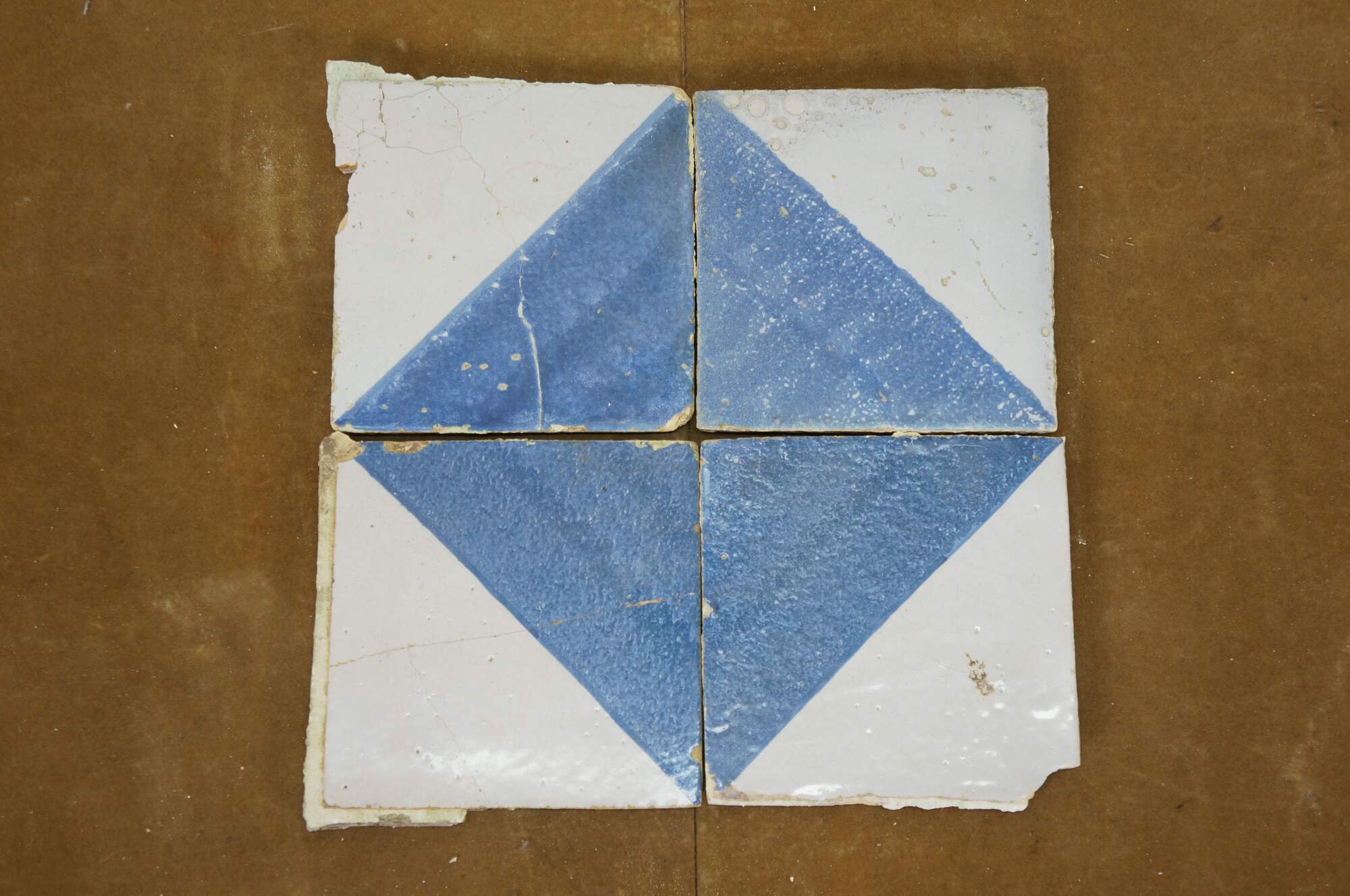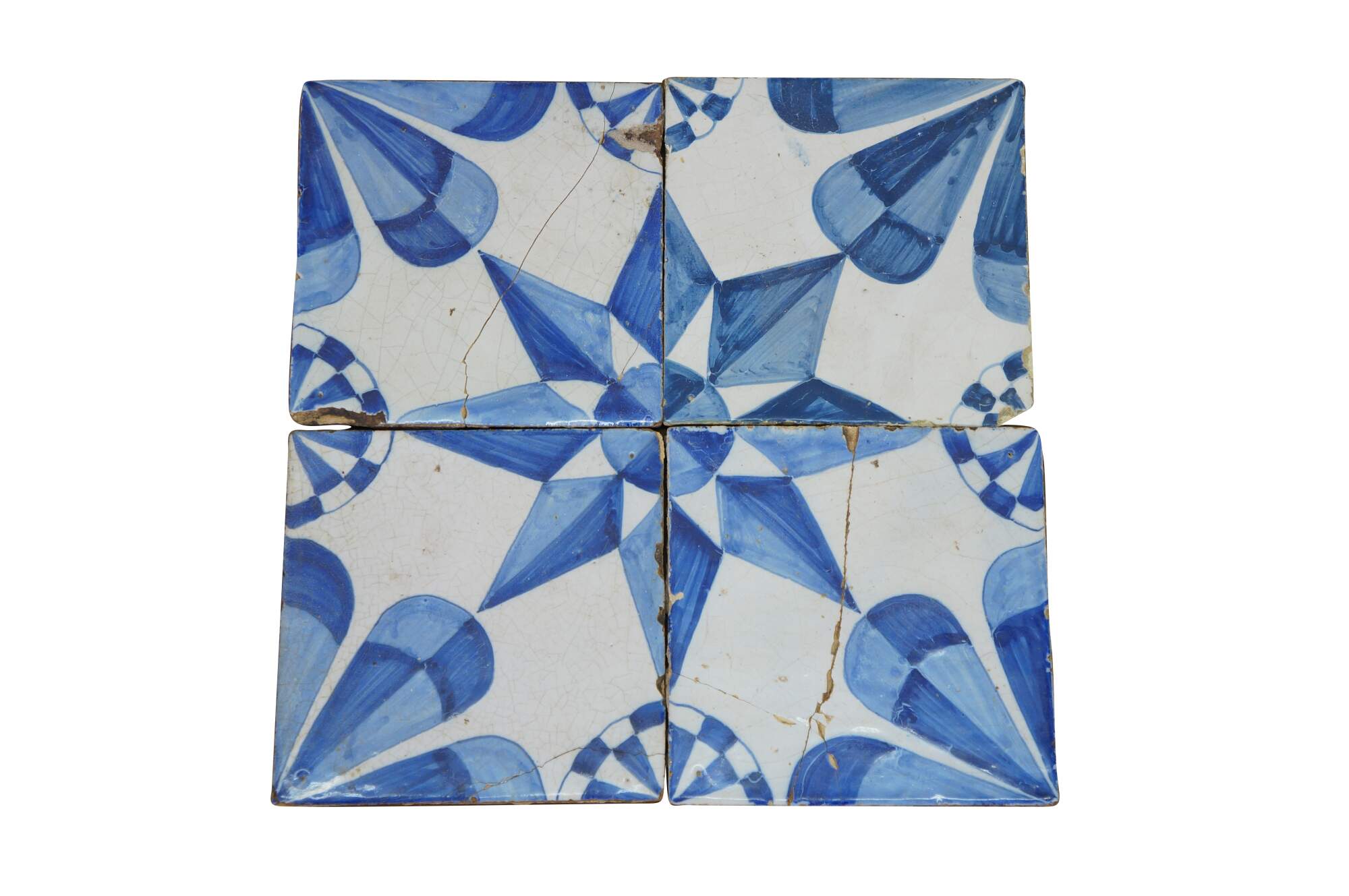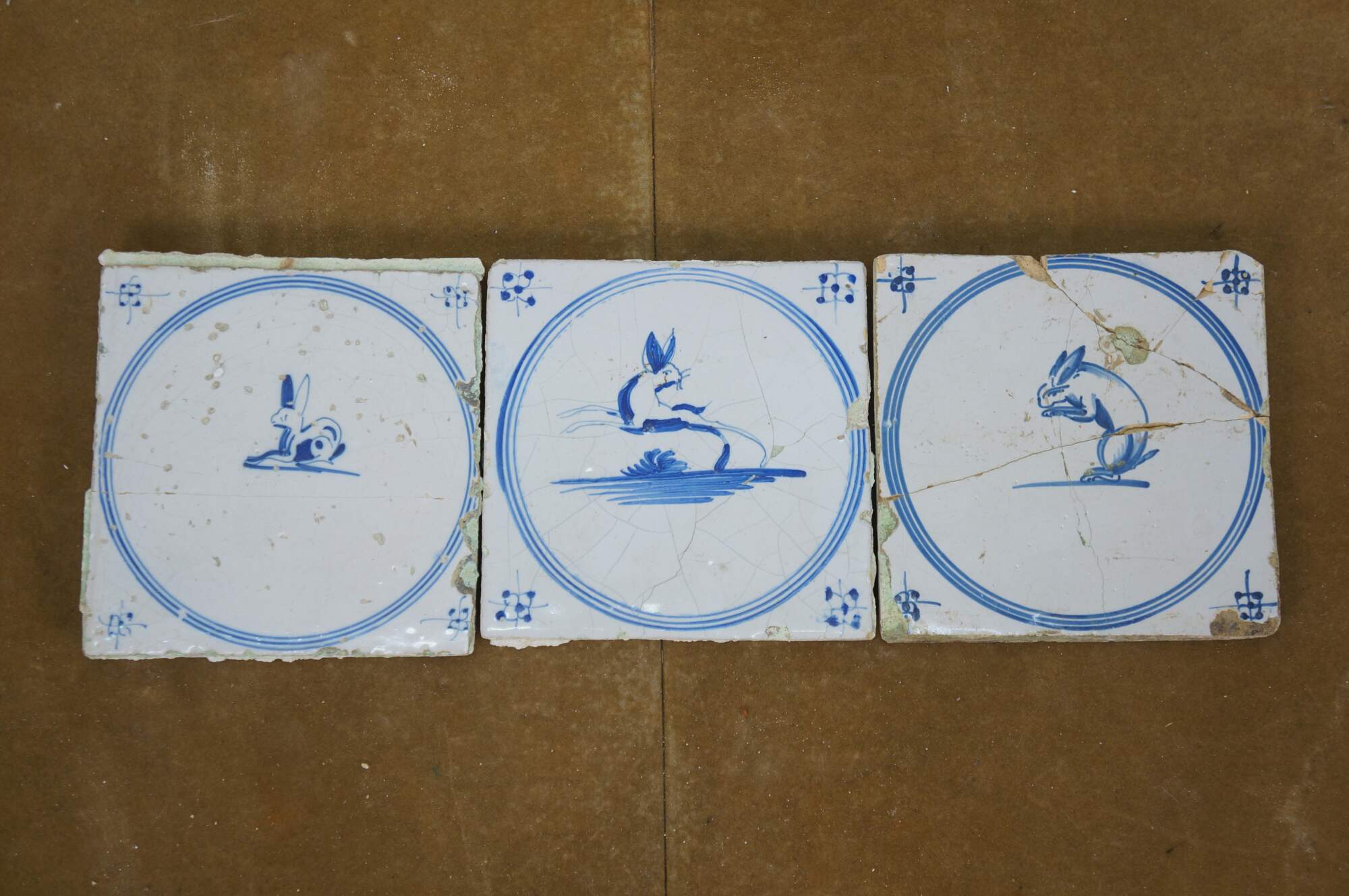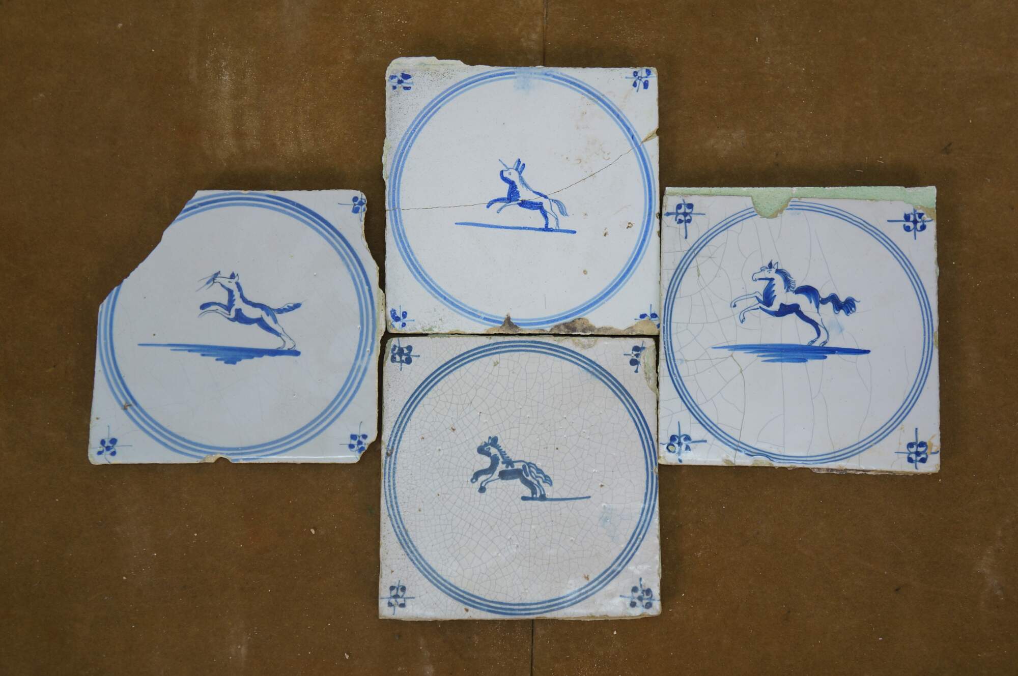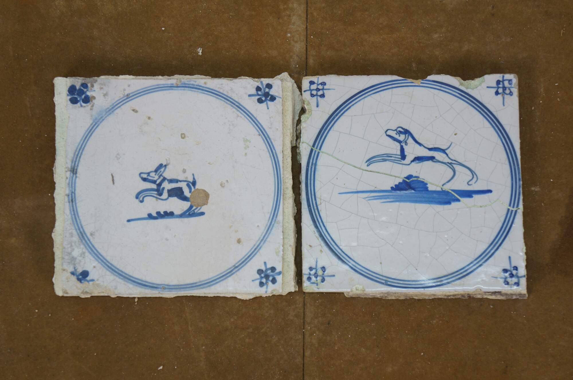 Lot of 39 antique 18th Century blue and white ceramic Delft tiles. The majority feature a circle design around various animals including rabbits, dogs/hounds/fox, deer/stag, horse, camels, and cows/bulls. Four are diagonally bisected in blue and white, and four form a flower or star design, depending on arrangement.