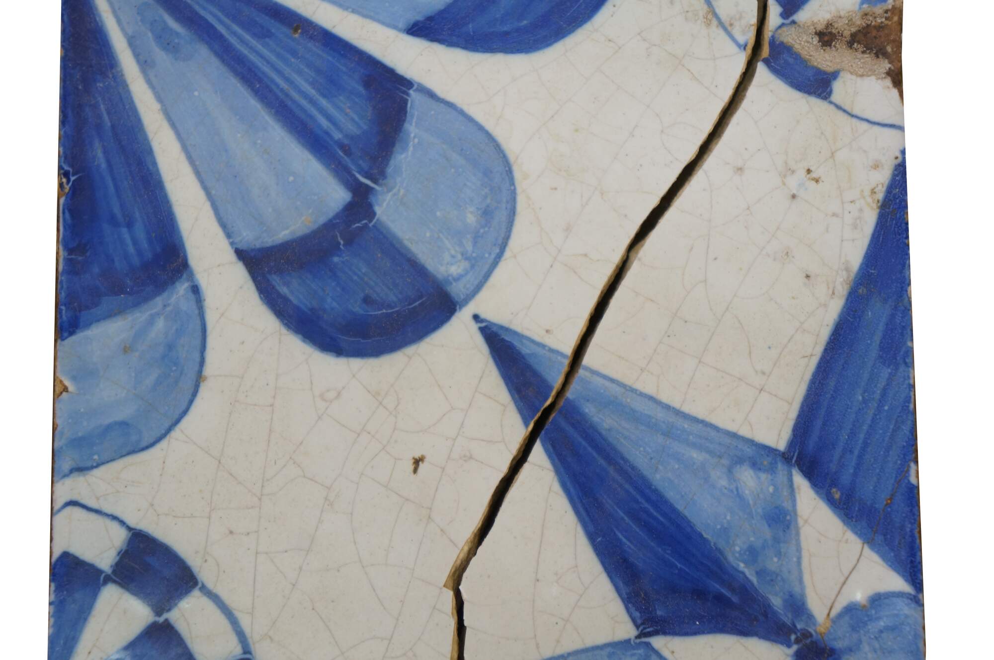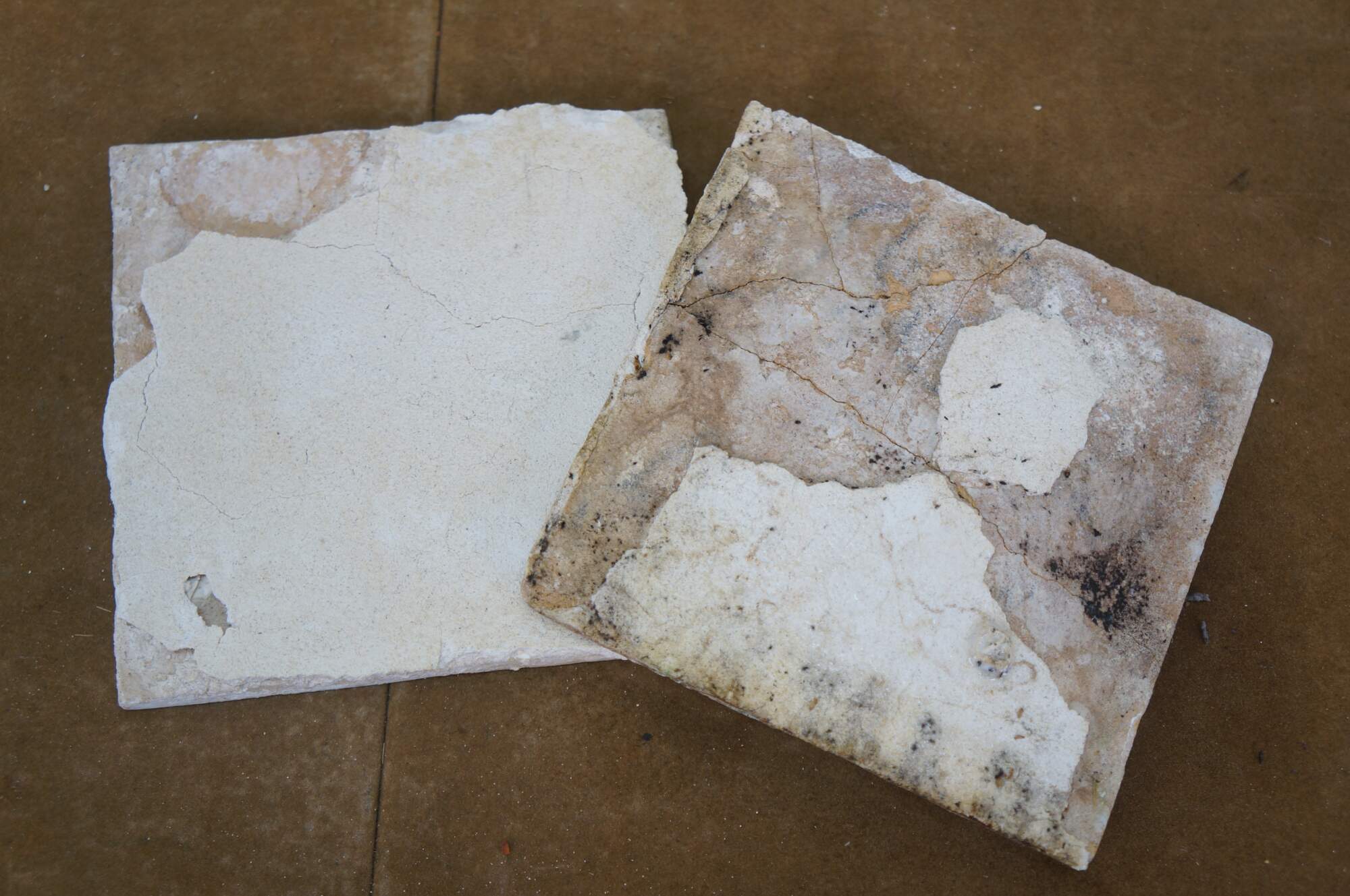 Discoloration/crazing/cracks; some repaired; split to one; cement residue from previous mounting on backs; edge wear / crazing.