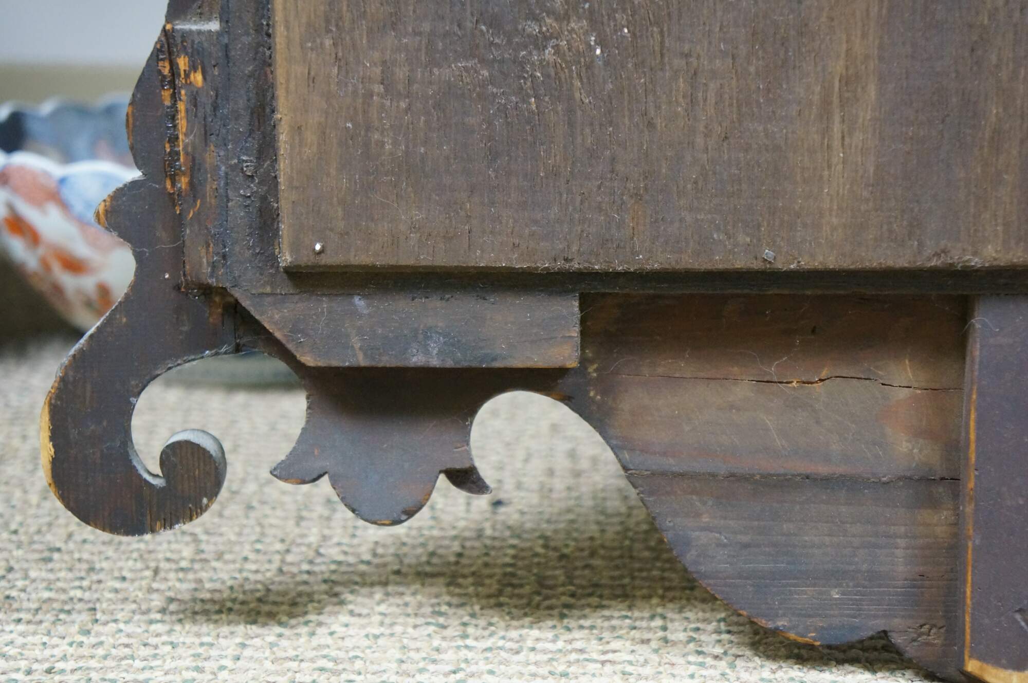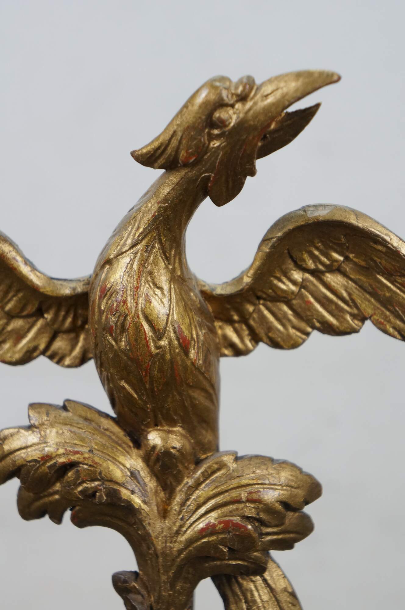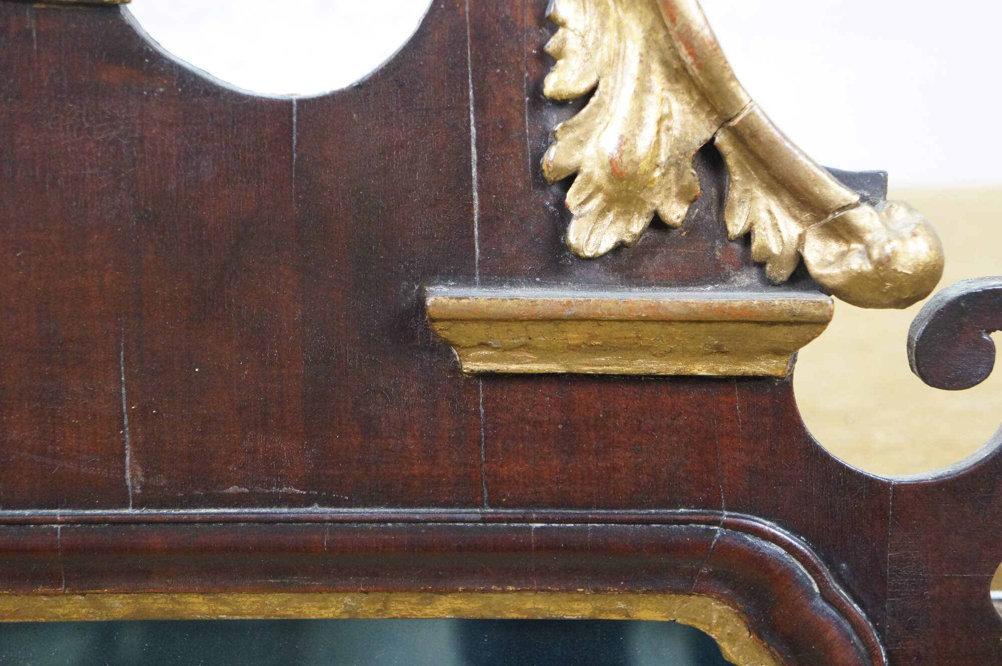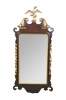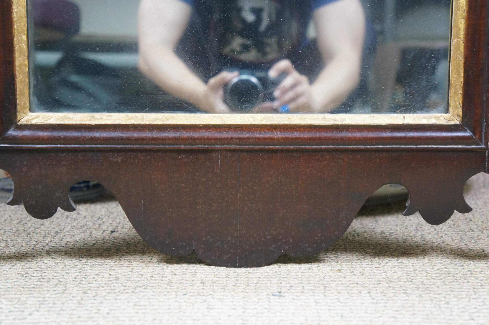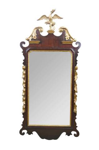 Antique Federal / Chippendale style wall / mantel / vanity / mirror. Rectangular form, framed in mahogany with scrolling fretwork at the top and bottom, gold gilt border around the mirror glass, lines of gilt leaves on each side edge, and topped with grand acanthus leaves and a majestic eagle / phoenix bird.