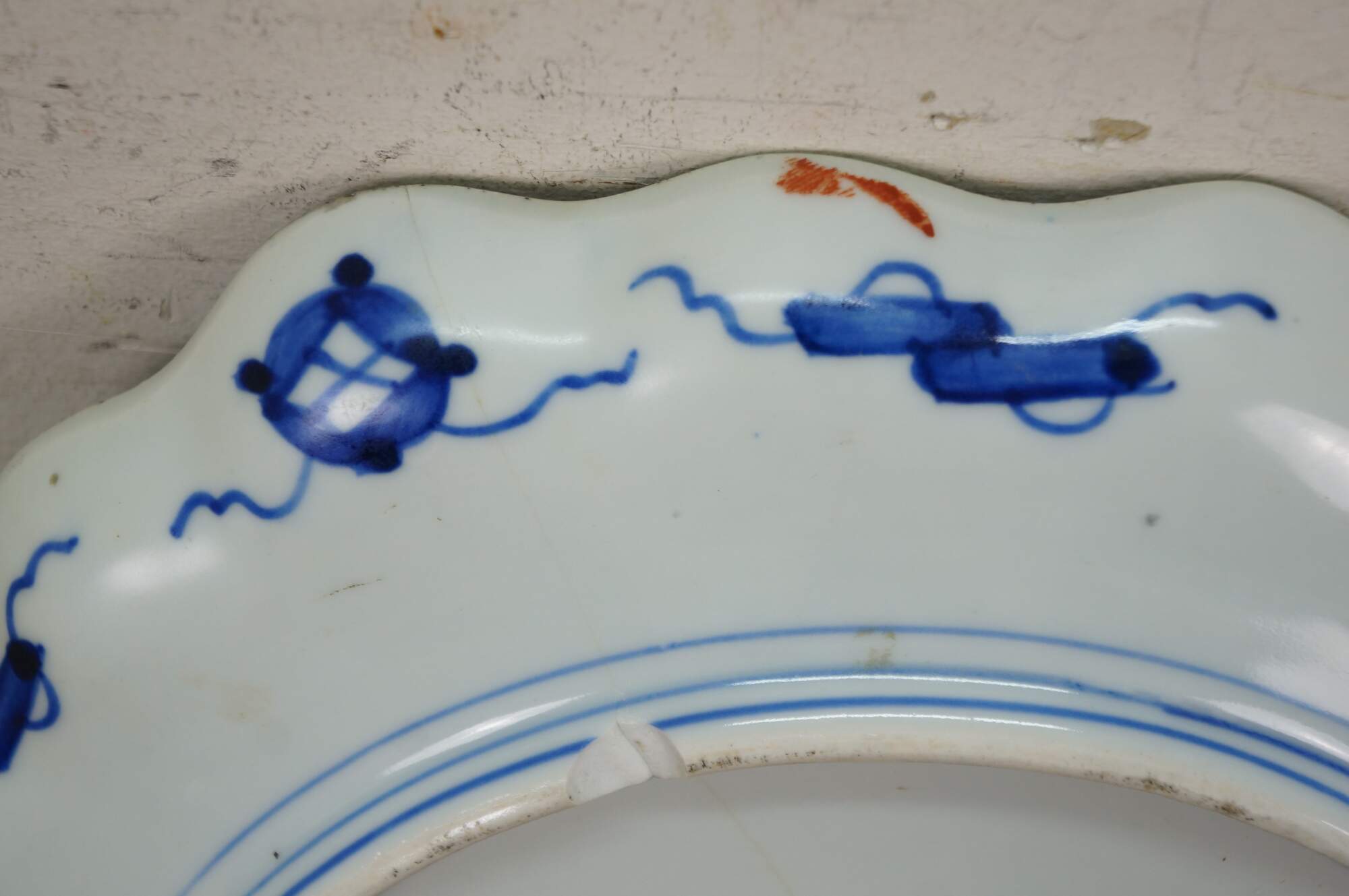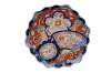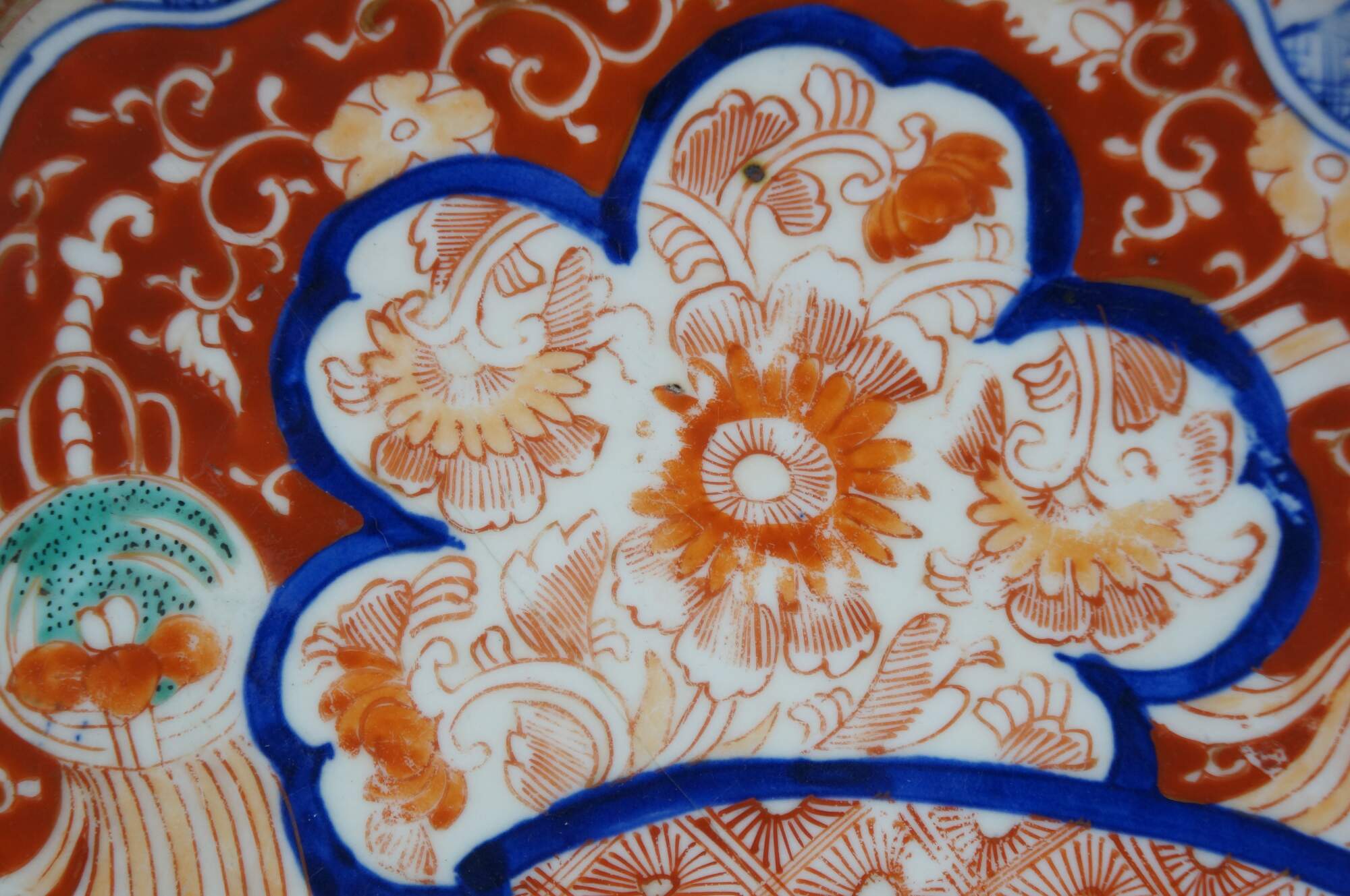 Antique Japanese imari porcelain serving platter / dish with a raised scalloped edge, decorated in orange, blue, and green with flowers, bauble with streaming ribbons, a figure in a boat on the water, and a foo dog in a garden.