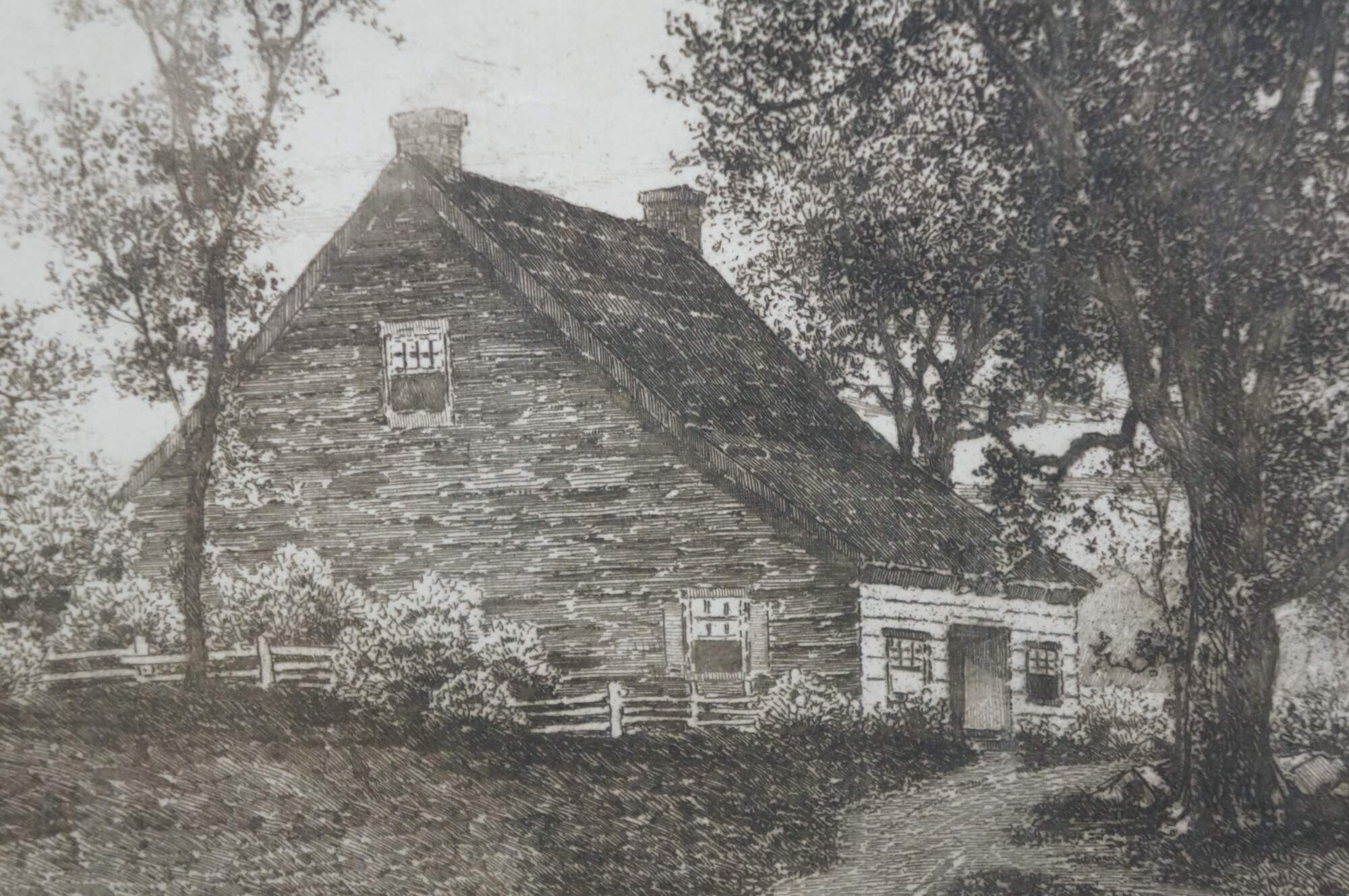 Late 19th century black and white etching of "The Birthplace of George Washington" by Louise Howland King. Landscape of a country cottage by a river. Title printed, lower left. Remarke of a saw (wall?), lower edge. Pencil signed, lower right. Copyright 1897 by MF Tobin, New York. Beveled oak frame with lightly carved detail; black mat.