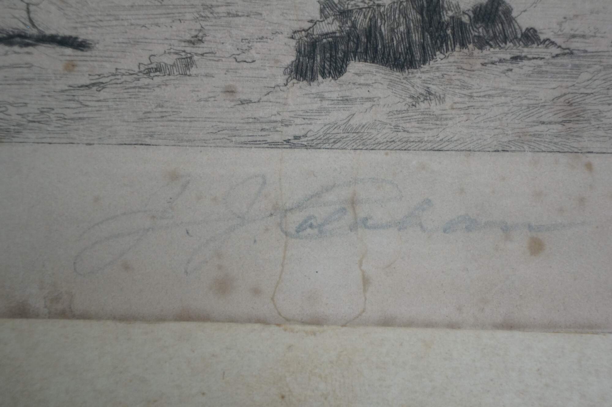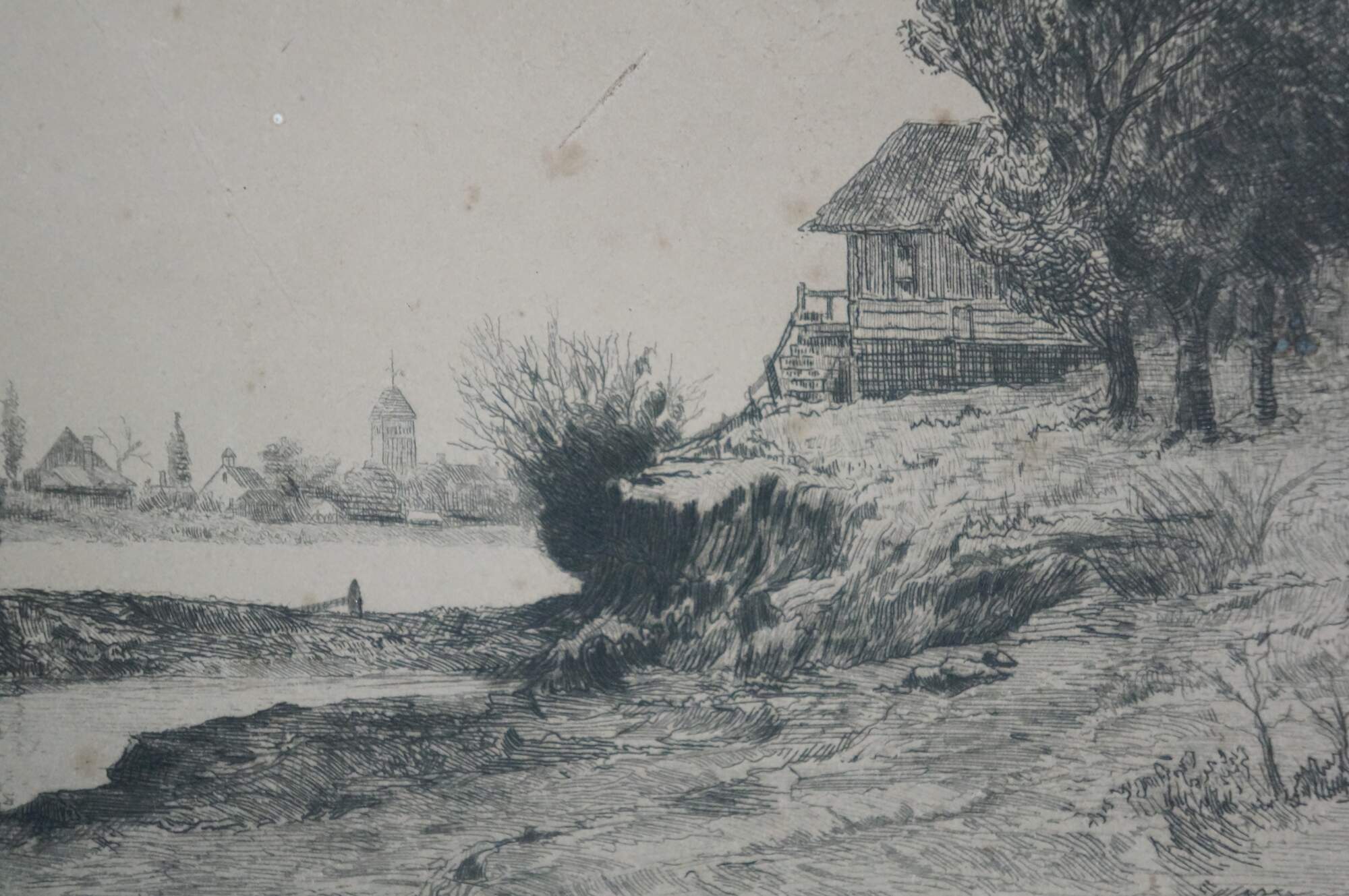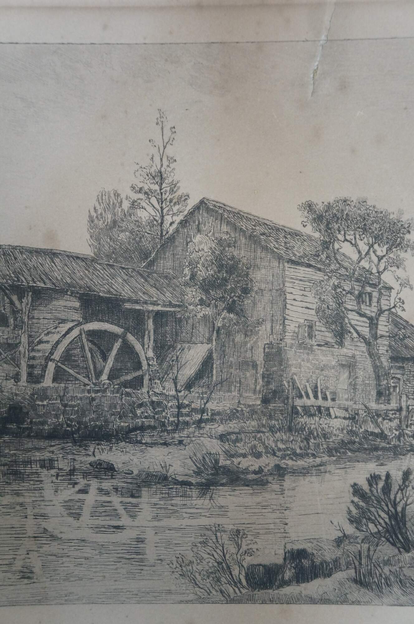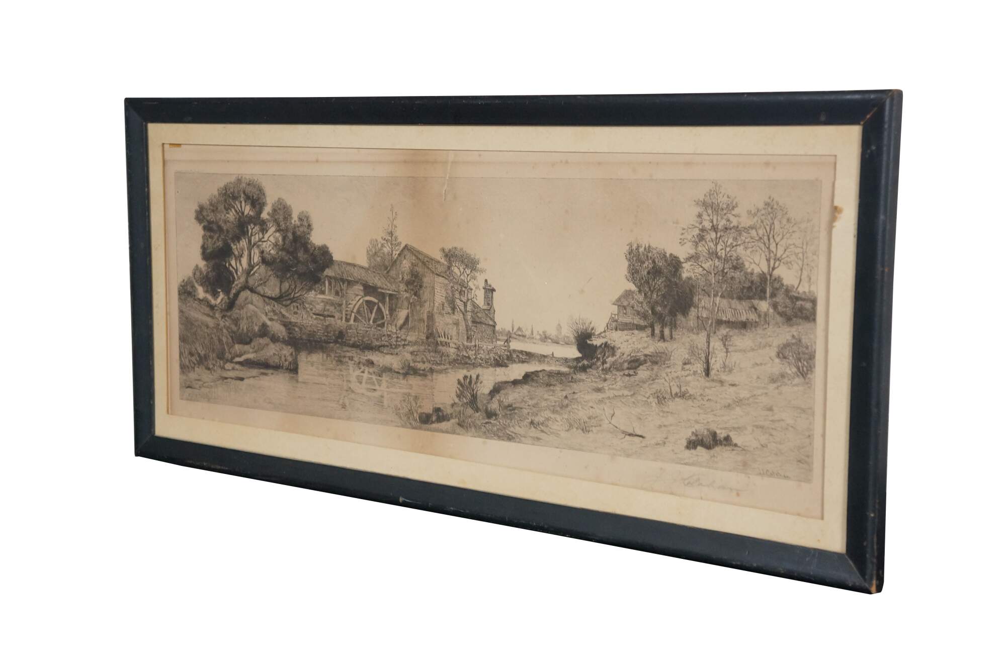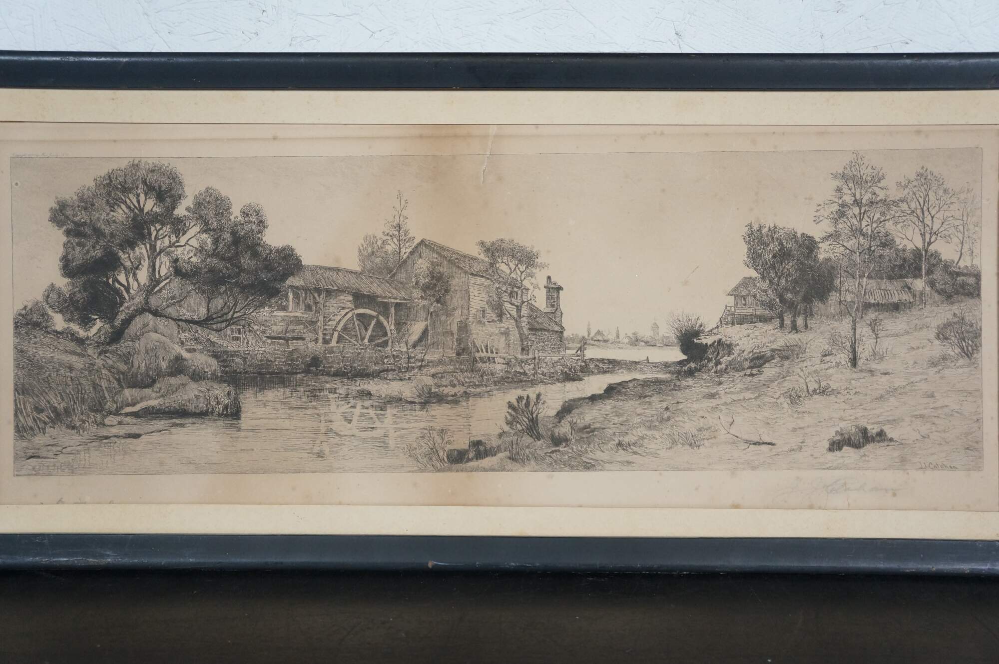 Late 19th century black and white etching by James J. Calahan. A wide country landscape showing a water mill at the edge of a river. Paper embossed "Max Jacoby Publisher New york, lower left. Remarke of figures in a boat, lower left. Pencil signed, lower right. Signed in plate JJ Calahan, lower right. Copyright 1890 by Max Jacoby, NY. Black painted wood frame.