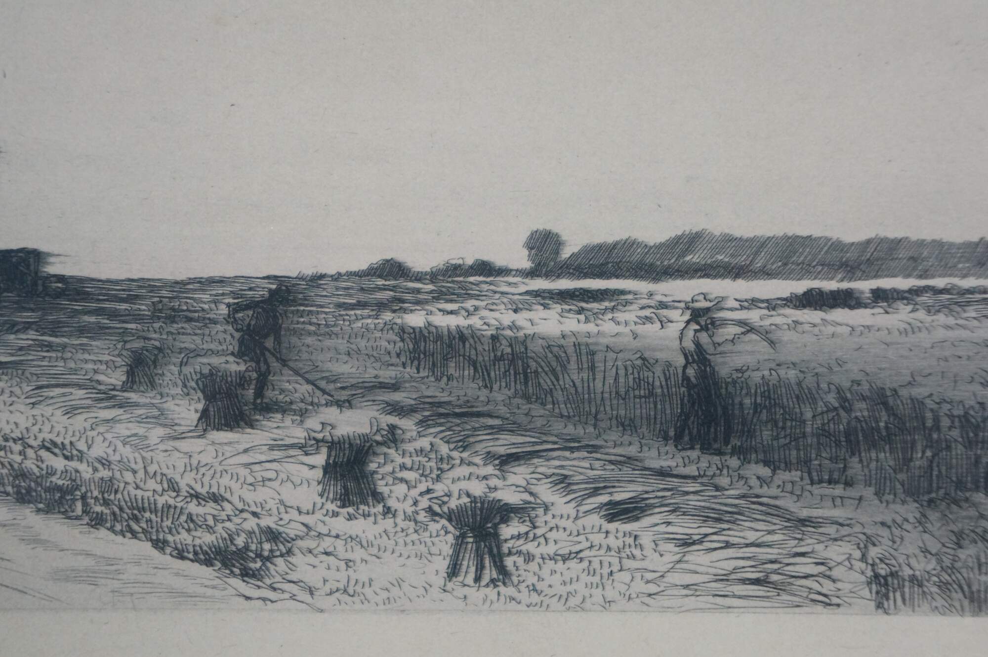 Late 19th century black and white landscape etching showing a panoramic view of figures harvest hay with scythes, with a farmhouse in the background. Plain wood frame; brown mat.