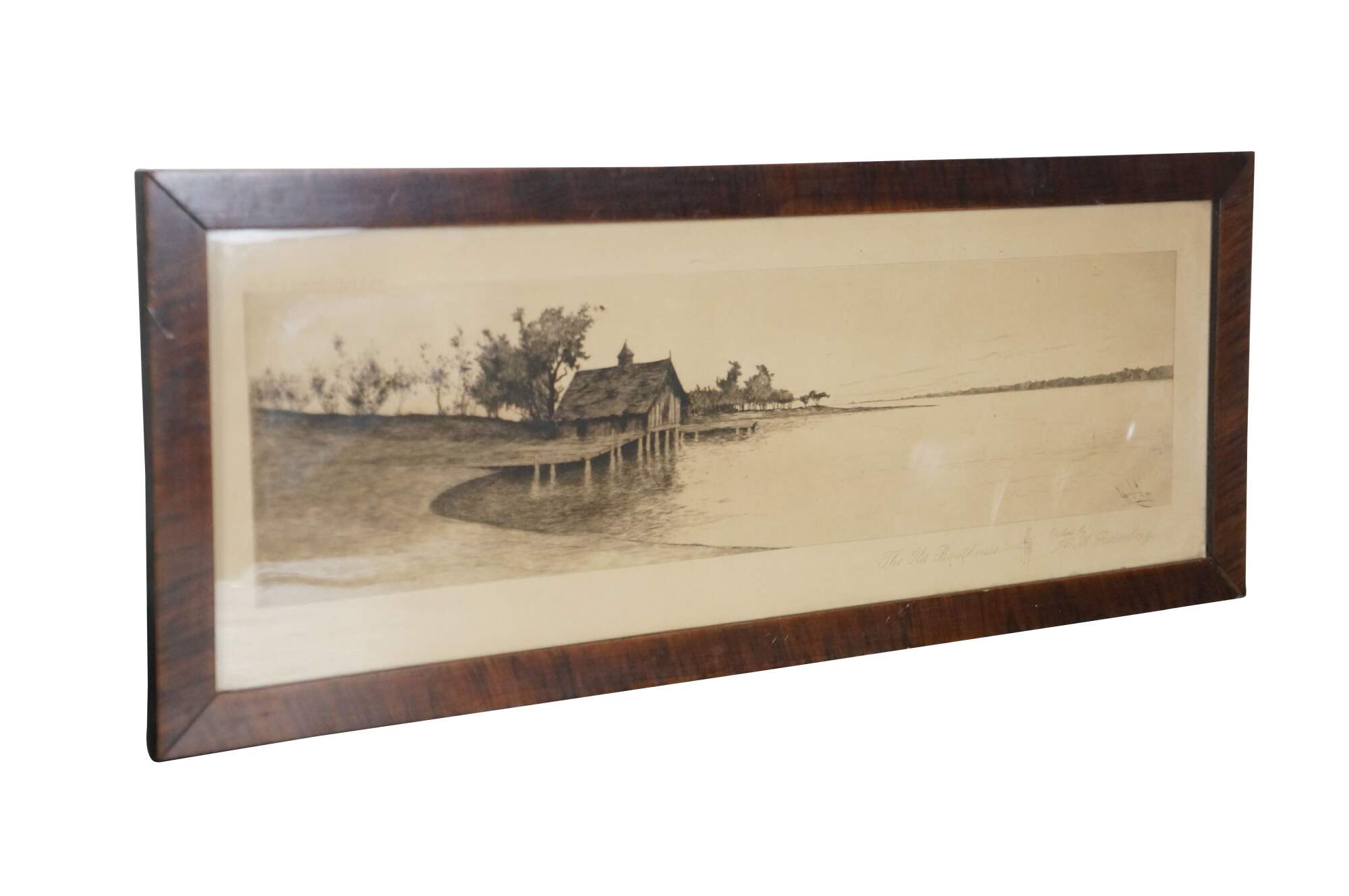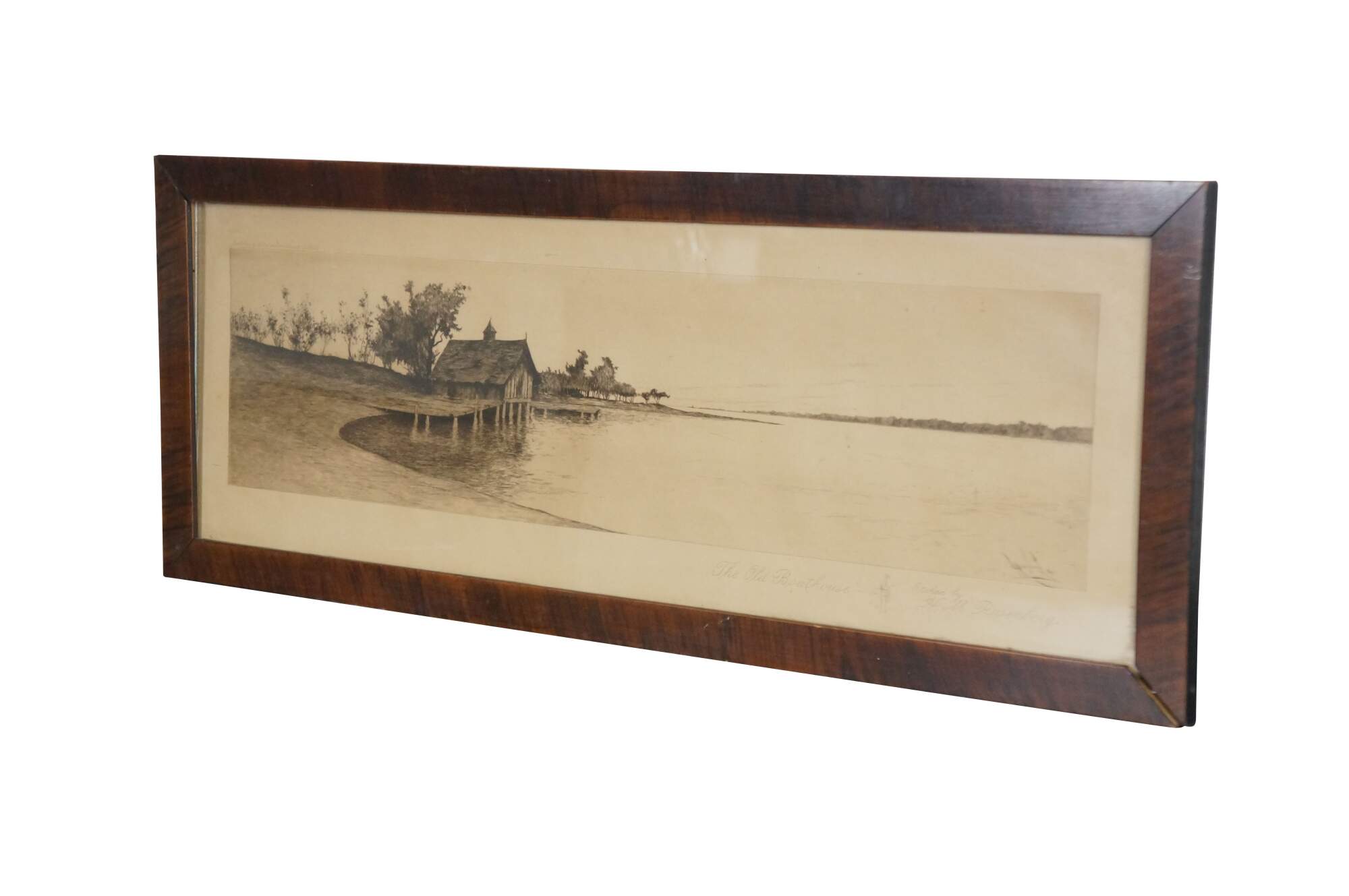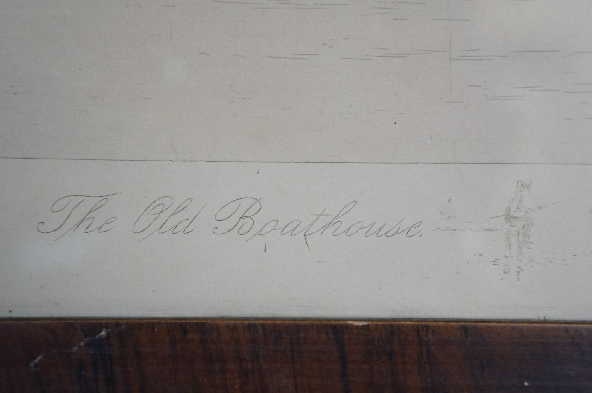 Late 19th century black and white etching titled "The Old Boathouse" by Henry M Rosenberg. A panoramic riverscape showing a broad waterway with a dock and boathouse framed in trees. Title and "Etched by HM Rosenberg" printed along lower edge. Remarke of a figure fishng, lower edge. Signed in plate HM Rosenberg Mar 90, lower right. Published by Fishel, Adler & Schwartz, New York. Plain wood frame; no mat.