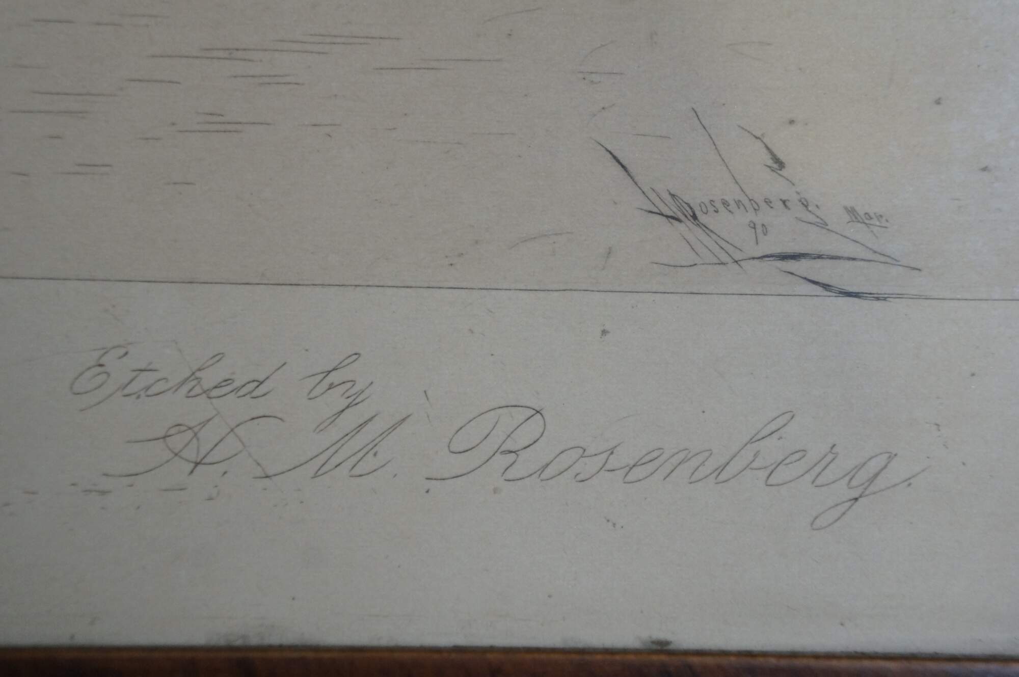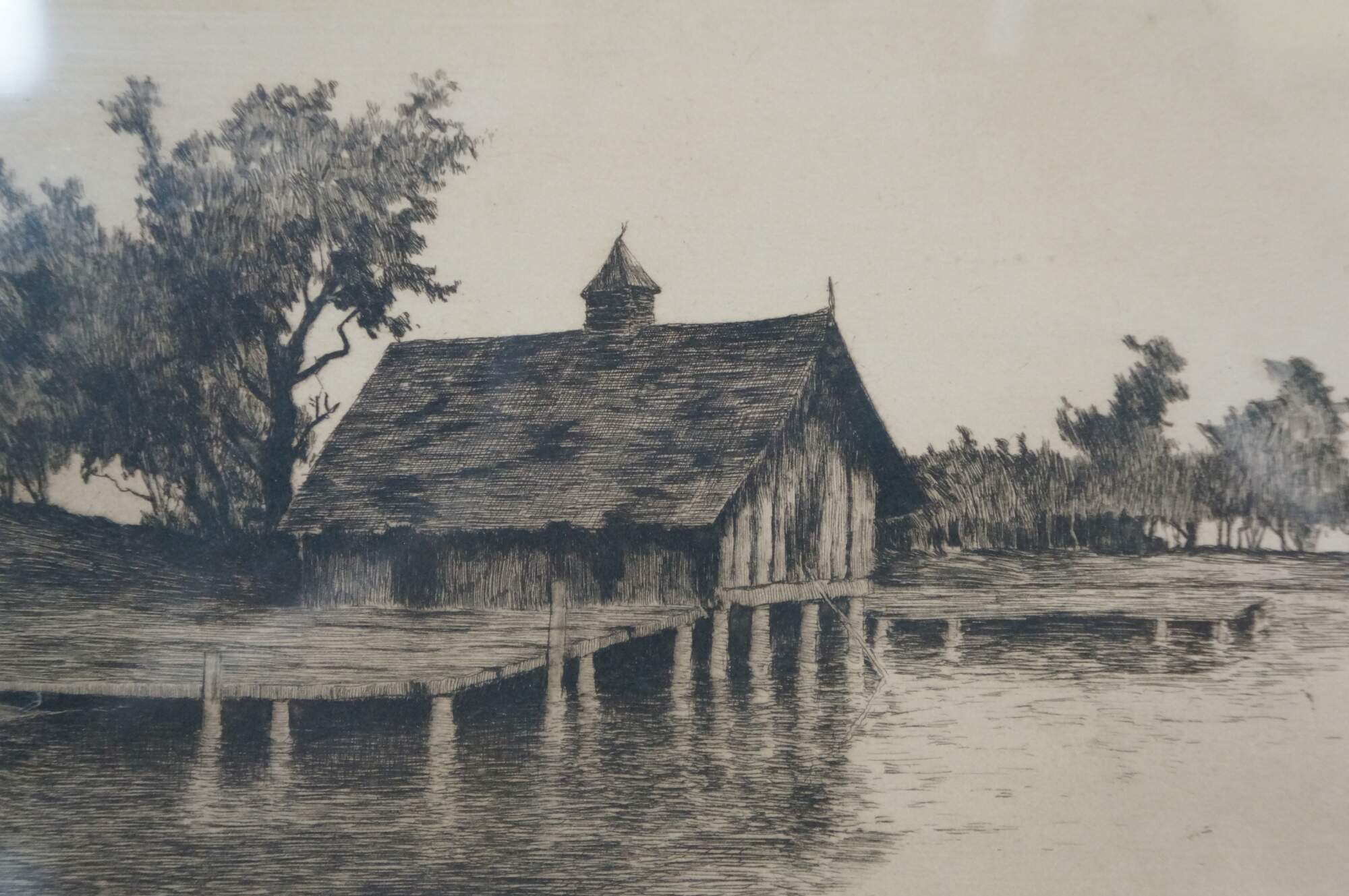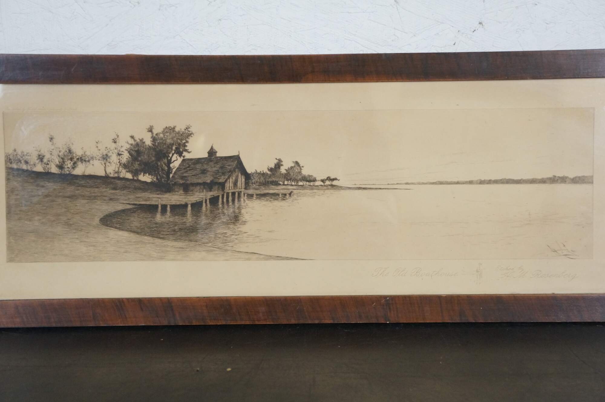 Late 19th century black and white etching titled "The Old Boathouse" by Henry M Rosenberg. A panoramic riverscape showing a broad waterway with a dock and boathouse framed in trees. Title and "Etched by HM Rosenberg" printed along lower edge. Remarke of a figure fishng, lower edge. Signed in plate HM Rosenberg Mar 90, lower right. Published by Fishel, Adler & Schwartz, New York. Plain wood frame; no mat.
