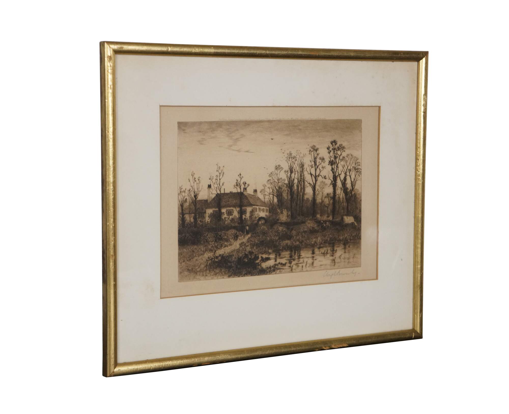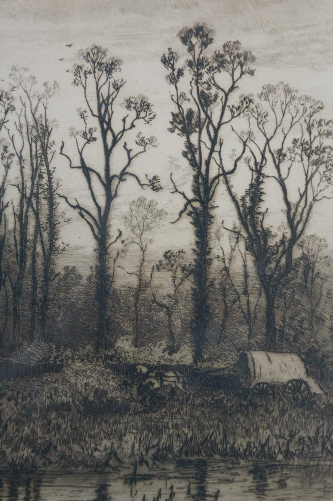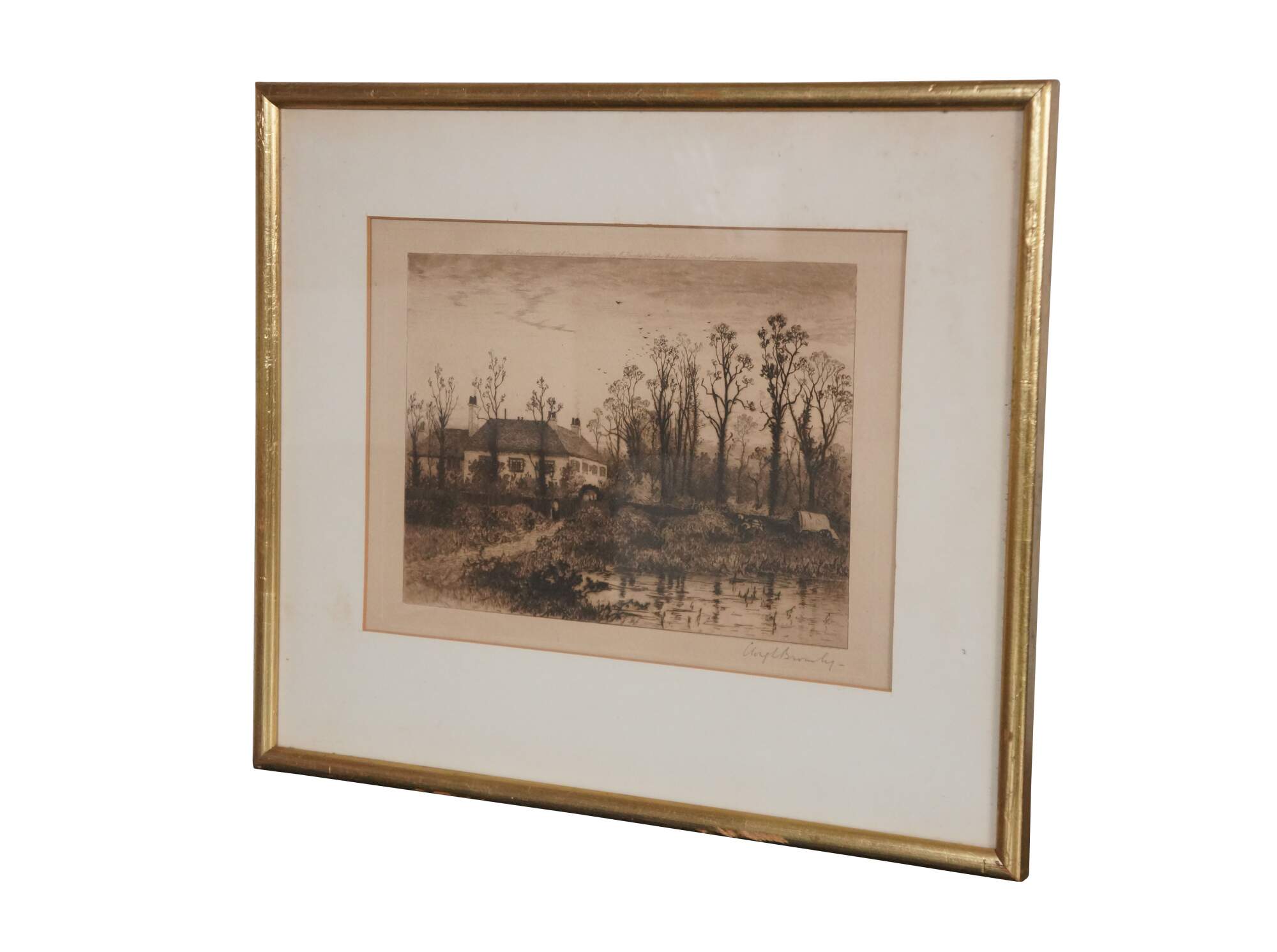 Late 19th century black and white etching titled "The Old Manor House" by Clough Bromley (United Kingdom; active circa 1872-1904). Forested landscape showing a covered wagon drawing up to a large country house. Pencil signed, lower right. New York - Entered according to Act of Congress in the Year 1886 by M. Knoedler H in the Office of the Librarian of Congress at Washington. Giltwood frame; white mat.