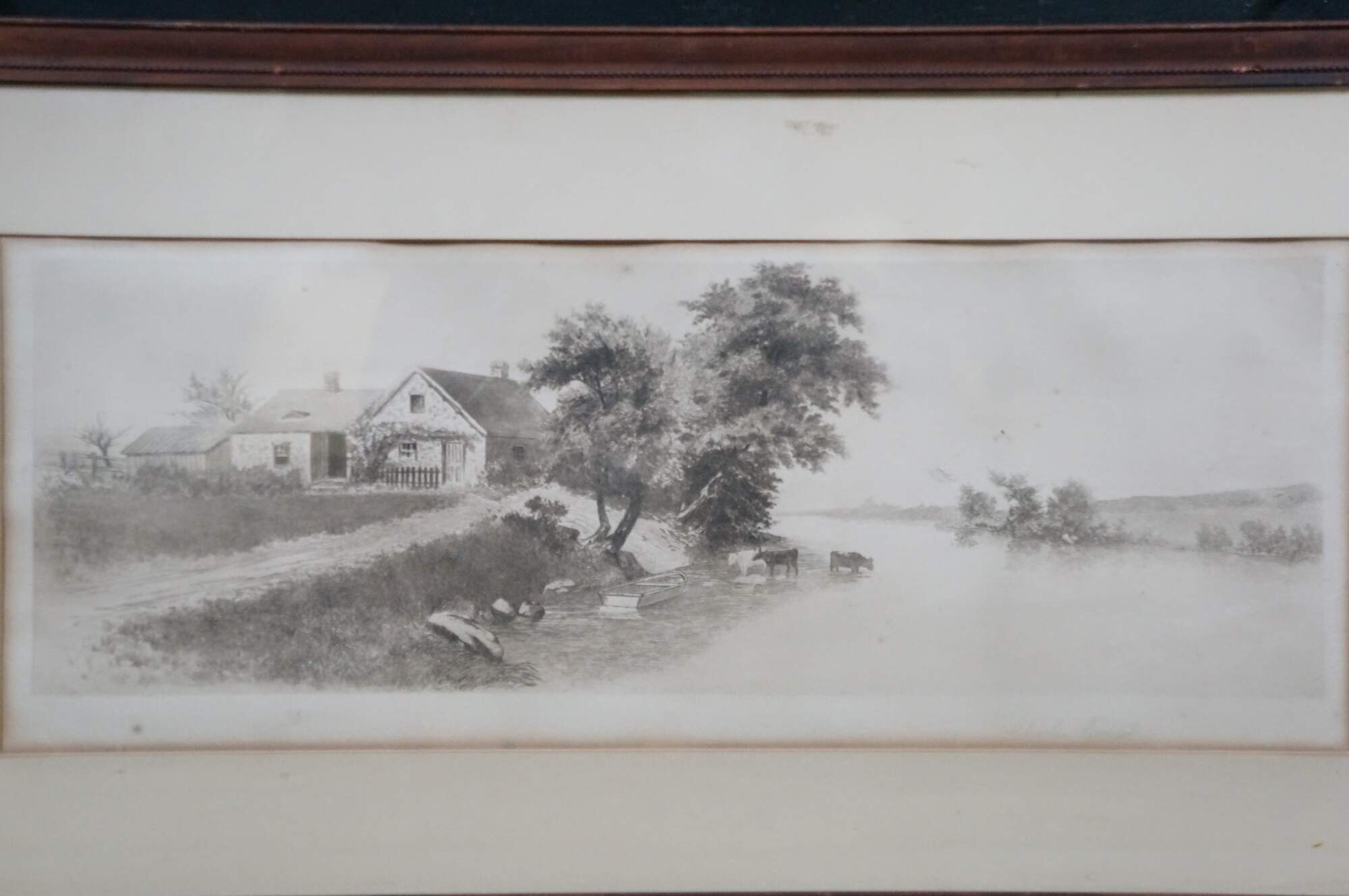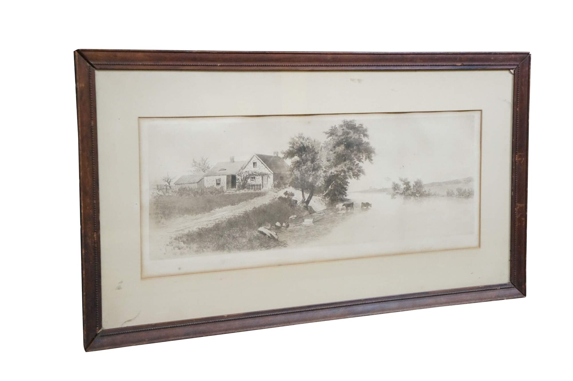 Late 19th century black and white etching by Charles Gondel. Country landscape showing a stone farmhouse and a group of cows in a river. Remarke landscape, lower edge. "Charles Gondel" printed, lower edge. Copyrighted 1895 by BT Babbitt. Beveled wood frame with beaded detail; white mat.
