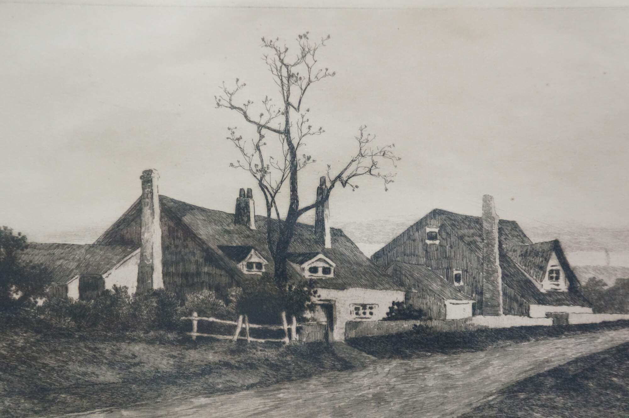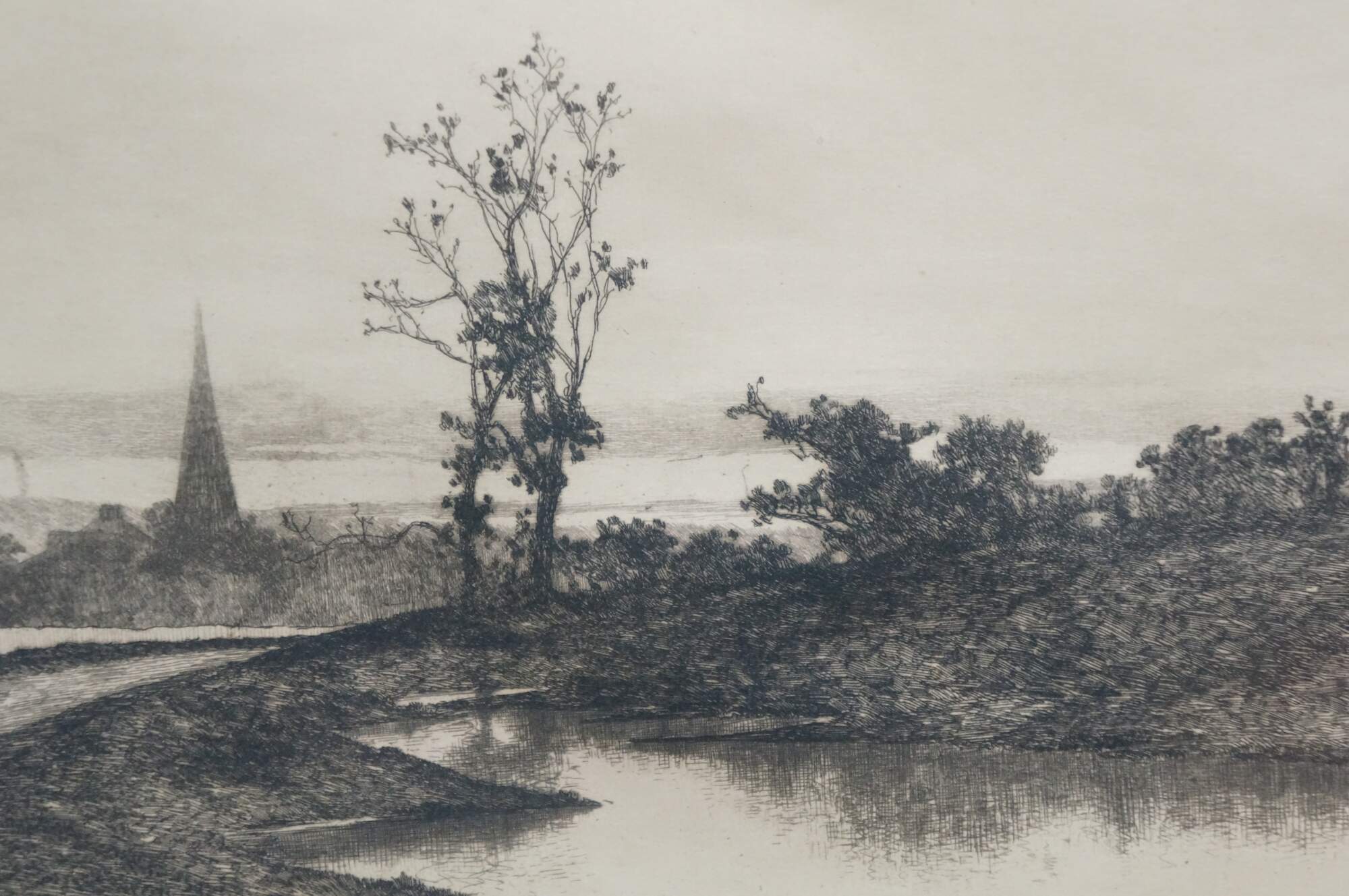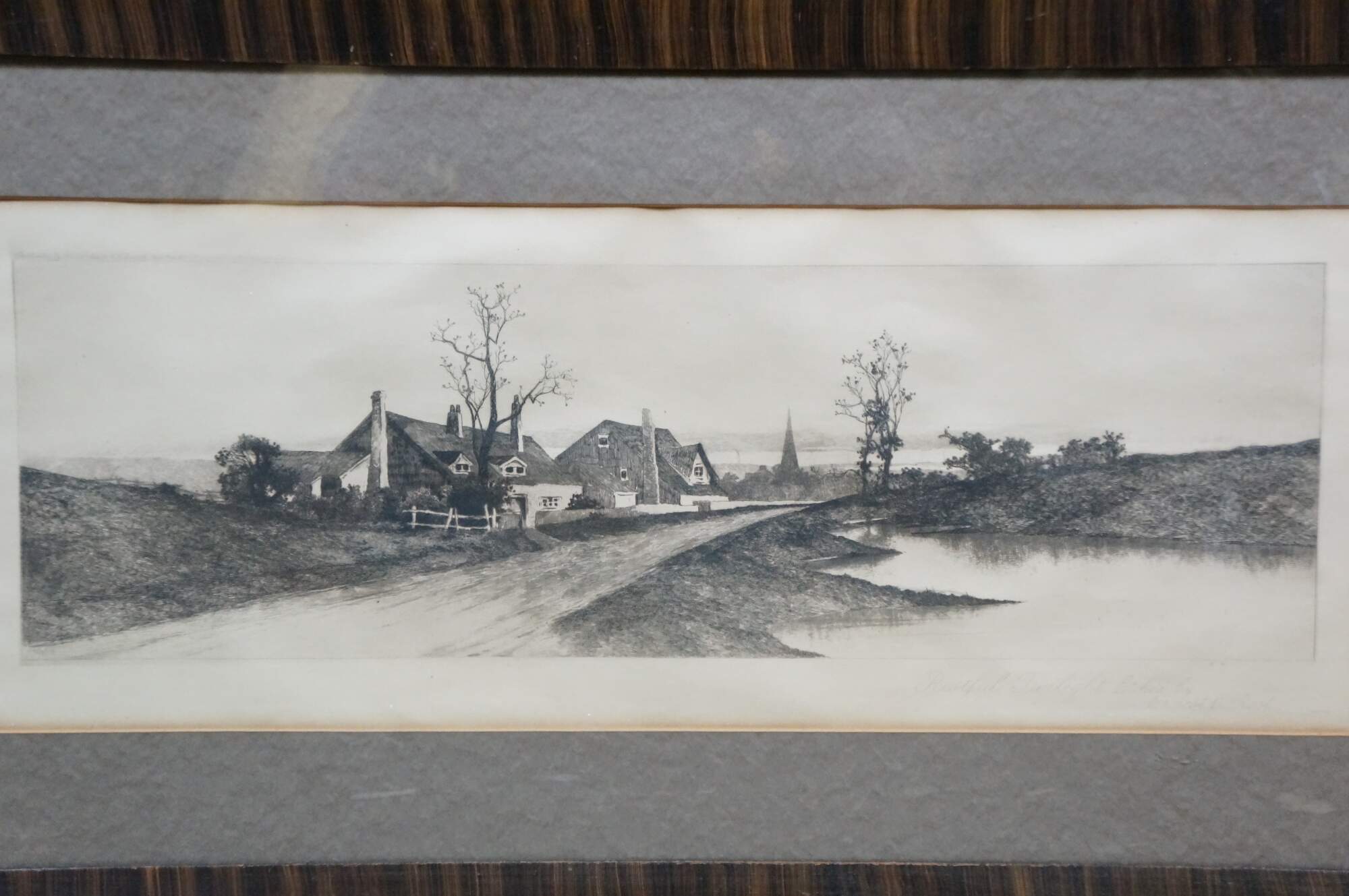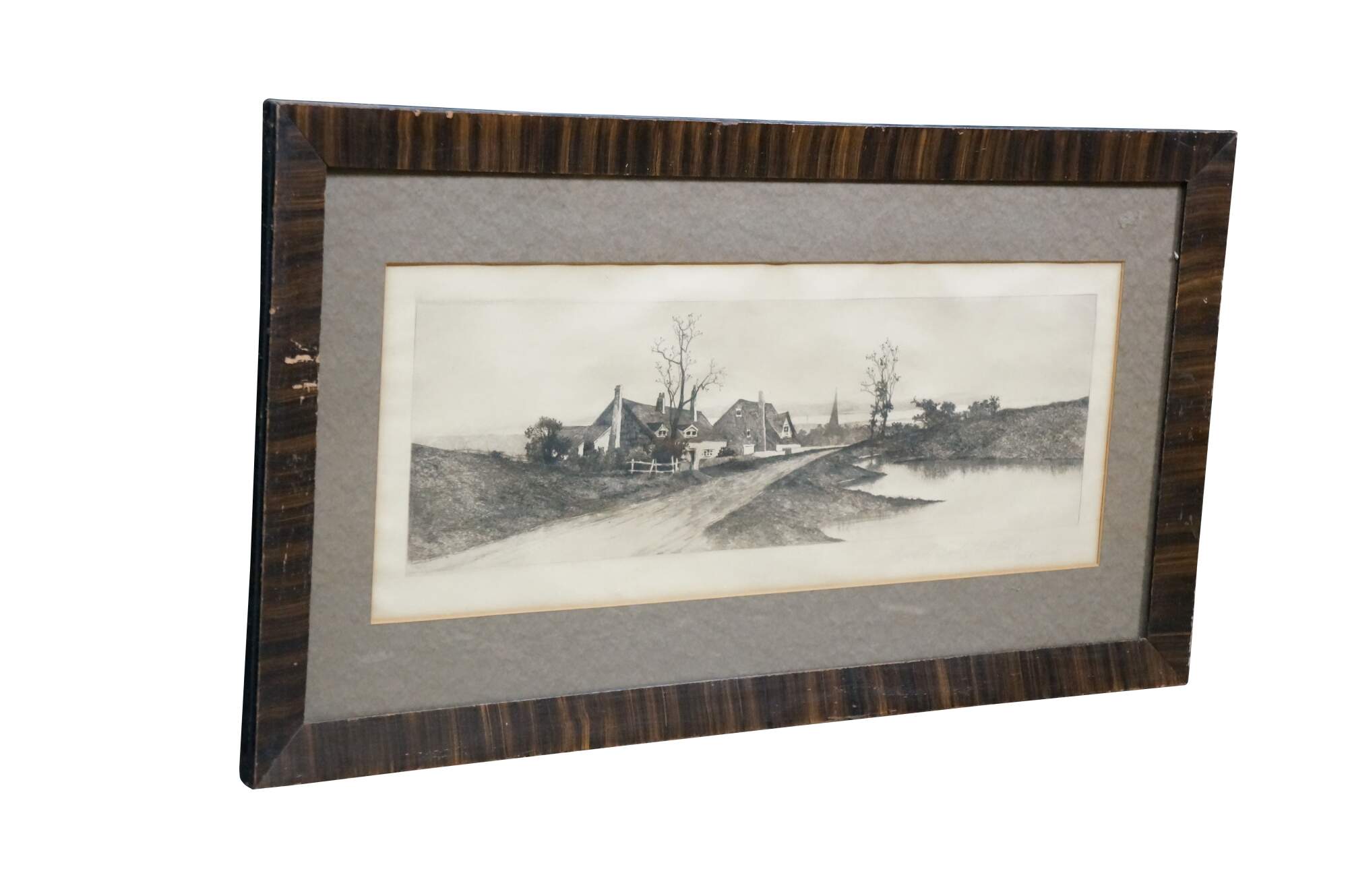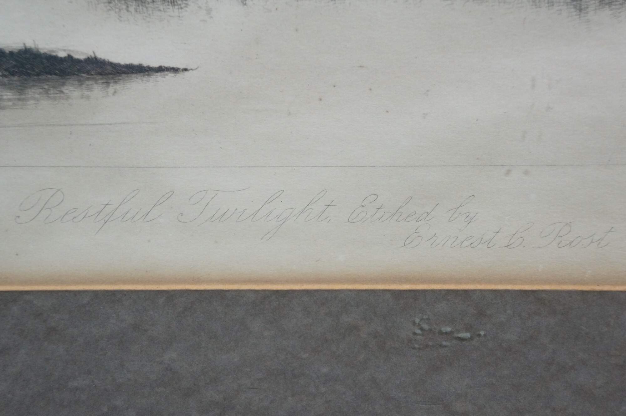 Late 19th century black and white etching titled "Restful Twilight" by Ernest C. Rost. A broad landscape showing cottages along a road by a small lake with a village or city in the distance. Published by Fishel, Adler & Schwartz, New York. Title and "Etched by Ernest C rost" printed along lower edge. Painted "tiger wood" frame; gray mat.