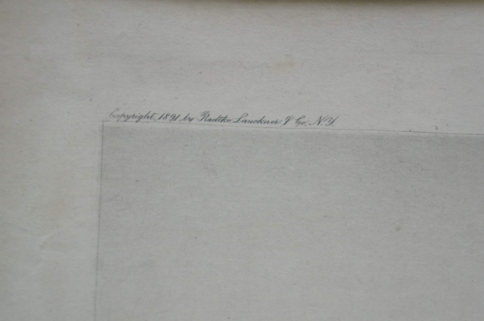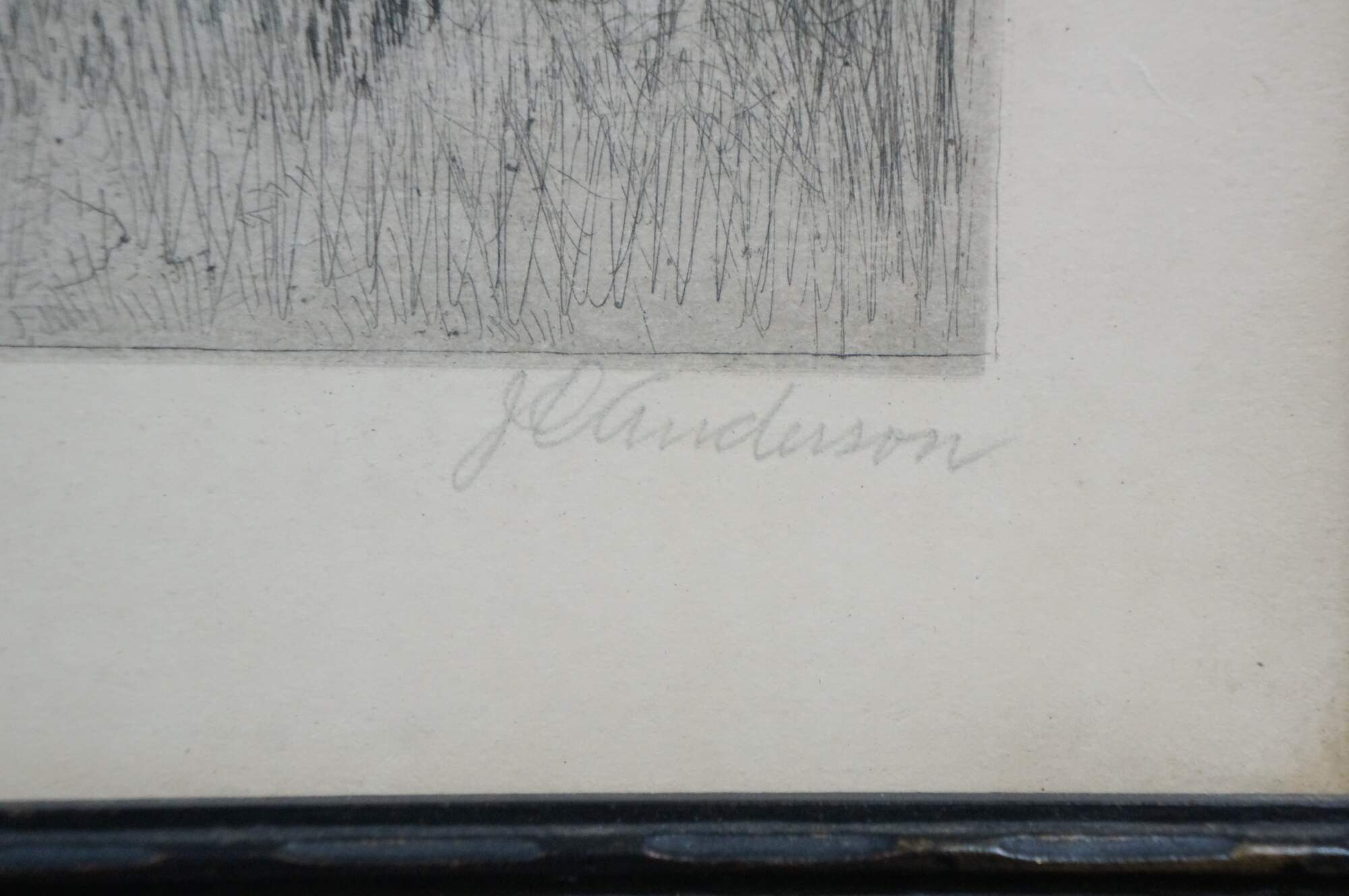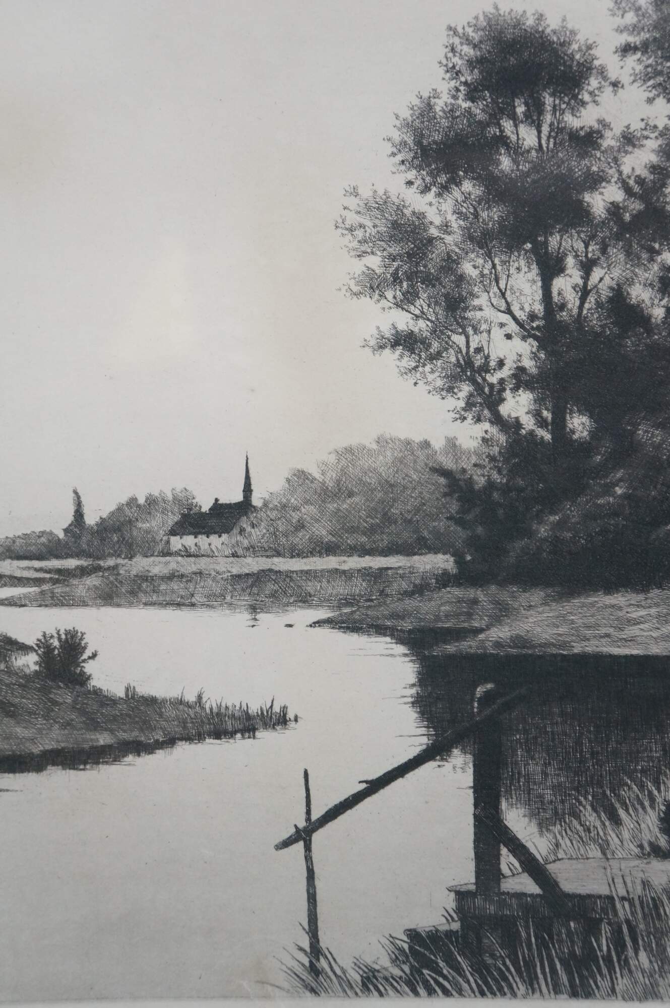 Late 19th century black and white etching by John Octavius Anderson. Country landscape featuring a small dock at the edge of a winding river with a church steeple in the distance.. Copyright 1891 by Radtke, Lauckner & Co, NY. Remarke of a frog, lower edge. Pencil signed, lower right. Beveled, black painted wood frame with carved detail at the edges.