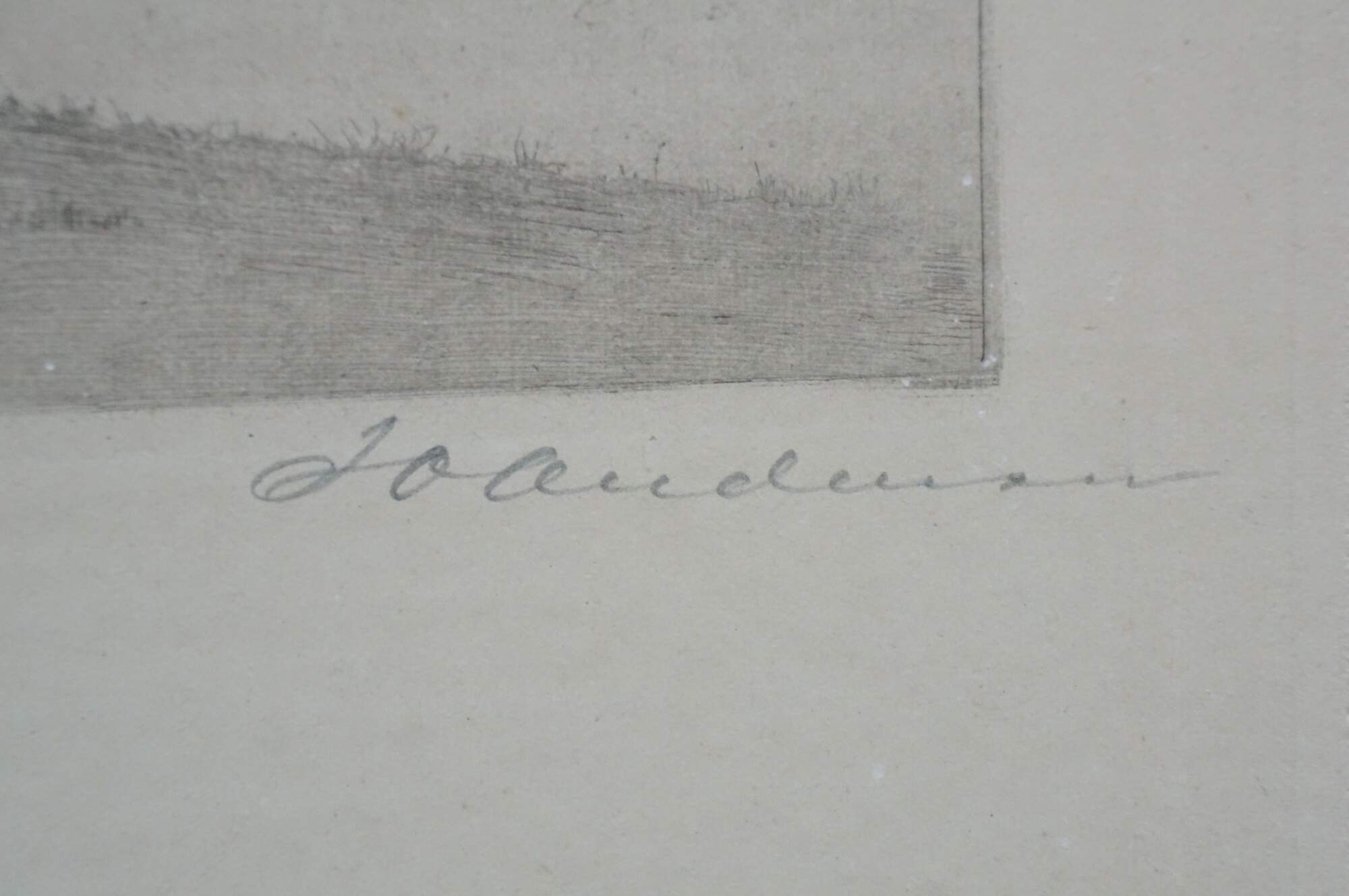 Late 19th century black and white etching by John Octavius Anderson. A panoramic landscape showing a dirt road leading to a riverside village. Copyright 1890 by Radtke, Lauckner & Co, NY. Pencil signed, lower right. Blue painted beveled wood frame; no mat.