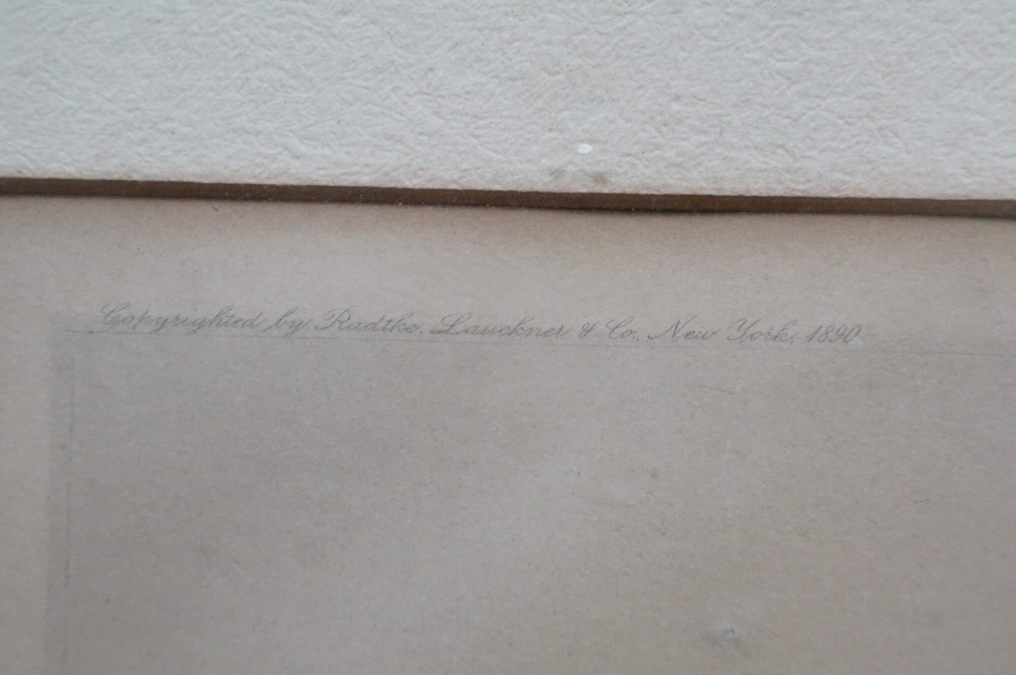 Late 19th century black and white etching by Edward Loyal Field. Landscape showing a house on a small hill, leading down to a half obscured boat dock. Possibly a view of Lake Champlain. Copyrighted by Radtke, Lauckner & Co, New York, 1890. Signed in plate EL Field. Remarke of a cottage, lower left. Pencil signed, lower right. Black painted, beveled wood frame; white mat.