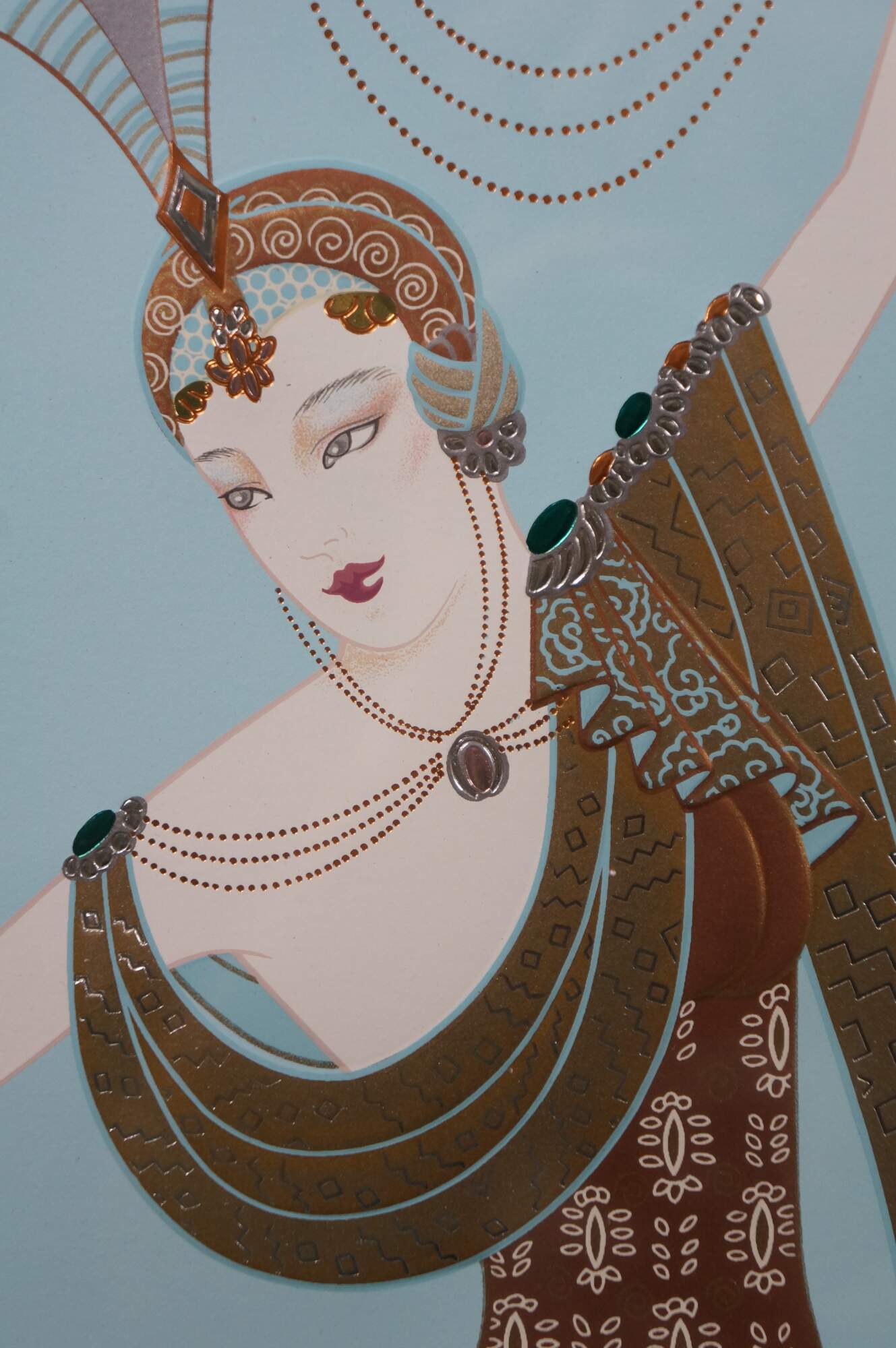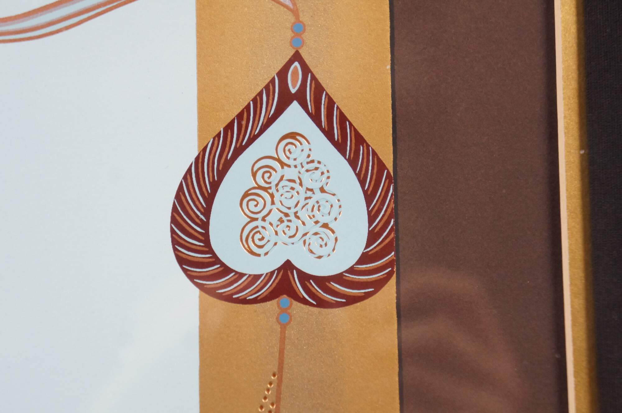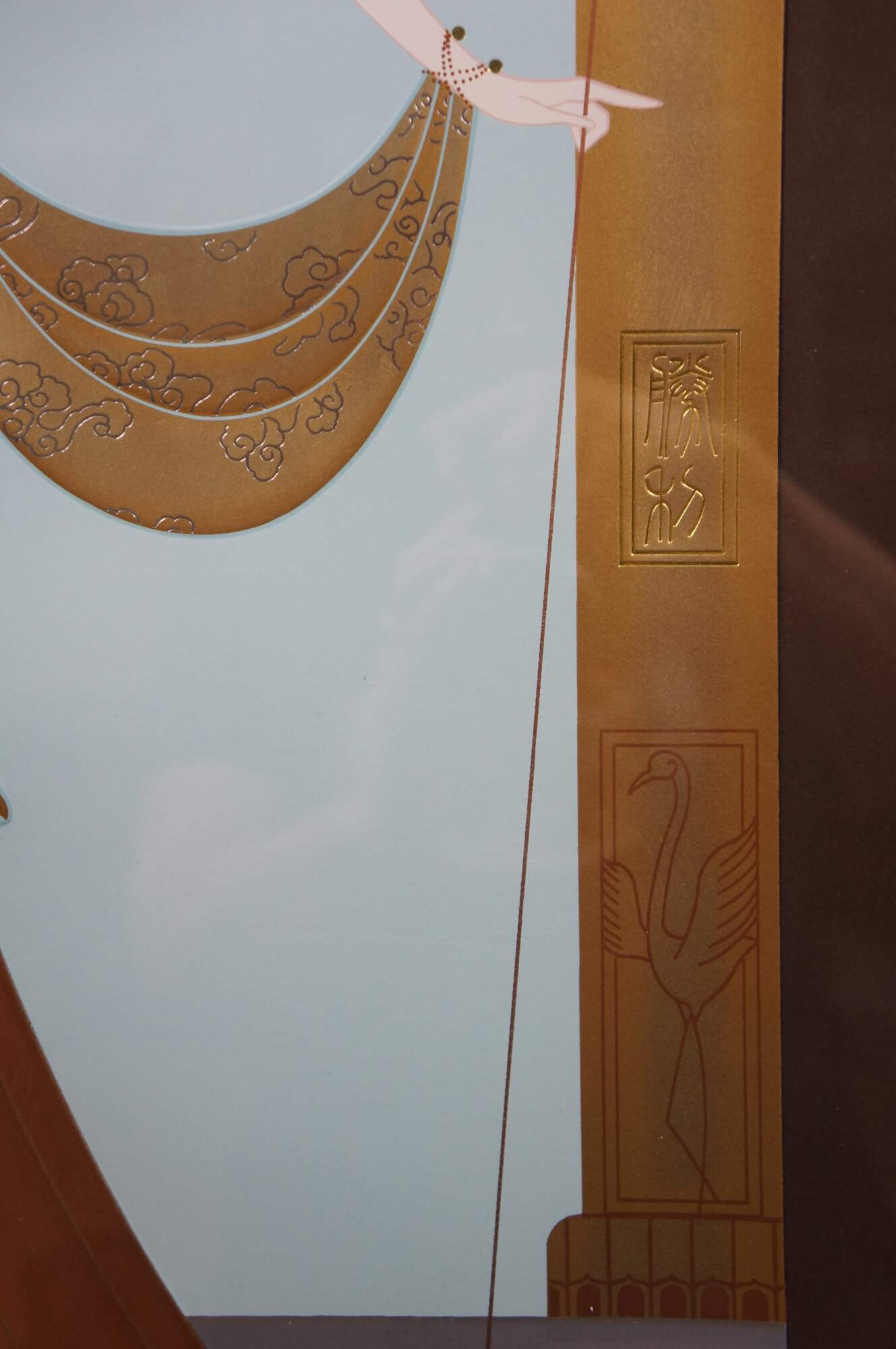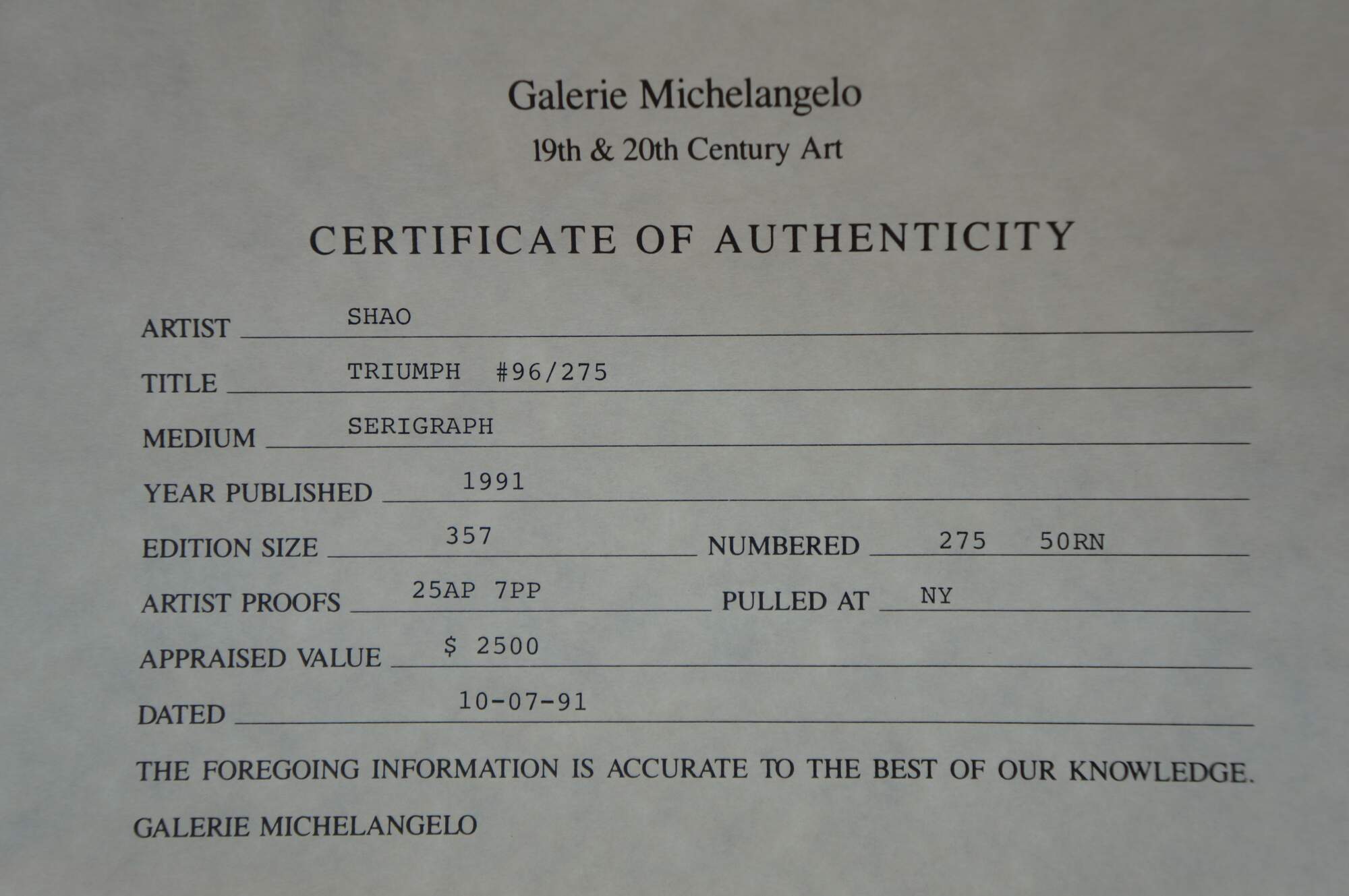 Very large and impressive 1991 serigraph print titled "Triumph" by Lillian Shao. Depicts a pair of female figures in copper and gold toga-like garments, dancing with delicate staves, flanked by gold columns. Art Deco / Erte inspired styling. Pencil signed and numbered 96/275. Includes Certificate of Authenticity. Metallic bronzed frame; black and gold layered mat.