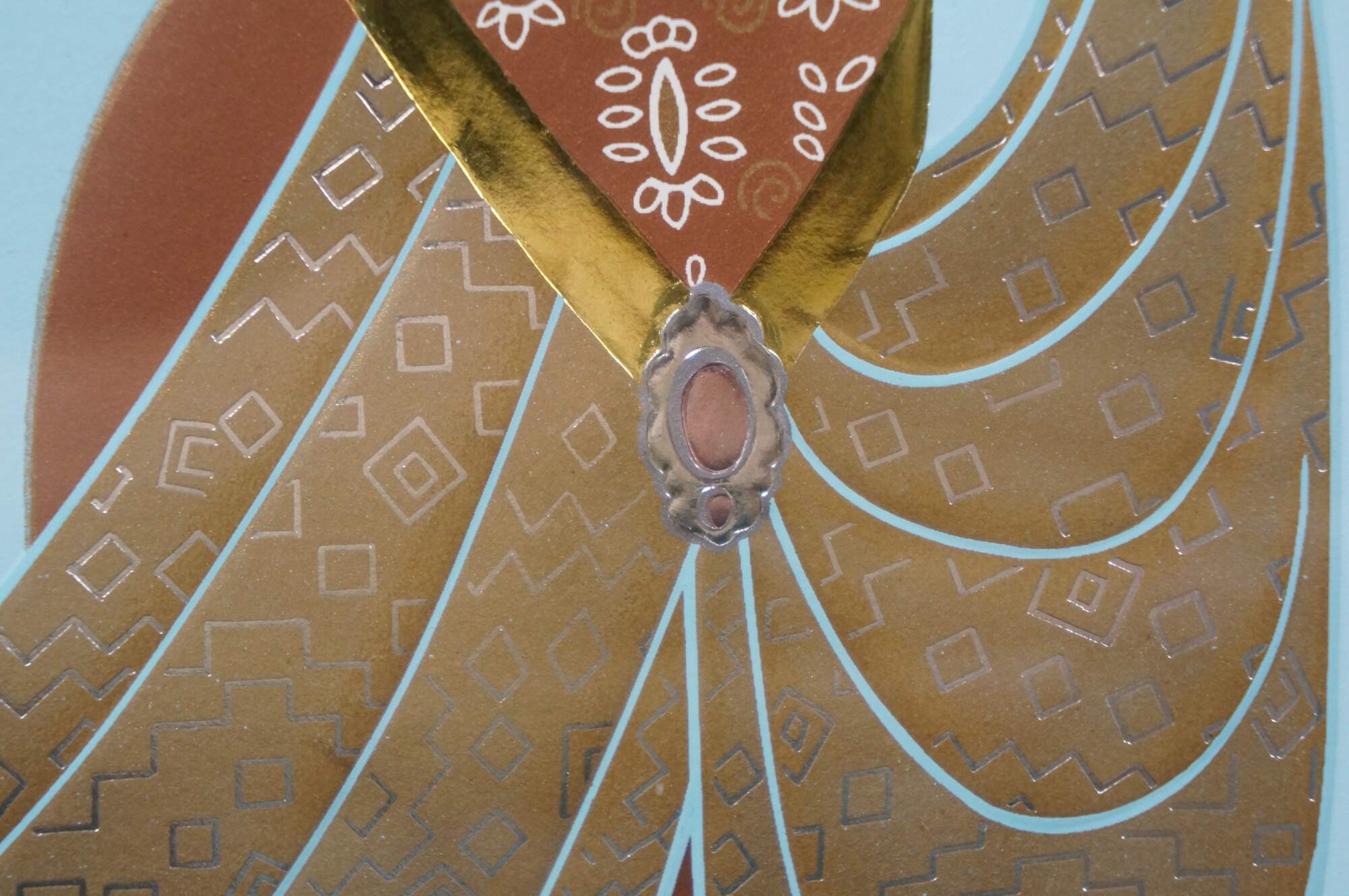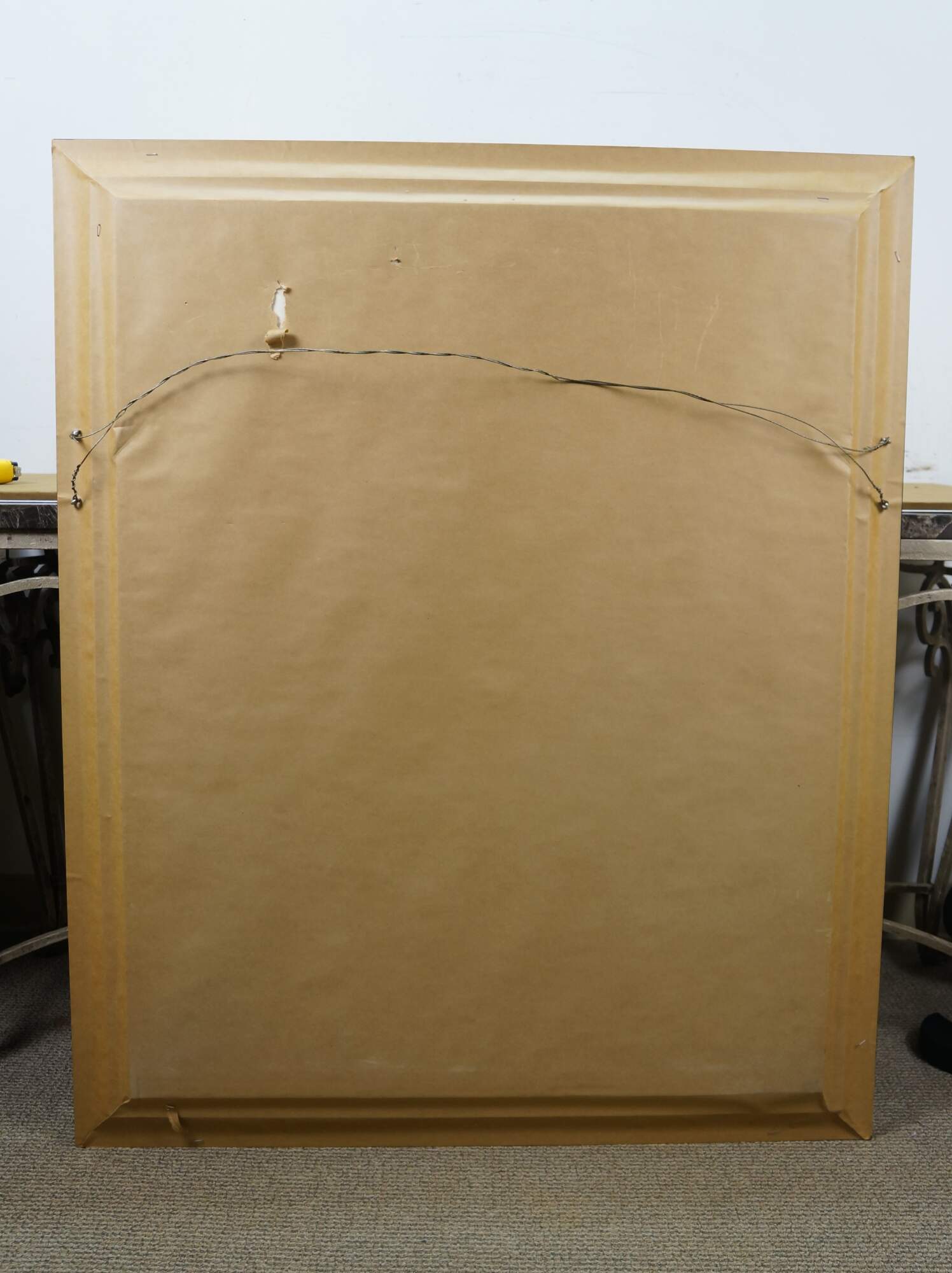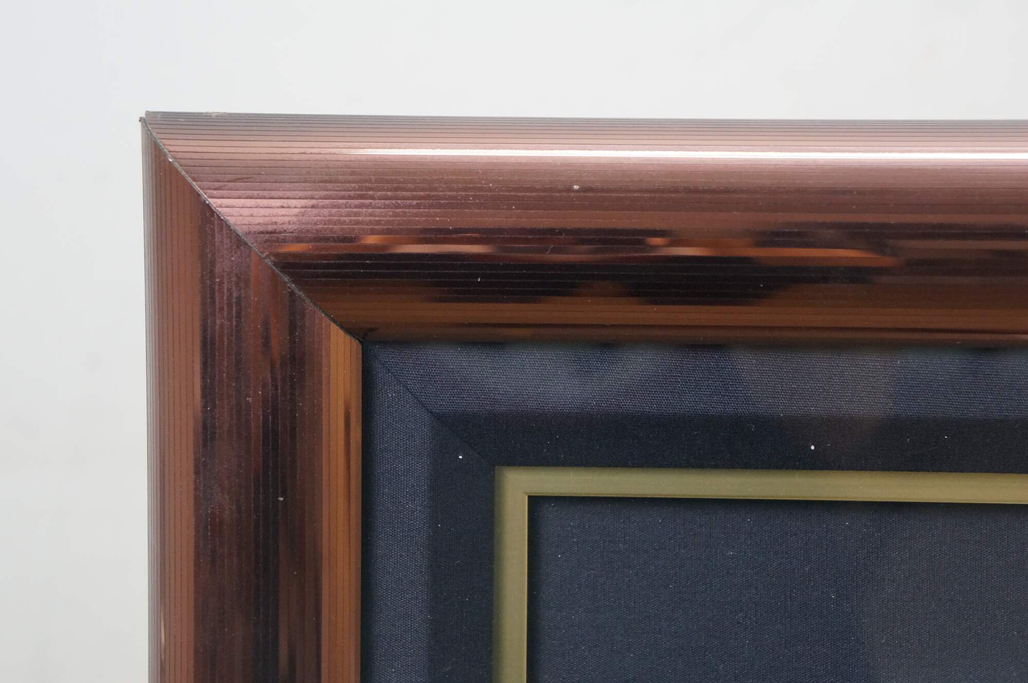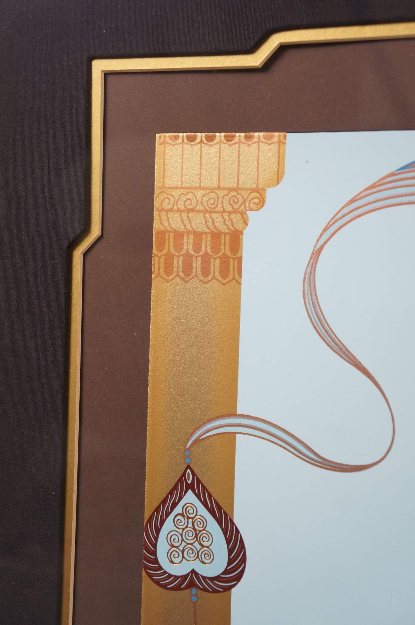 Very large and impressive 1991 serigraph print titled "Triumph" by Lillian Shao. Depicts a pair of female figures in copper and gold toga-like garments, dancing with delicate staves, flanked by gold columns. Art Deco / Erte inspired styling. Pencil signed and numbered 96/275. Includes Certificate of Authenticity. Metallic bronzed frame; black and gold layered mat.