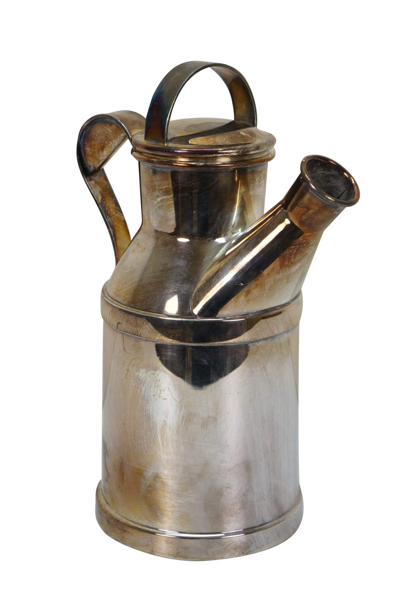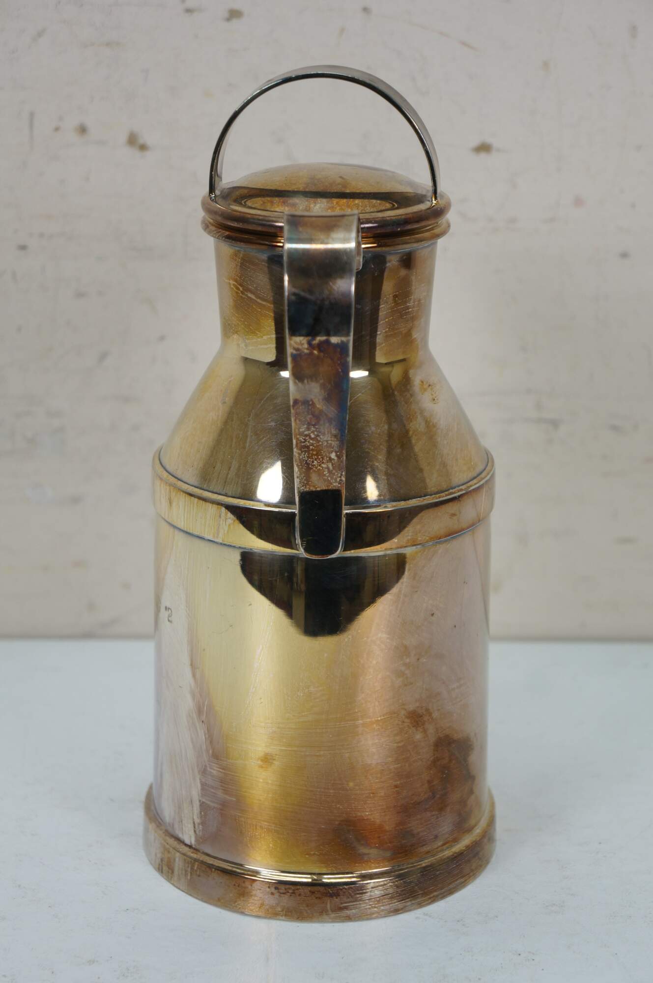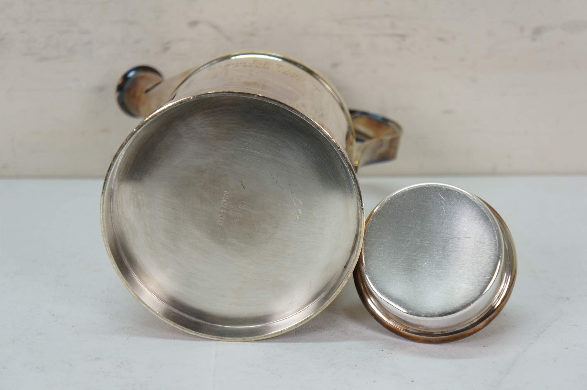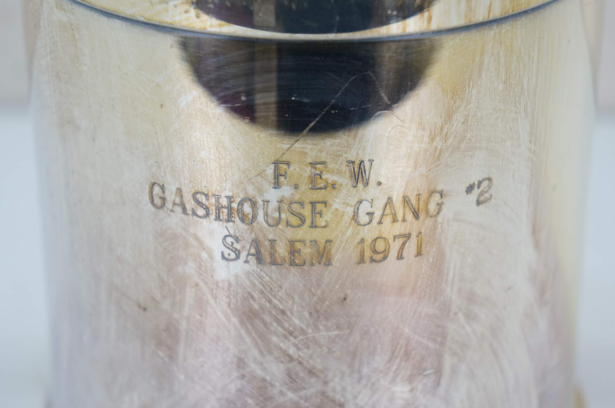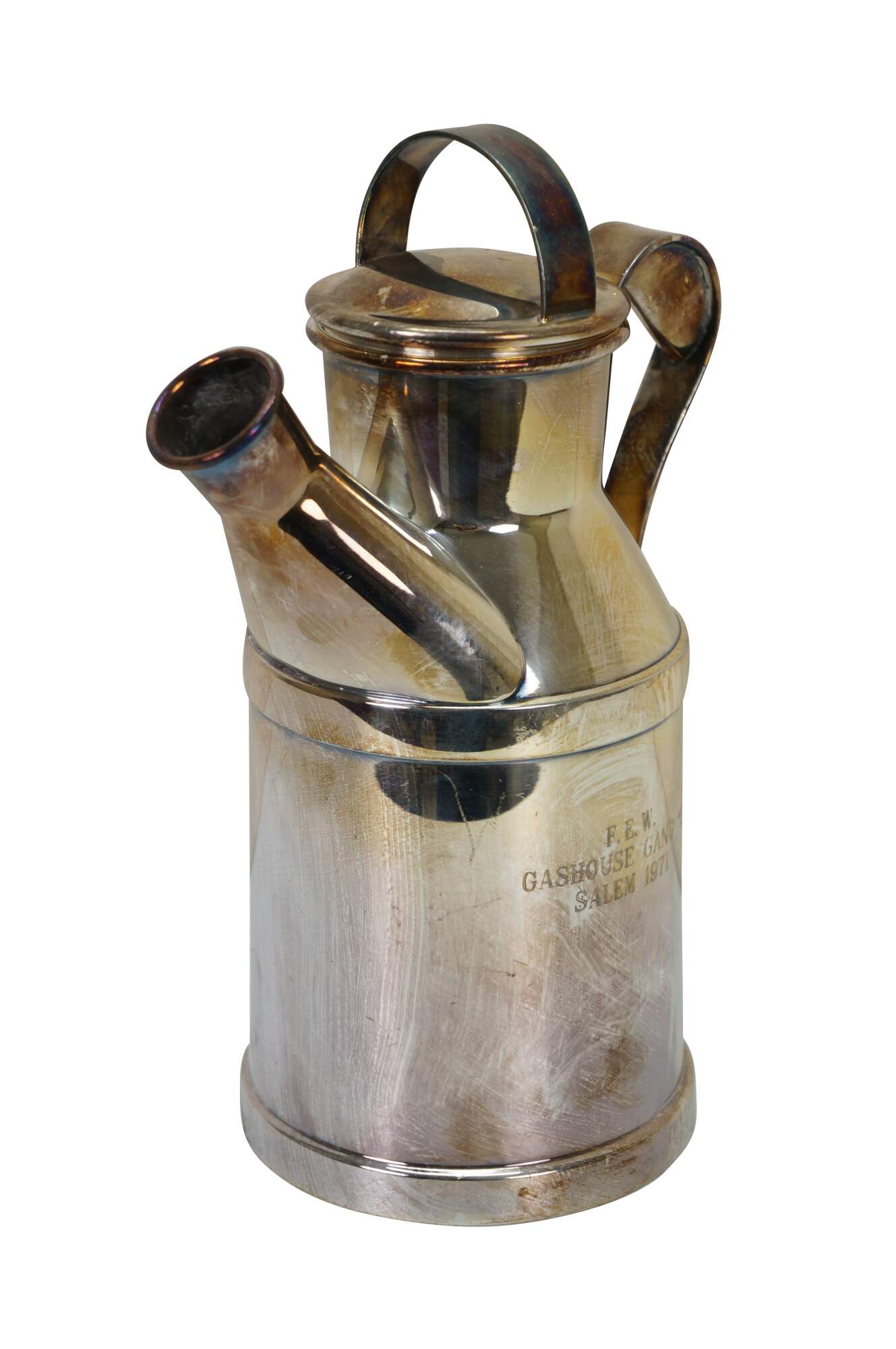 Prohibition era Reed & Barton, number 25, 64 oz silverplated milk can shaped cocktail shaker / pitcher. Trophy engraving "F.E.W. Gashouse Gang #2 Salem 1971." - presumably a club from the Salem Avenue area in Dayton Ohio.