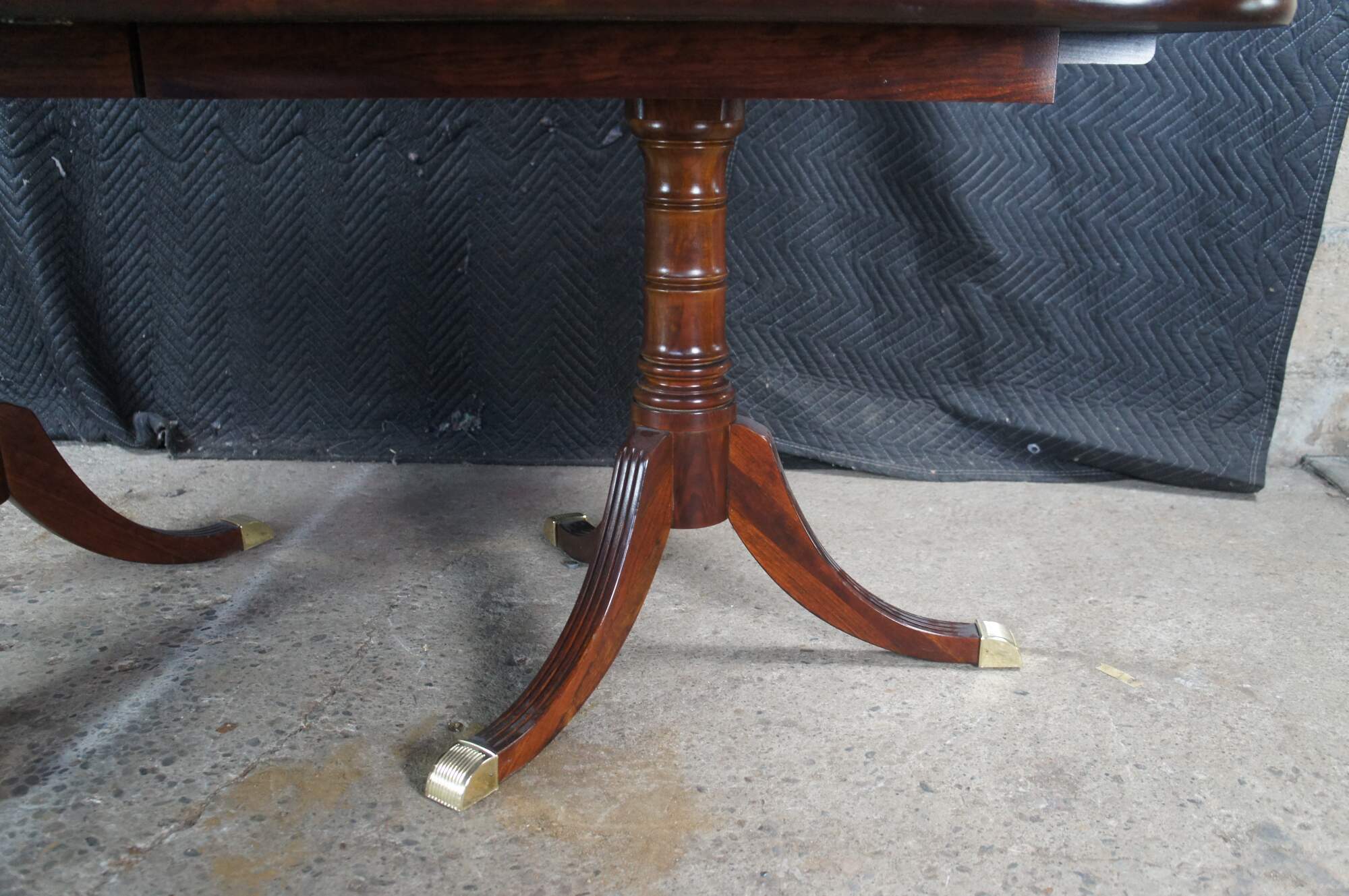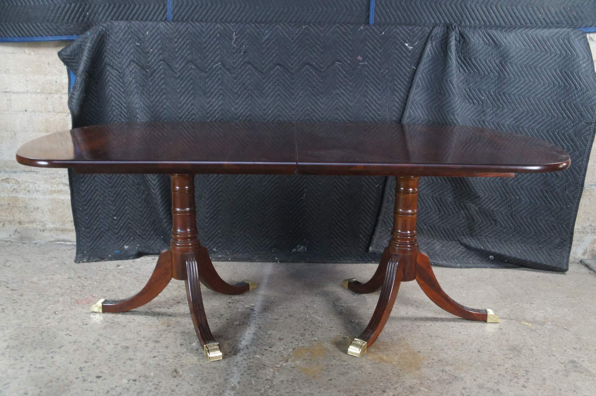 A stately solid cherry dining table by Williams Sonoma Home. Features a English Regency styling with a cherry top over ribbed double pedestals with downswept saber legs and brass capped feet. Includes three leaves for extension.