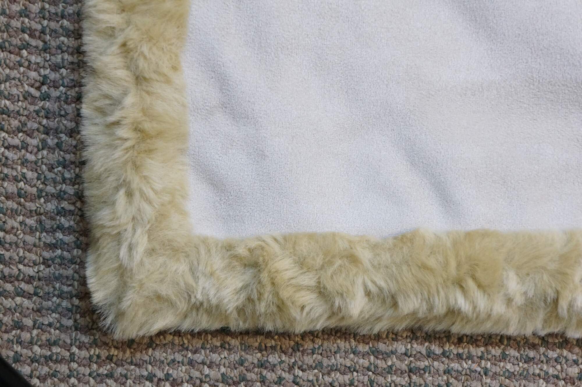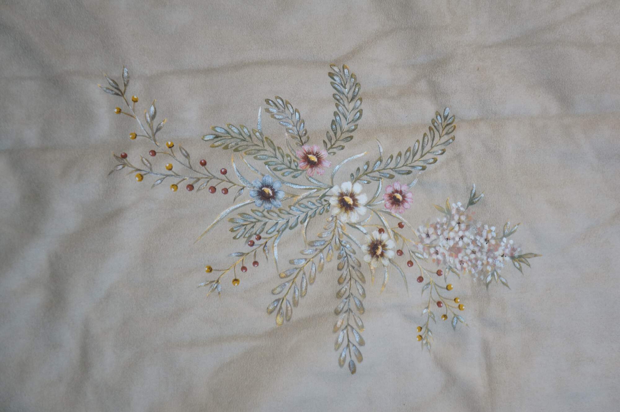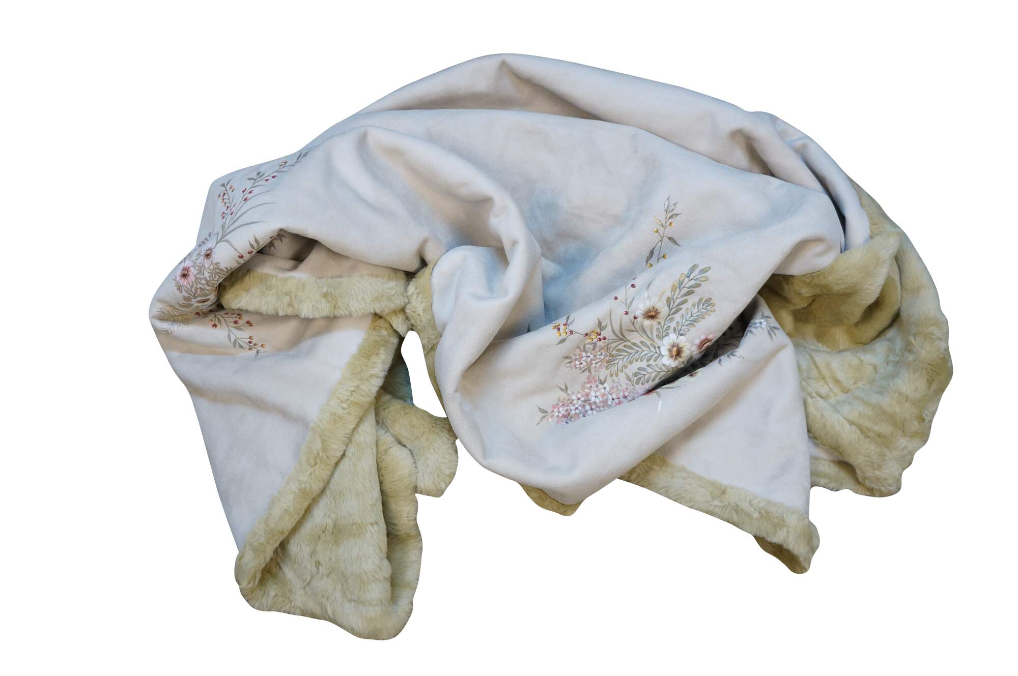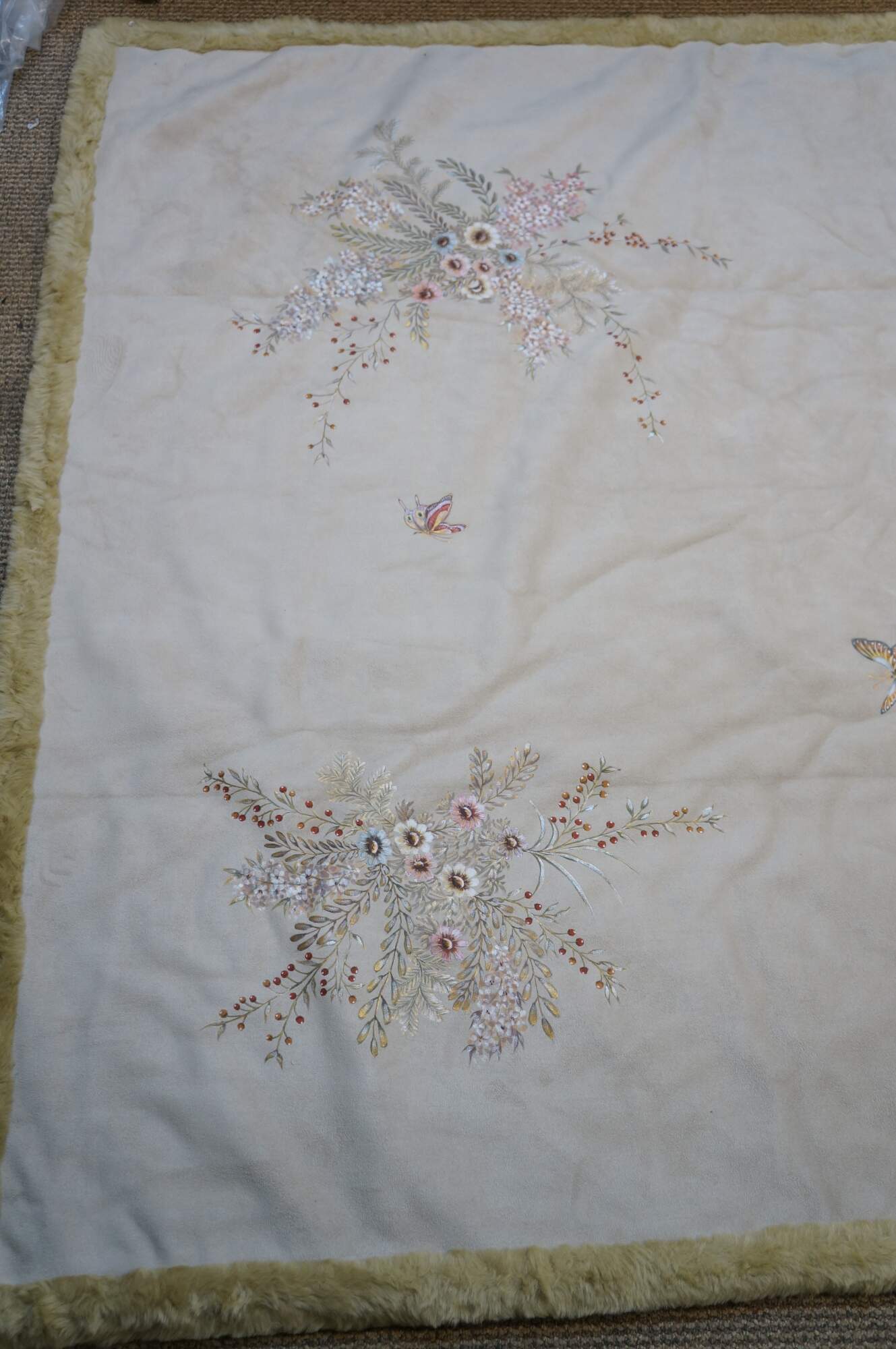 6 Available - Luxurious double sided faux fur and suede throw blanket, golden in color, hand painted with sprigs of flowers and butterflies.