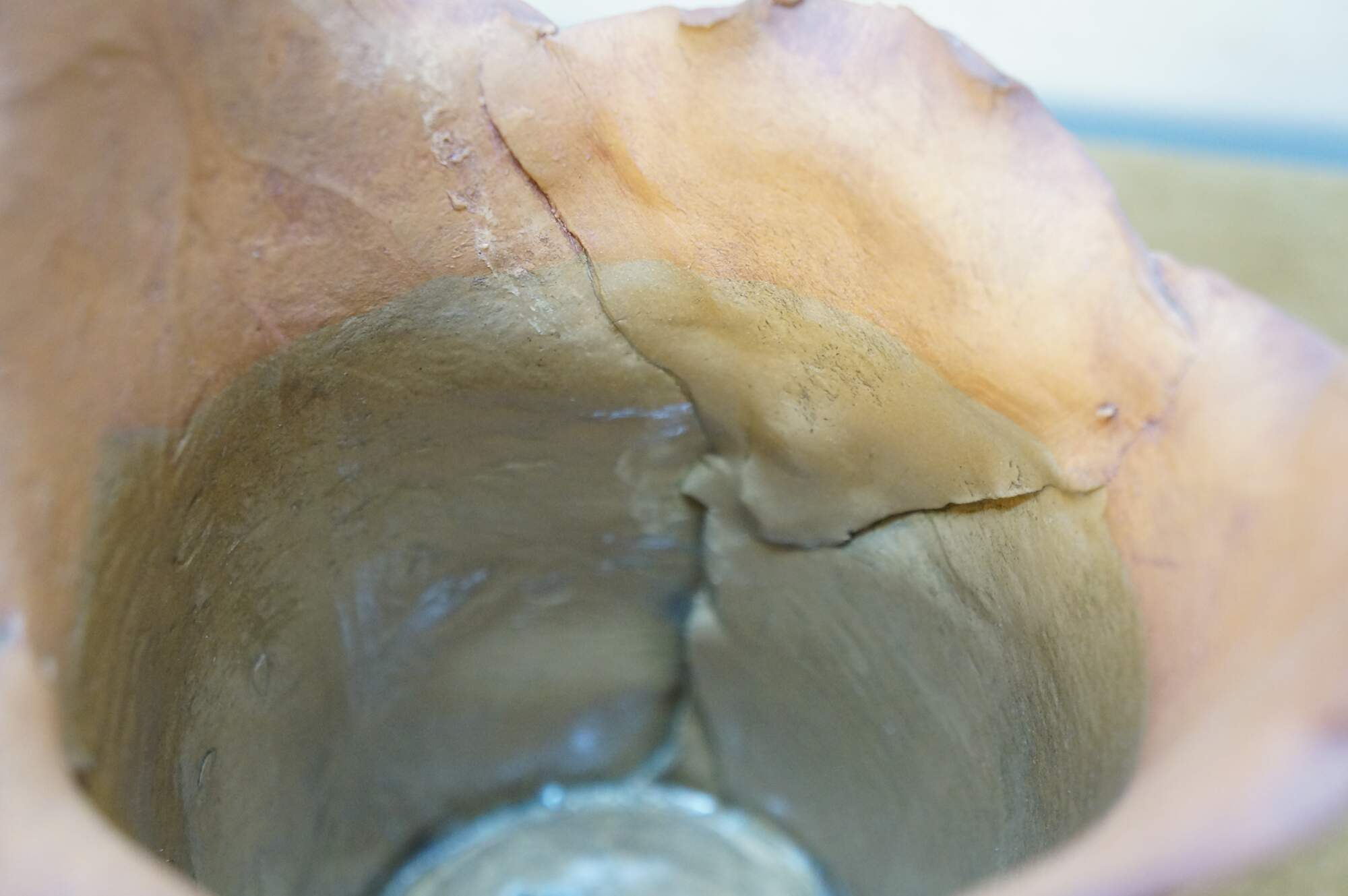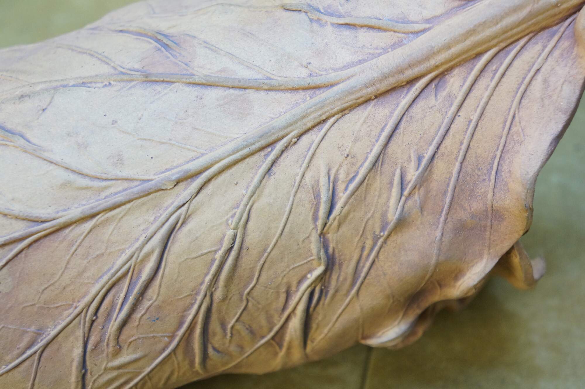 Vintage late 20th century brown unglazed ceramic vase - cylindrical form fashioned out of realistic looking leaves. Interior glazed for use as vase. Hand made by David Heger, NY, NY.