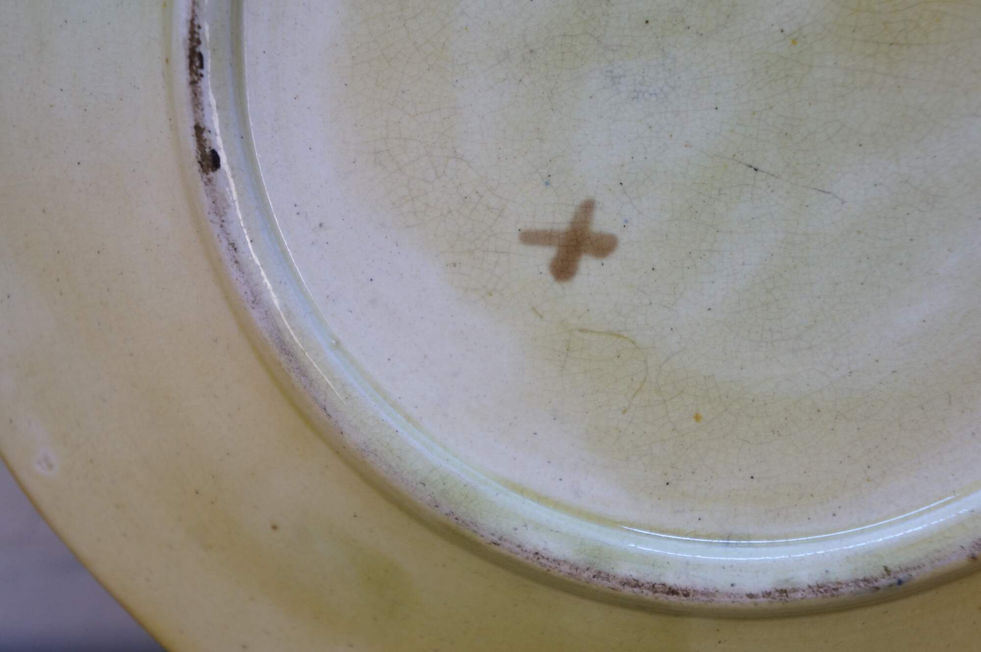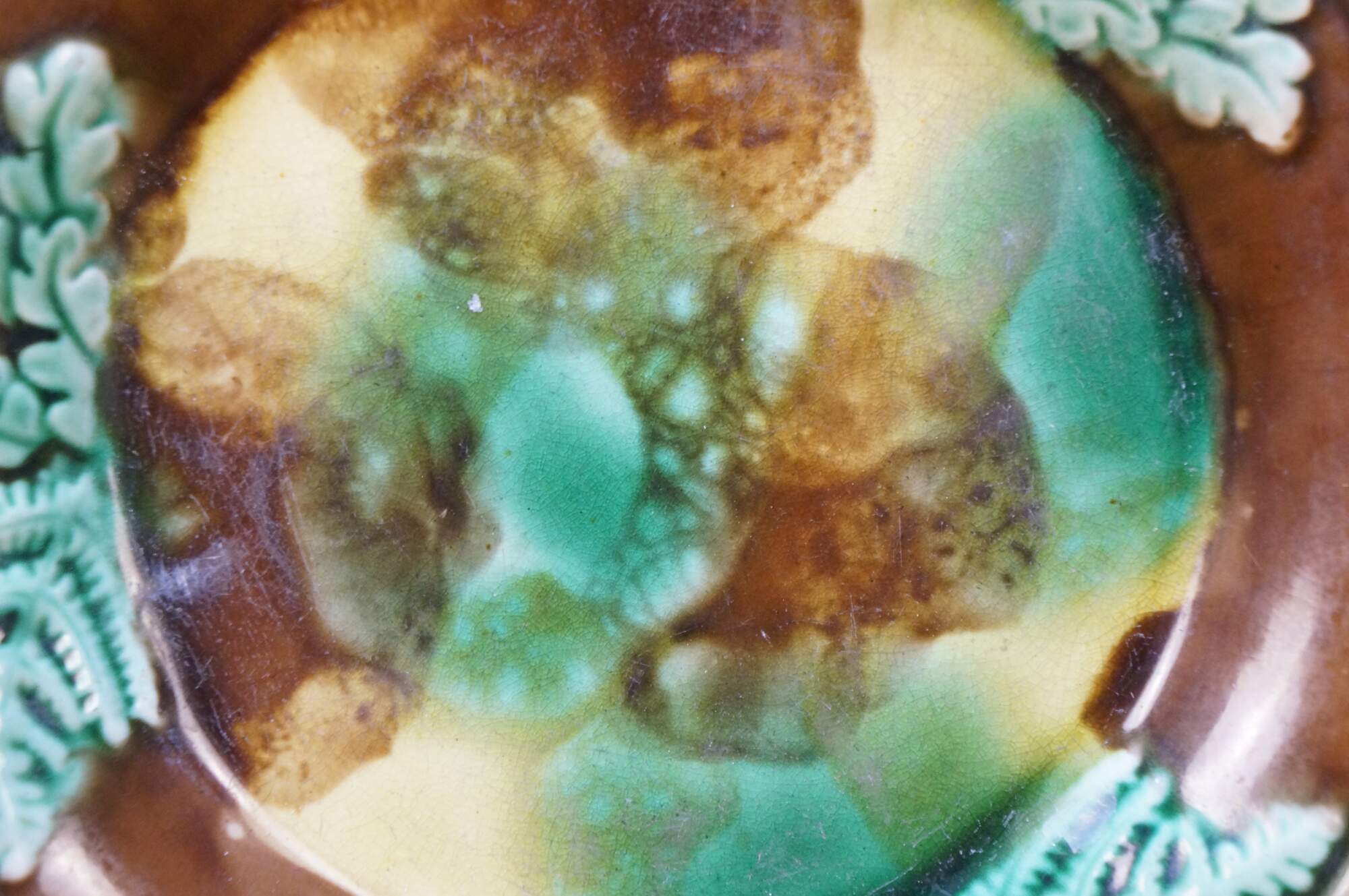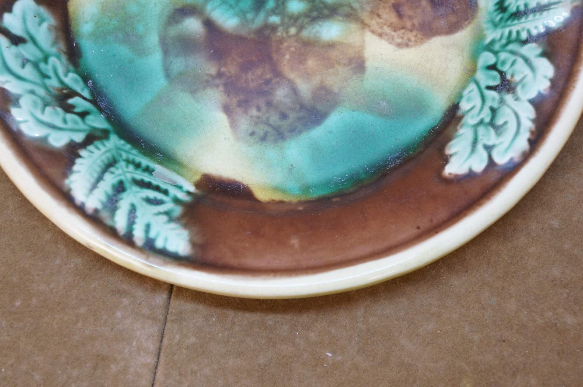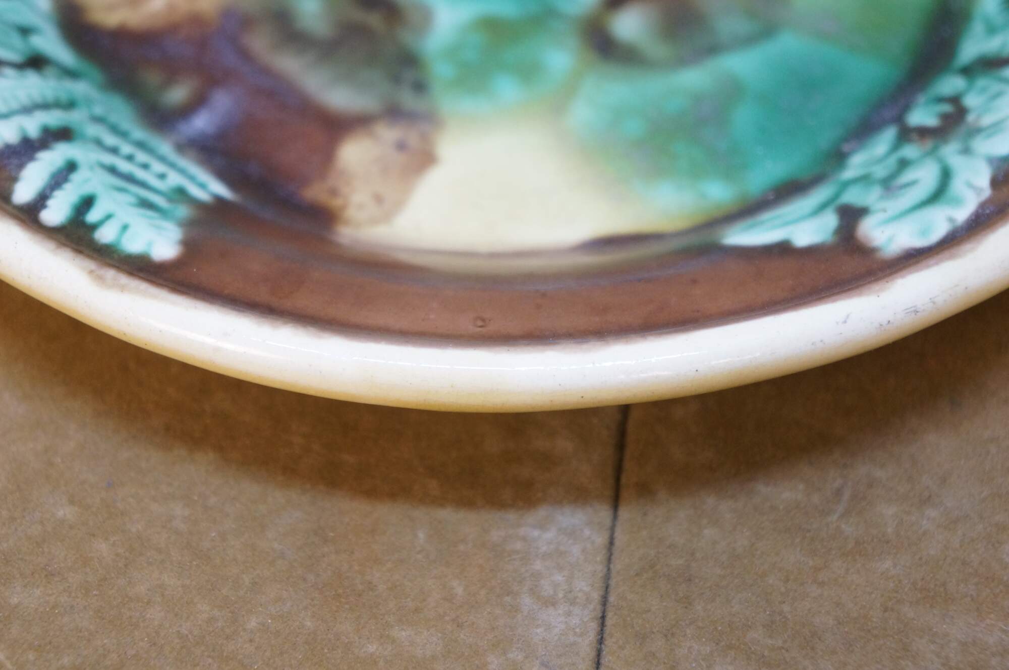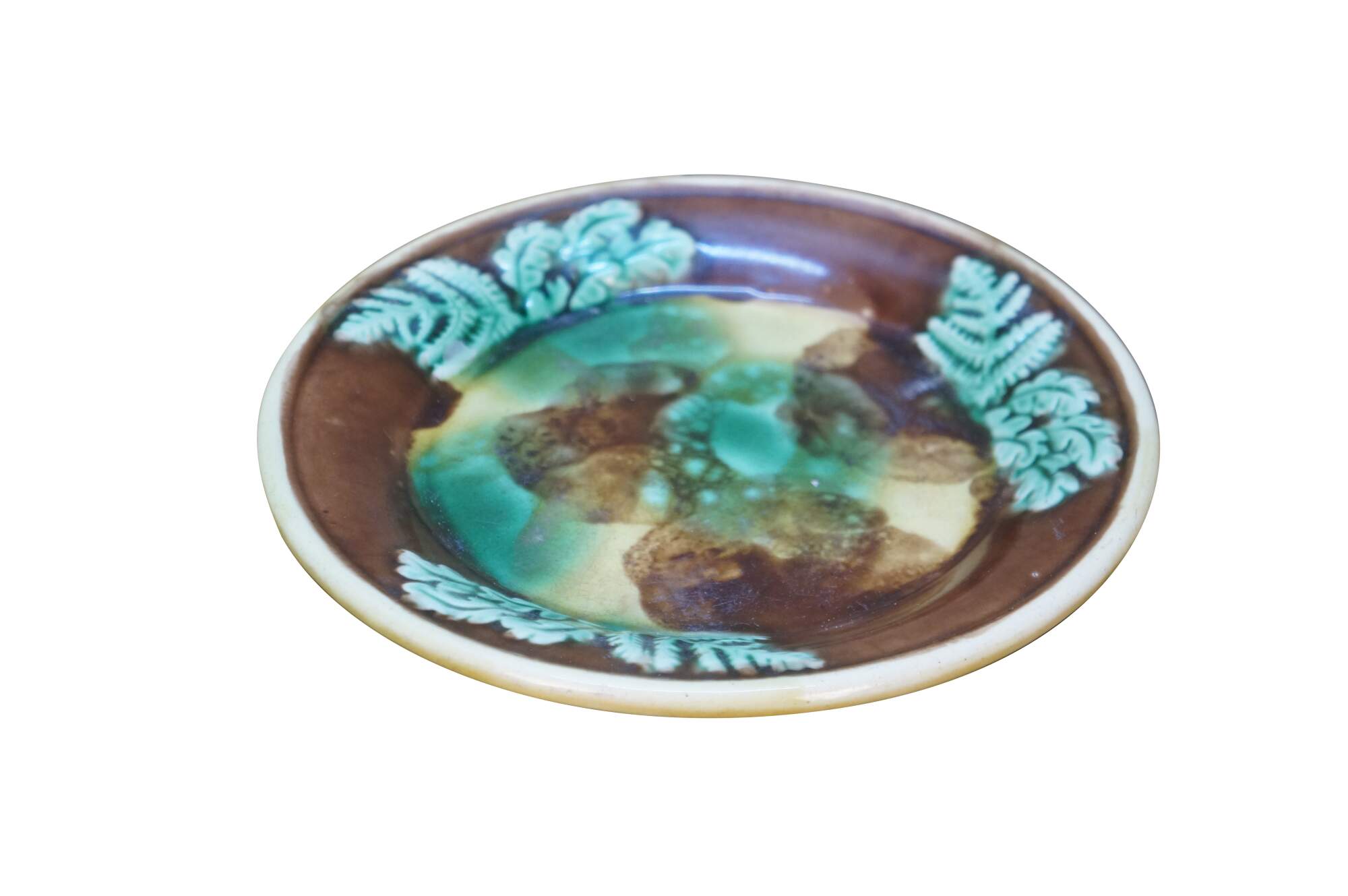 Antique majolica pottery plate, glazed in mottled brown, yellow and green, trimmed with clusters of ferns and leaves. Attributed to Banks and Thorley.