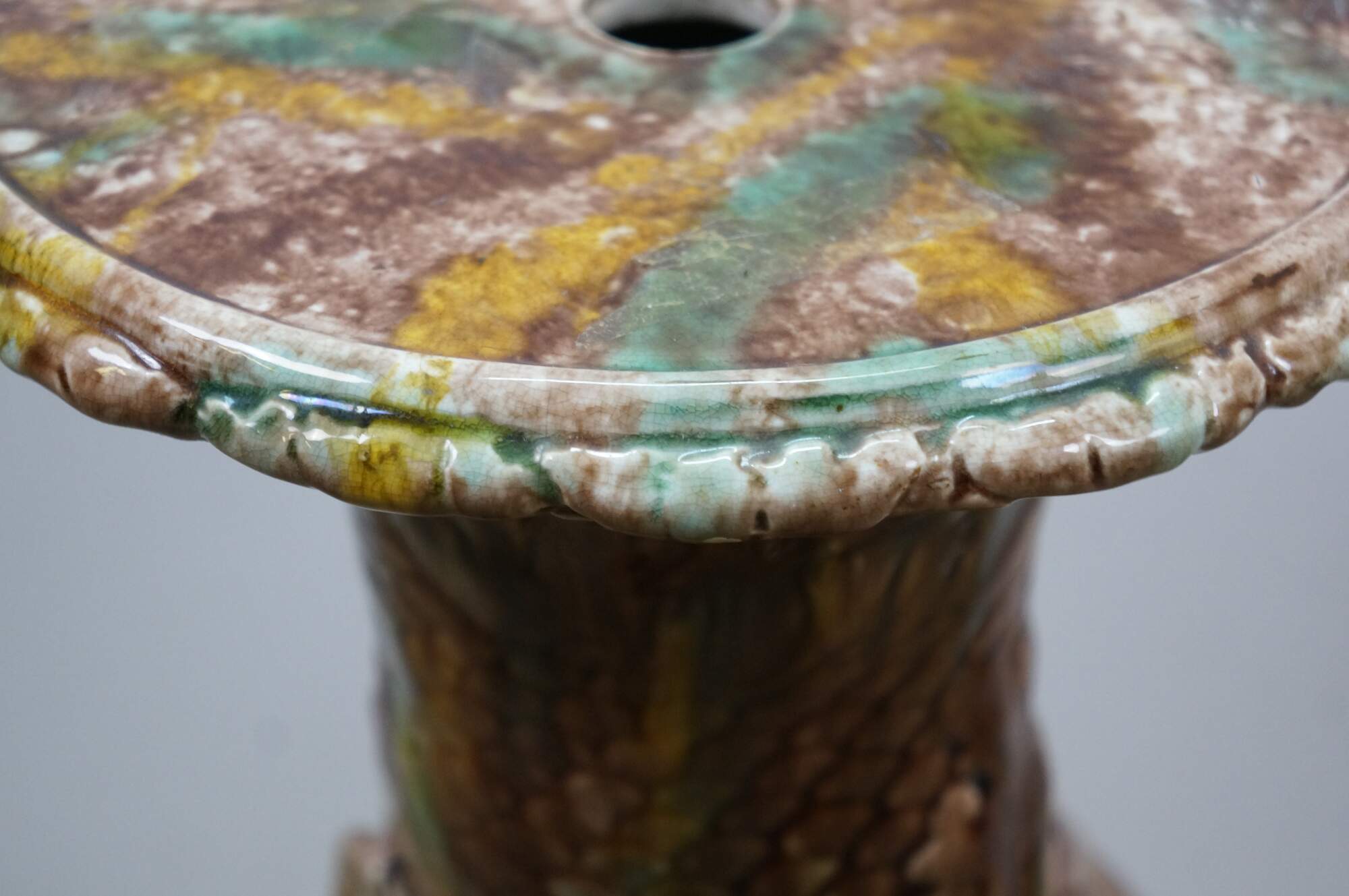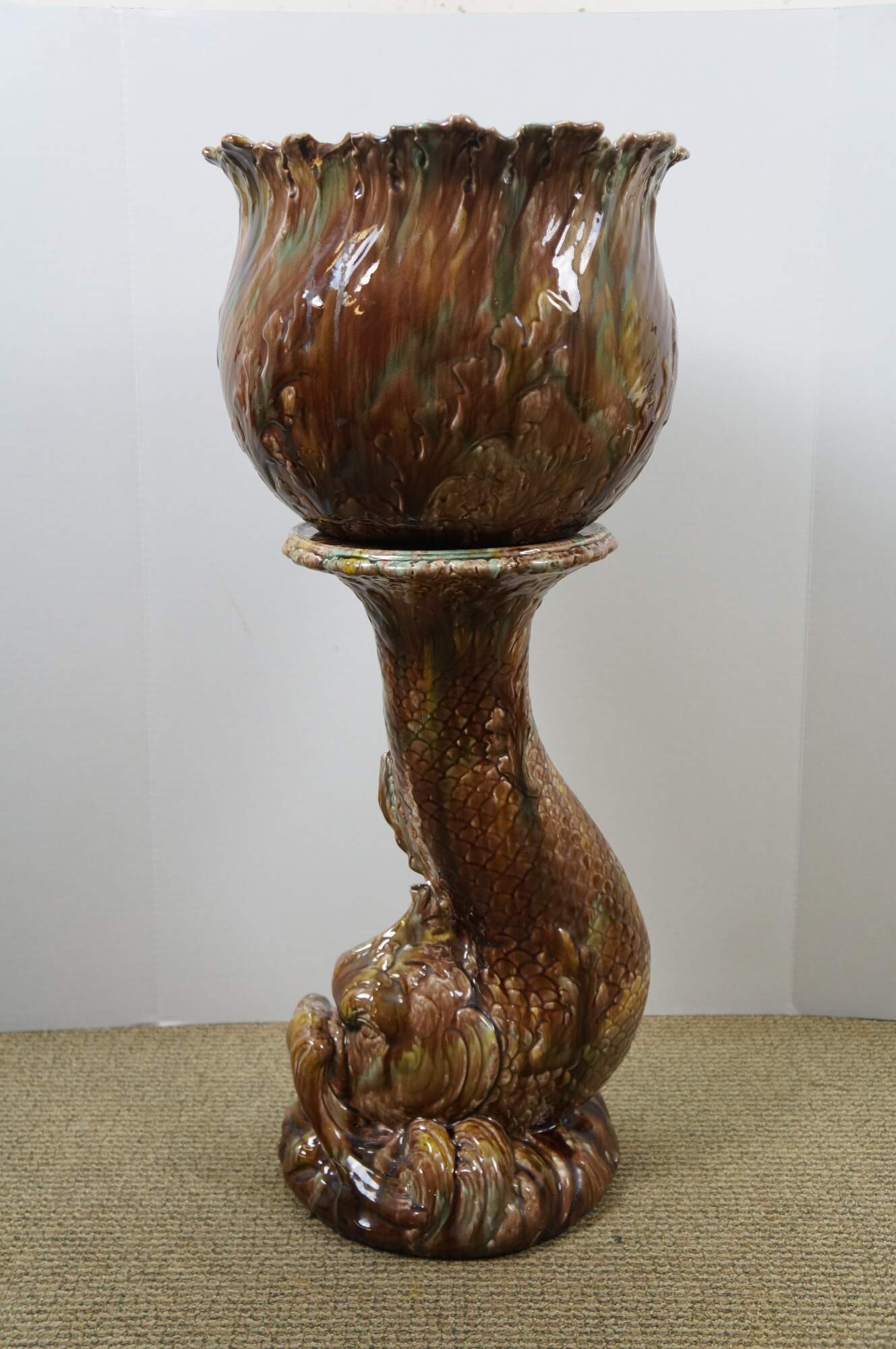 Late 19th to early 20th century majolica delphin garden planter by Wannopee Pottery Company. Pedestal in the shape of a classical delphin / dolphin, topped with a round leaf pattern planter / urn with scalloped upper edge. Brown and green mottled glaze. Incised mark on base of bowl.